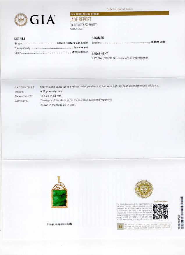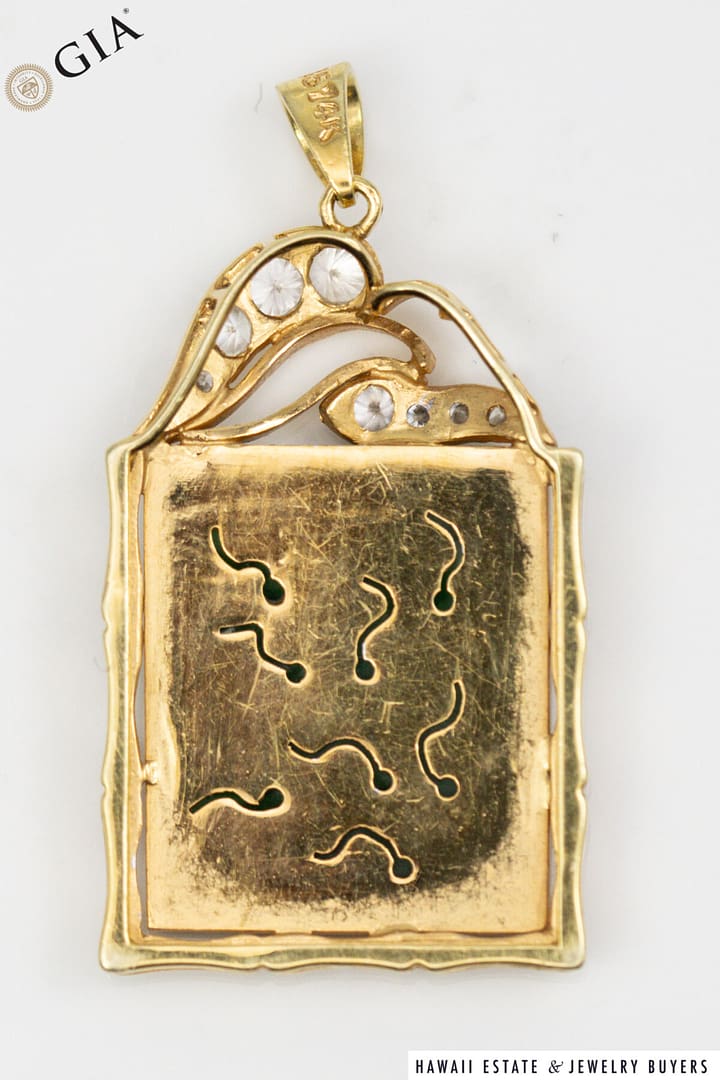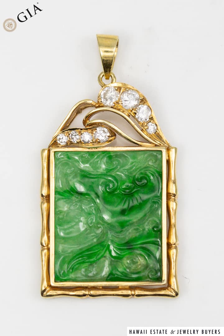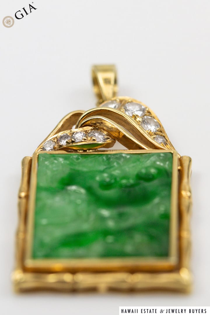 DescriptionGIA 6.2g 14KYG CARVED JADE TABLET 0.25ctw DIAMOND PENDANTPendant measures approx. 35 x 18mm. Diamonds are VS/GH clarity/color. $3,600.001 in stockGIA 6.2g 14KYG CARVED JADE TABLET 0.25ctw DIAMOND PENDANT quantityAdd to cartMake OfferSKU: BH040822-01Categories: Pre-owned Diamond Jewelry, Pre-owned Jade JewelryTags: 14k yellow gold, diamonds, GIA JADE, green jade, PENDANTRelated StylesBEN BRIDGE 14K YELLOW GOLD WHITE GOLD TWO TONE TENNIS BRACELET & EARRINGS W/ BOX$3,000.00SKY BLUE TOPAZ & DIAMOND 18K WHITE GOLD EARRINGS & PENDANT SET$1,850.00GIA CERTIFIED 4.4g 18K TWO TONE 4.71ct CUSHION CUT PINK-PURPLE SAPPHIRE 0.45ctw DIAMOND RING SIZE 5$25,000.00Antique 1920’s European Cut Diamond 8.62ctw Platinum Bracelet$20,000.00