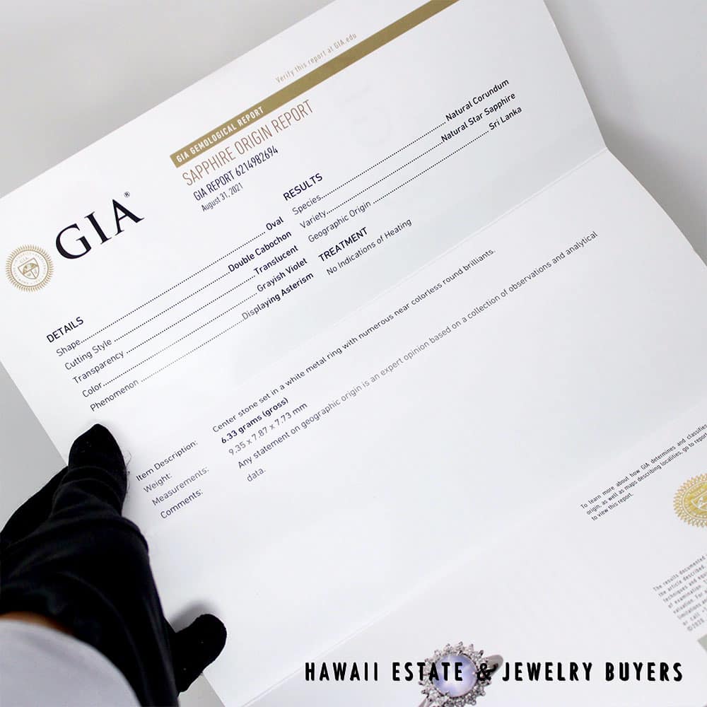 DescriptionGIA #6214982694 – No indications of Heating. Sri Lanka.GIA 6.3g PLAT 6ct GRAYISH VIOLET STAR SAPPHIRE 0.50ctw DIAMOND RING SIZE 5.5 (2652-01) $6,500.00Out of stockSKU: 2652-01Category: GIARelated StylesGIA Grade A Jadeite Jade Heart Shield Diamond 18K White Gold Pendant w/ Chain$1,900.00GIA Jadeite Jade Pale Green Carved 18K Yellow Gold Pendant$2,500.00GIA Grade A Jadeite Jade Green Marquise 0.45CTW Diamond 14K Yellow Gold Ring$1,900.00GIA Jadeite Jade Moss in Snow Carved Four Disciple 14k Yellow Gold Large Pendant$3,800.00