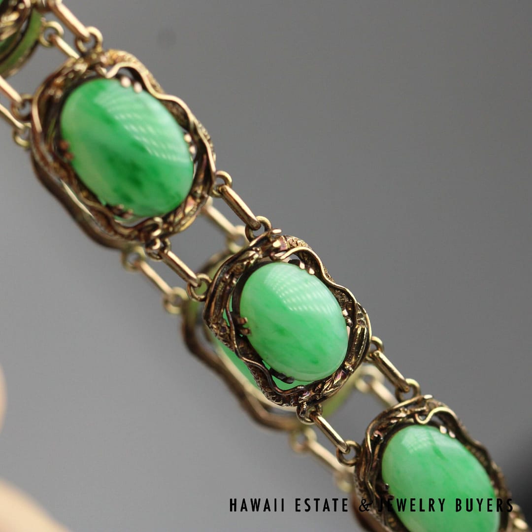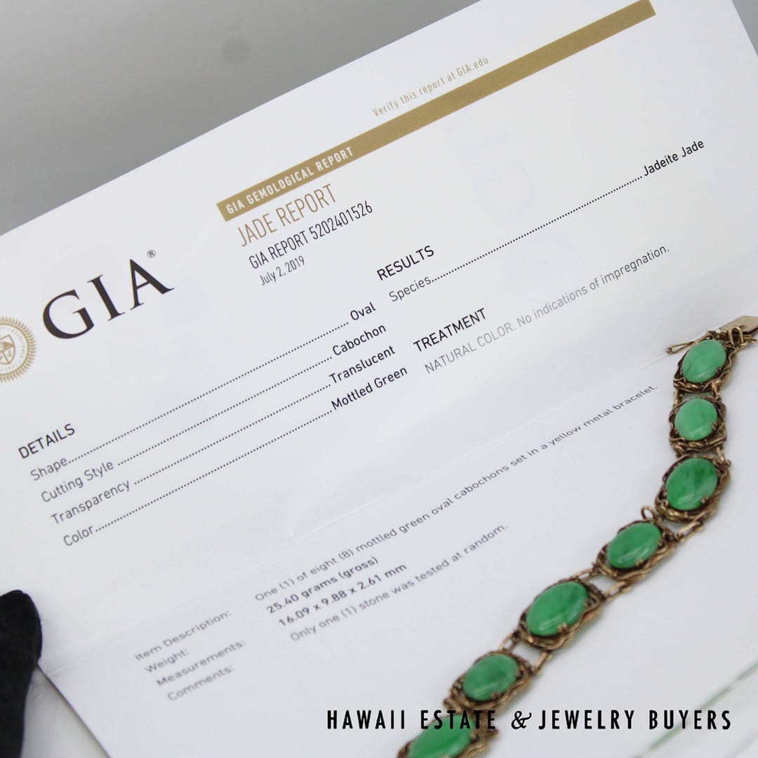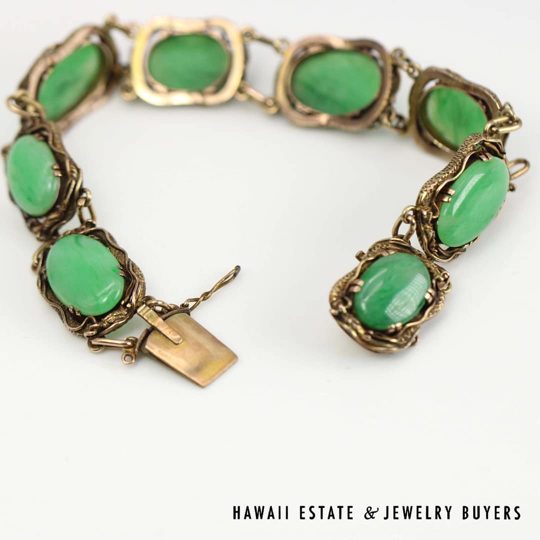 DescriptionGIA Report No 5202401526 NATURAL COLOR. No indications of impgregnation.CIRCA 1910 Jades measure 13x10mm, bracelet is 13mm widthGIA ANTIQUE 25.4g 9KYG GREEN JADE DRAGON LINK BRACELET SIZE 7.5 (2204-01) $11,000.001 in stockGIA Antique Green Jade Dragon 25.4g 9KYG Link Bracelet Size 7.5 quantityAdd to cartBuy withMake OfferSKU: 2204-01Category: GIARelated StylesGIA Jadeite Jade Pale Green Carved 18K Yellow Gold Pendant$2,500.00GIA Jadeite Jade Moss in Snow Carved Four Disciple 14k Yellow Gold Large Pendant$3,800.00GIA Natural Grade A Green Jadite Jade and 2ctw Diamond 18K Gold Ring Size 6.5$6,500.00GIA Grade A Jadeite Jade Green Carved 2 Gourds 14k Yellow Gold Pendant$6,200.00