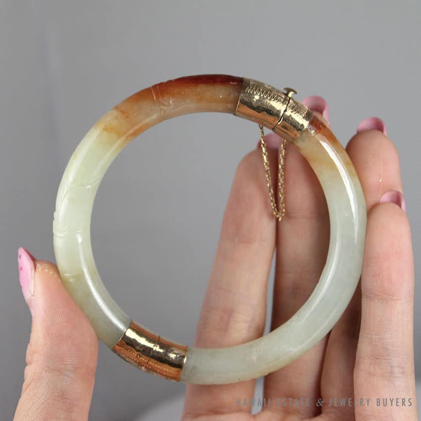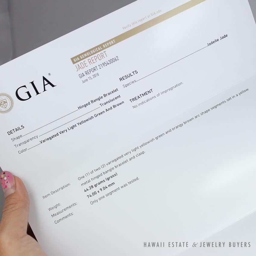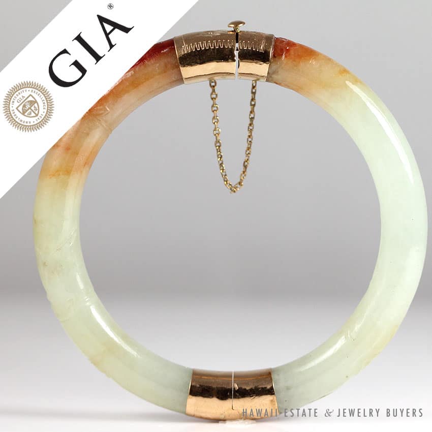 DescriptionSTAMPED: 14K 585; approx 7″ inside circumference; Jade has a lovely carved design.Please refer to incldued GIA report No. 2195430062No indications of impregnation. $3,600.001 in stockGIA CERTIFIED GRADE A TYPE A JADEITE JADE GREEN BROWN 14K YELLOW GOLD BANGLE BRACELET quantityAdd to cartMake OfferSKU: 2061-01Category: Pre-owned Vintage JewelryRelated StylesEstate Large 18mm South Sea Pearl Necklace$18,000.00Vintage Fire Opal & Diamond 18K Ring$7,000.00Certified Nephrite Jade White Hollow Cylinder$3,700.0022.8g 18KWG TYPE A IMPERIAL JADE BUDDAH HAND CARVING w/2.50ctw DIAMOND PENDANT MEASURES 58x28mm (1395-01)$13,900.00