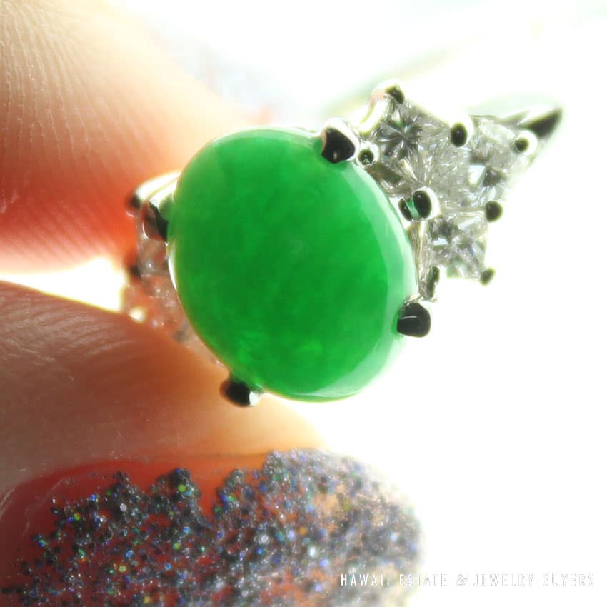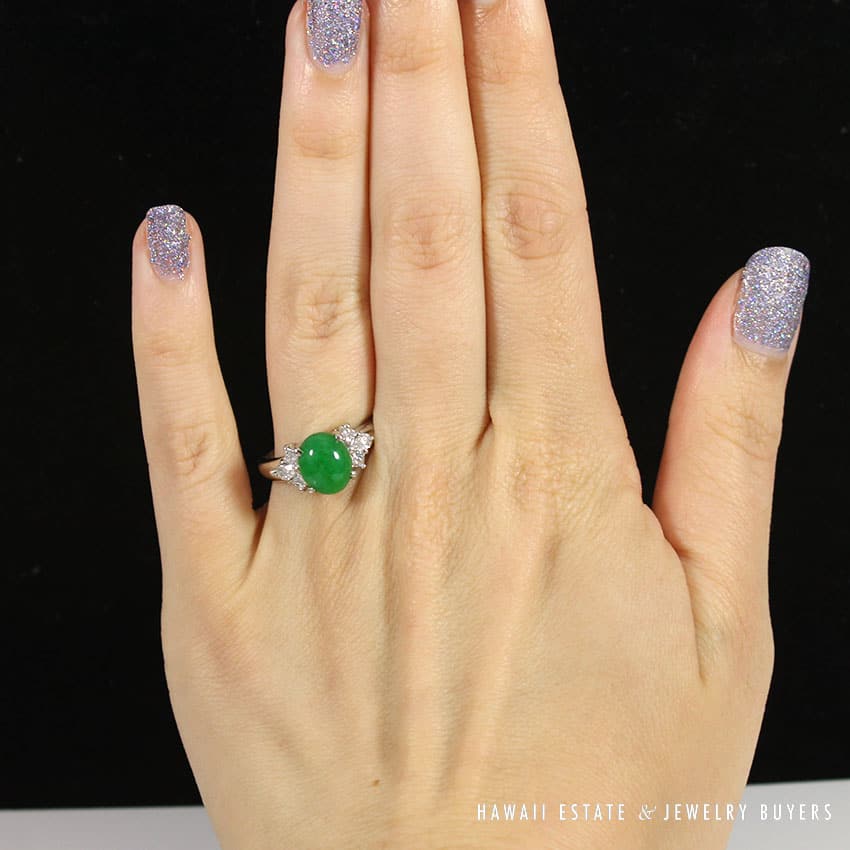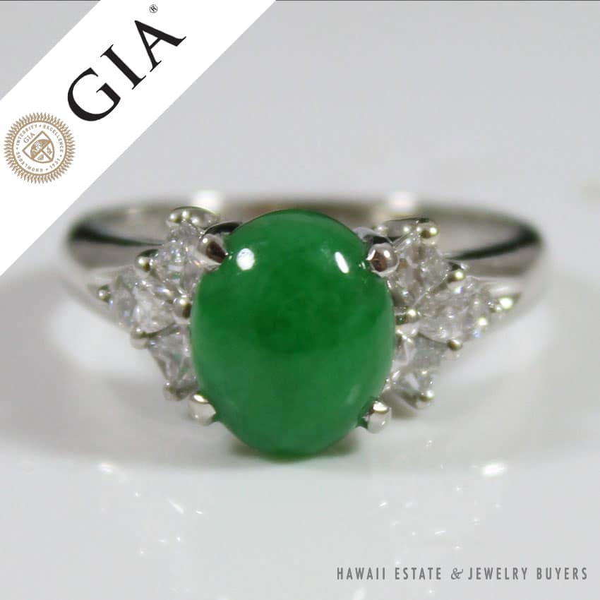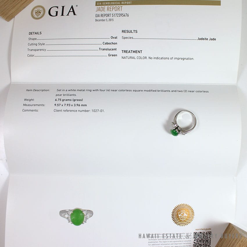 DescriptionGIA OVAL CABOCHONTRANSLUCENT GREENJADEITE JADENO INDICATIONS OF IMPREGNATION4 NEAR COLORLESS SQUARE MOD. BRILLIANTS AND 2 NEAR COLORLESS PEAR BRILLIANTSSKU: 1027-01$4,800.00Out of stockSKU: 1027-01Category: Pre-owned Vintage JewelryTags: DIAMOND, gia, gia ring, jade, jade diamond ring, jade ring, white gold, white gold ringRelated StylesGIA Grade A Nephrite Jade Twist Bangle$3,500.00Certified Grade A Natural Jade Cabochon Ring$5,800.0022.8g 18KWG TYPE A IMPERIAL JADE BUDDAH HAND CARVING w/2.50ctw DIAMOND PENDANT MEASURES 58x28mm (1395-01)$13,900.00Natural Grade A White Jade Archer Ring$3,800.00
