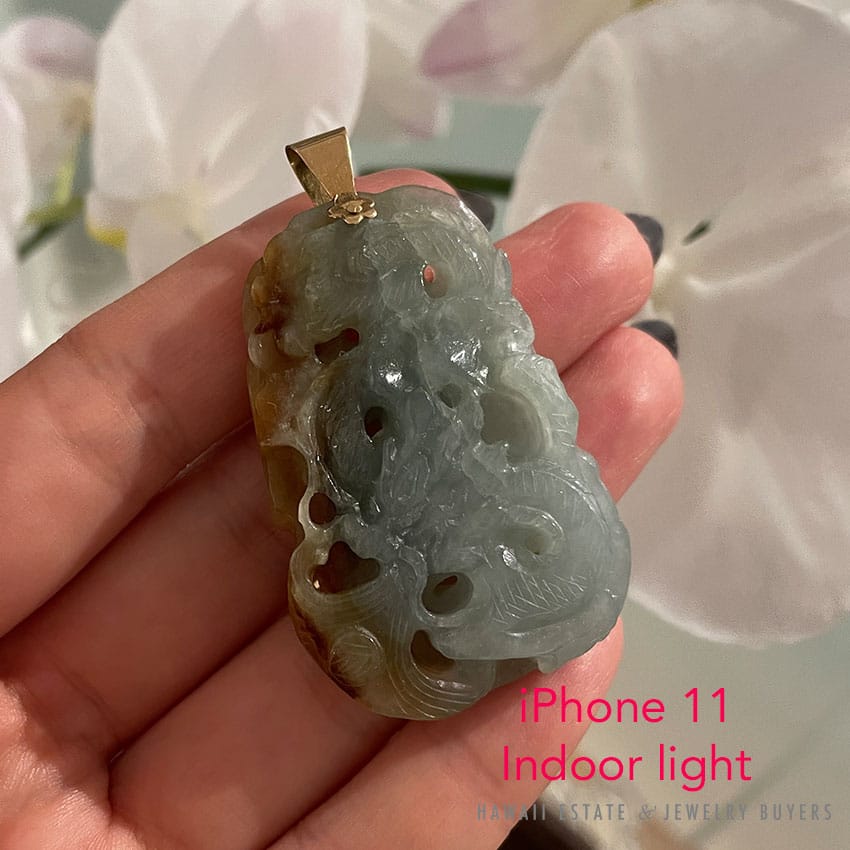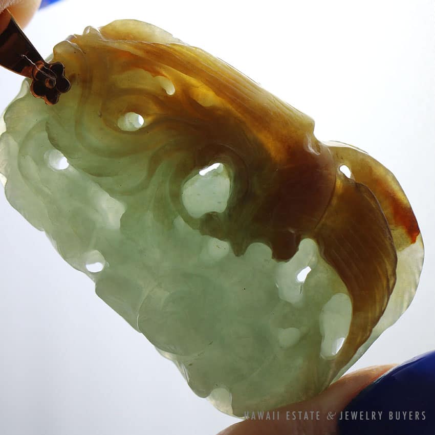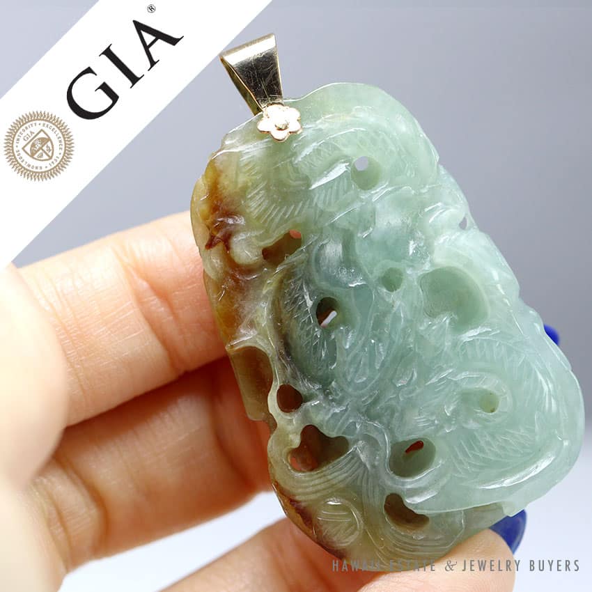 This vintage jadeite jade translucent greenish gray brown carved phoenix and dragon motif. The pendant has a yellow gold bail that is acid tested to be 14K yellow gold.