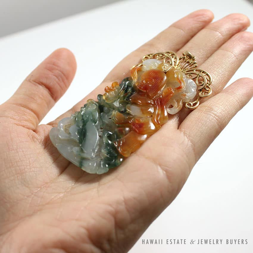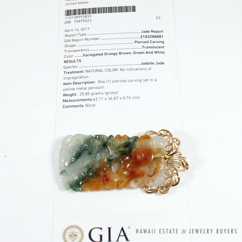 DescriptionGIA CERTIFIED – JADEITE JADENATURAL COLOR. NO INDICATIONS OF IMPREGNATION.GIA REPORT # 2183288881SKU 1990-03 $15,000.001 in stockGIA CERTIFIED MULTI-COLOR NATURAL JADEITE JADE 14K YELLOW GOLD PENDANT quantityAdd to cartMake OfferSKU: 1990-03Category: Pre-owned Vintage JewelryTags: CHINESE JADE, estate jade, gia, GIA JADE, jadeRelated StylesVintage Fire Opal & Diamond 18K Ring$7,000.00Natural Grade A Jade Cabochon Ring$8,500.00Certified Grade A Mottled Green Graduated Bead Necklace$8,000.00GIA CERTIFIED MARQUISE NATURAL JADE APPLE GREEN COLOR JADE RING GIA JADE SZ 5.25$1,000.00