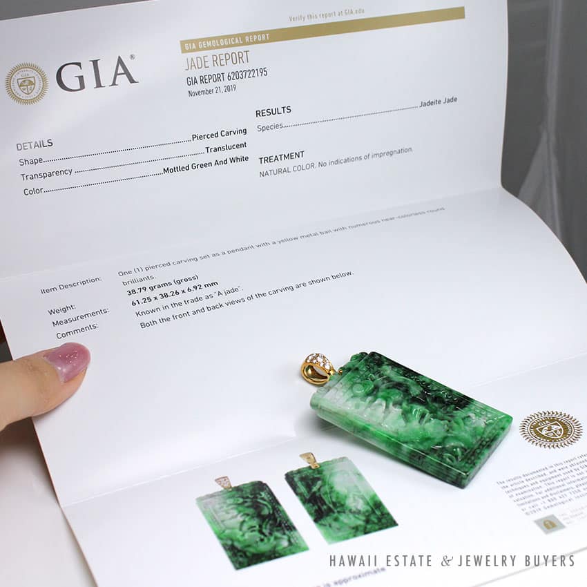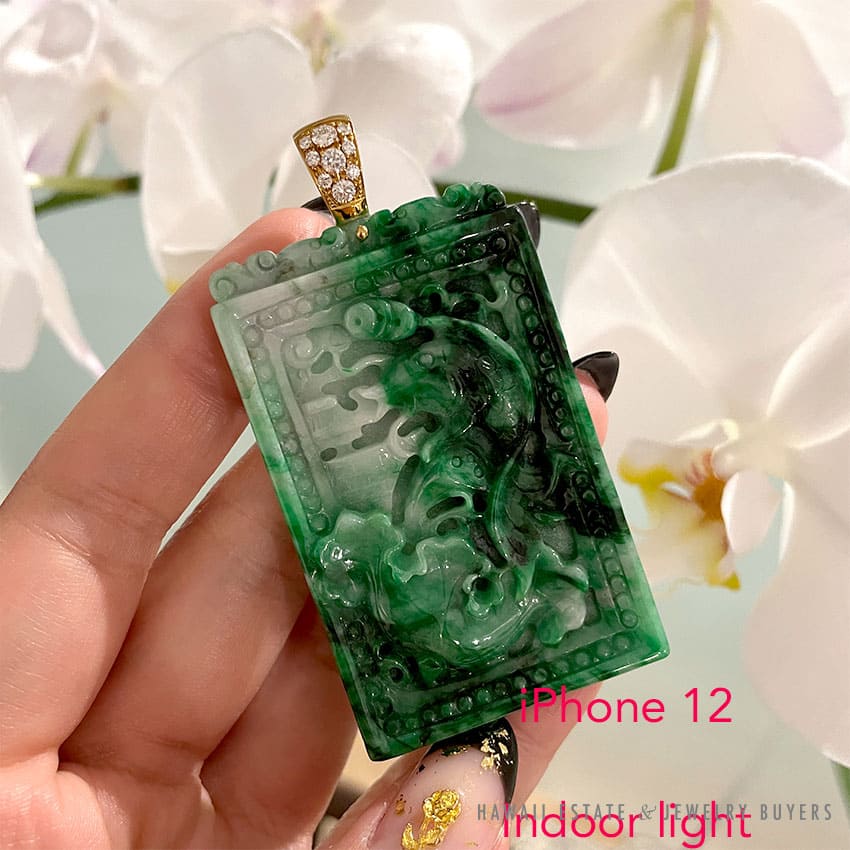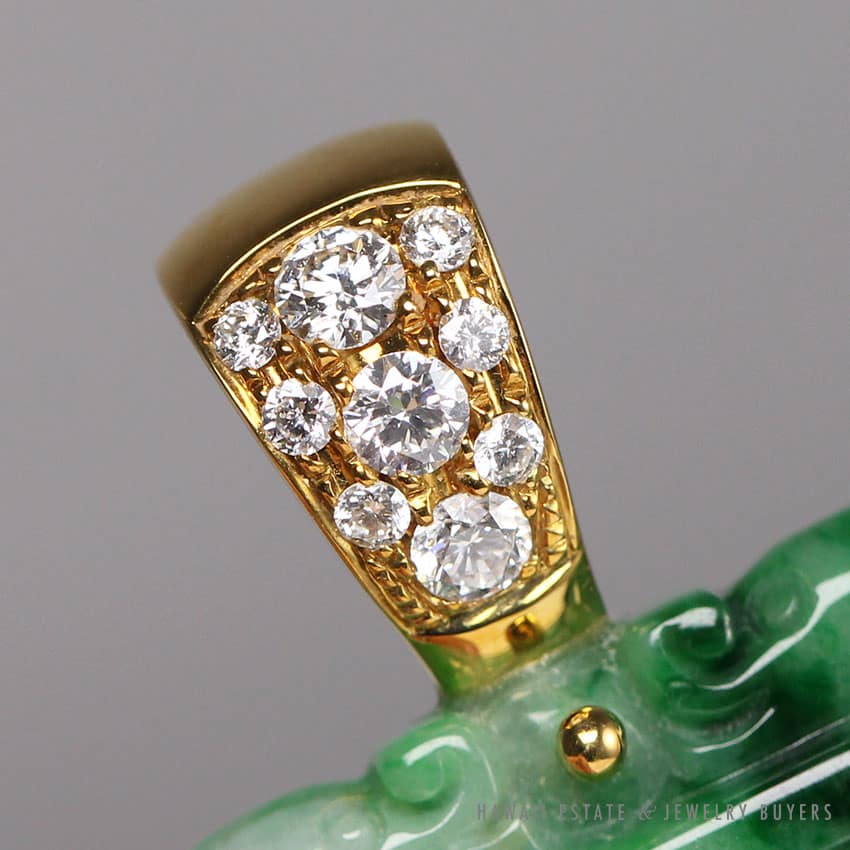 This gorgeous vintage “A jade” jadeite jade translucent mottled green and white carved pendant has Chinese fish & cabbage motif on the front and various plant with vines & clouds motif on the back. The pendant has a yellow gold bail that stamped 18K yellow gold featuring (6) 1.7mm, (2) 2.8mm, and (1) 2.9mm round brilliant diamonds totaling 0.37CTW G/H color and VS/SI clarity.