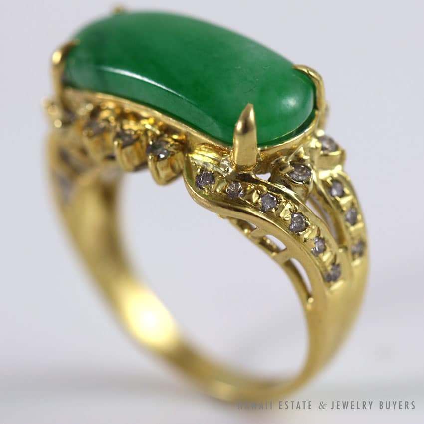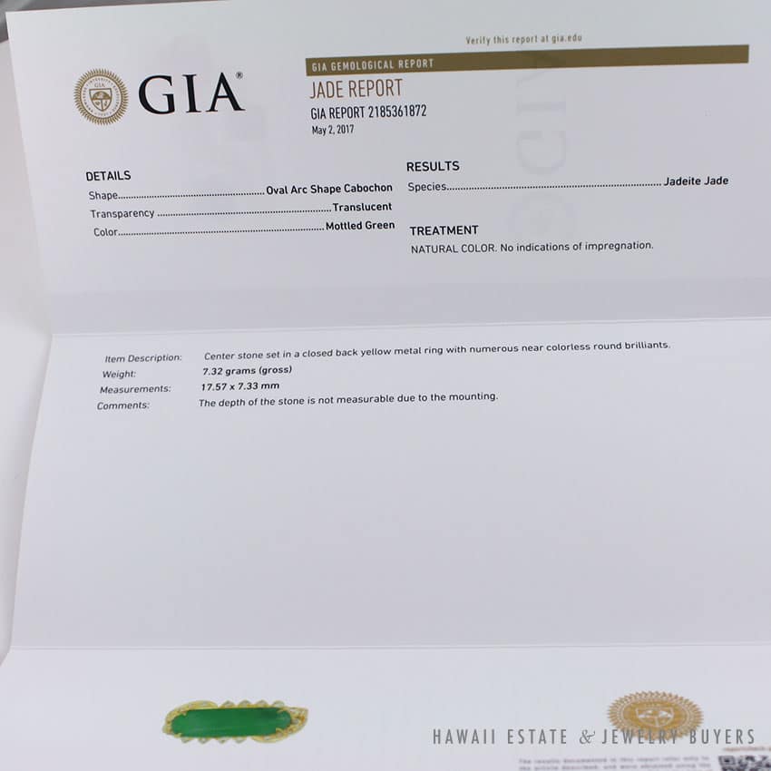 DescriptionGIA REPORT 2185361872TRANSLUCENT, MOTTLED GREEN – JADEITE JADE.“NATURAL COLOR. No indications of impregnation.”STAMPED 18K 750 SKU 1996-04$1,900.001 in stockGIA CERTIFIED NATURAL GRADE A JADEITE JADE 18K YELLOW GOLD SADDLE RING SIZE 6.5 quantityAdd to cartBuy withMake OfferSKU: 1996-04Category: Pre-owned Vintage & Jade JewelryTags: gia, gia certified jade, GIA JADERelated StylesNatural Grade A Jade Cabochon Ring$8,500.00Certified Jade White Carved Bangle Bracelet$5,300.00Antique Ceremonial Certified Nephrite Jade Flute$16,000.00Certified Twisted White Nephrite Jade Bangle$6,000.00
