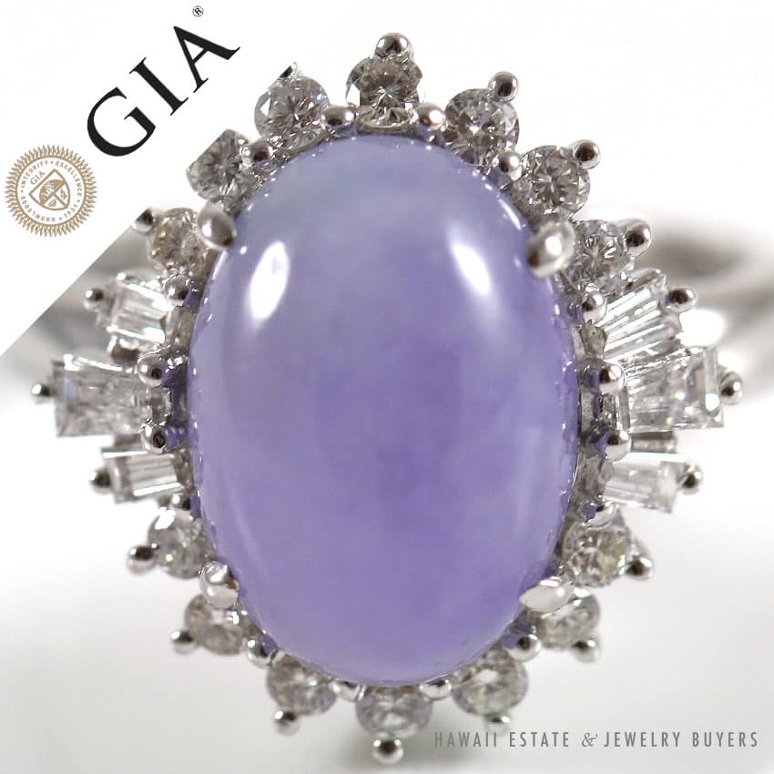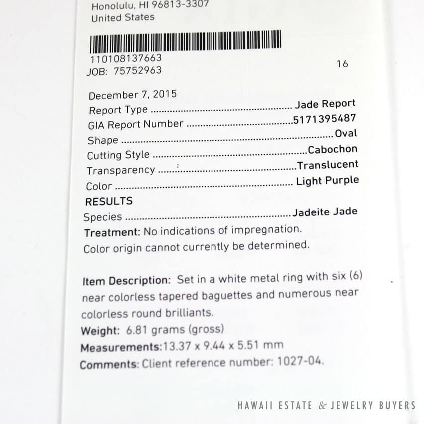 DescriptionGIA REPORT 5171395487“NO INDICATIONS OF IMPREGNATION” SKU: 1027-04$4,500.001 in stockGIA CERTIFIED NATURAL GRADE A LAVENDER JADE & DIAMOND 18K WHITE GOLD RING SZ 6.5 quantityAdd to cartBuy withMake OfferSKU: 1027-04Category: Pre-owned Vintage & Jade JewelryTag: jadeRelated StylesGIA Natural No Heat Star Sapphire Diamond Ring$3,900.00GIA Grade A Nephrite Jade Twist Bangle$3,500.00Antique Ceremonial Certified Nephrite Jade Flute$16,000.001.30ct Pear Shaped Diamond and Emerald Twin Antique Platinum Ring$20,000.00