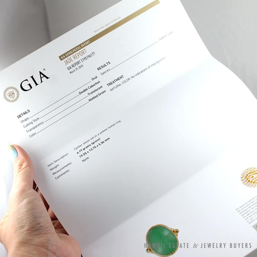 DescriptionPlease refer to included GIA appraisal –REPORT NO. 2195196177 “NATURAL COLOR. No indications of impregnation.” GRADE A JADE!Size is 6.25-6.5; tested 18k gold $4,500.001 in stockGIA CERTIFIED NATURAL JADEITE JADE GREEN GRADE 18K YELLOW GOLD RING SIZE 6.25 quantityAdd to cartMake OfferSKU: 2084-02Category: Pre-owned Vintage JewelryRelated StylesGIA CERTIFIED MARQUISE NATURAL JADE APPLE GREEN COLOR JADE RING GIA JADE SZ 5.25$1,000.00Natural Lavender Cabochon Pendant$2,300.00Certified Twisted White Nephrite Jade Bangle$6,000.0022.8g 18KWG TYPE A IMPERIAL JADE BUDDAH HAND CARVING w/2.50ctw DIAMOND PENDANT MEASURES 58x28mm (1395-01)$13,900.00