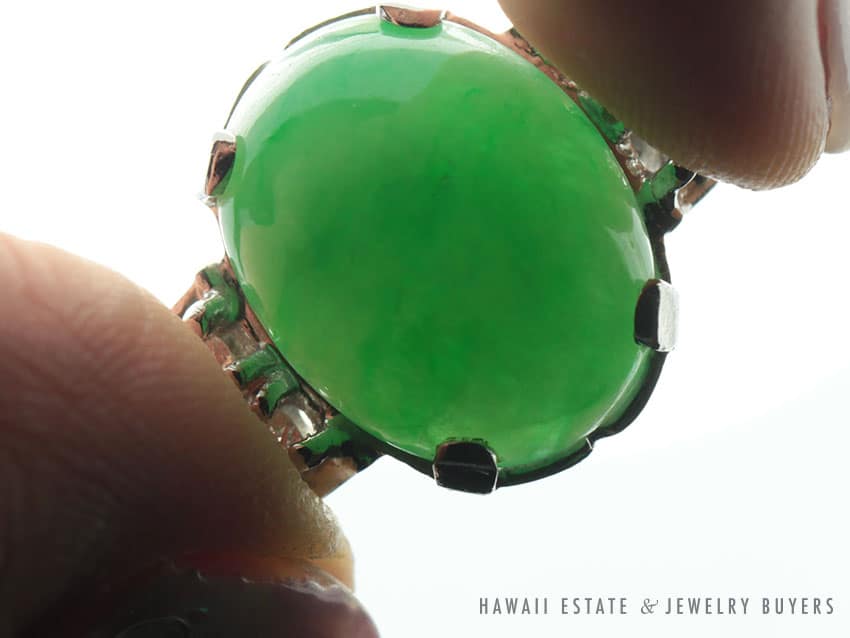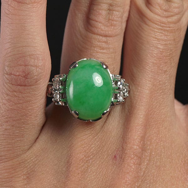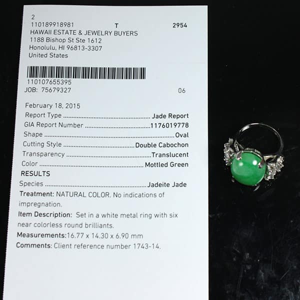The jade is set in a platinum open back setting with six near colorless round brilliant diamonds.