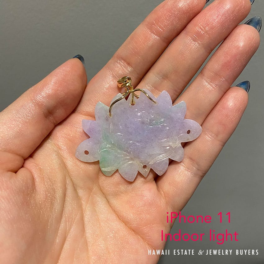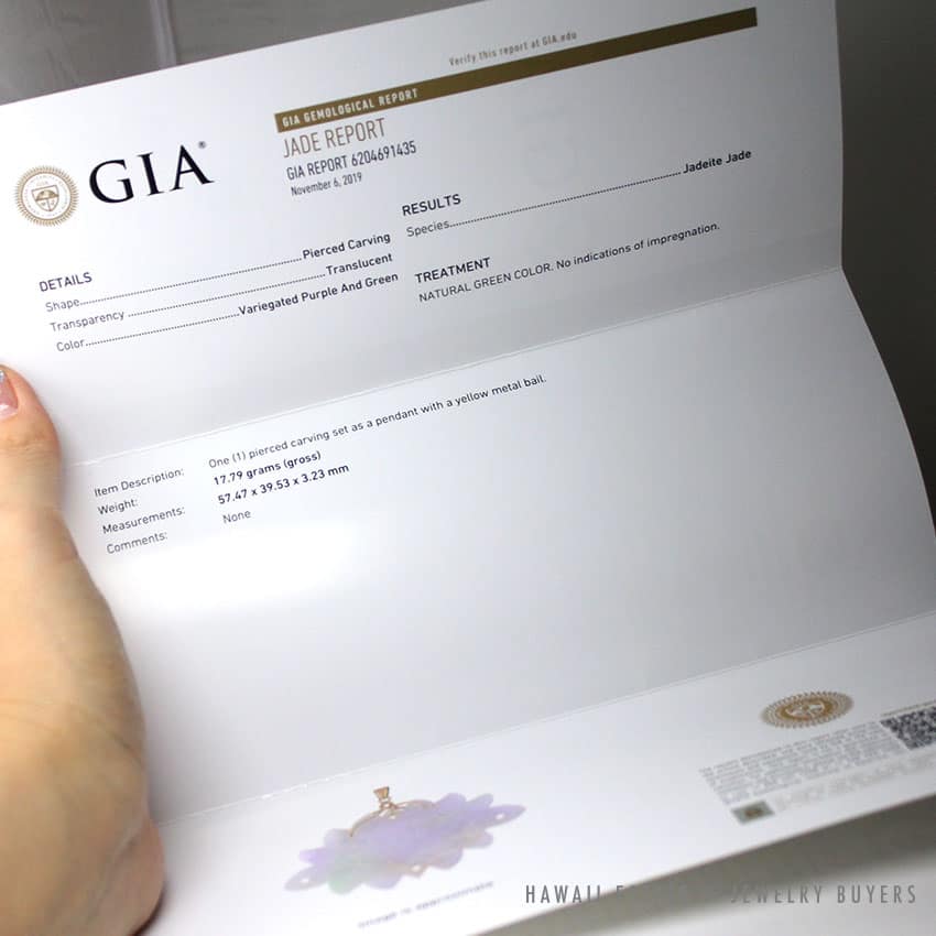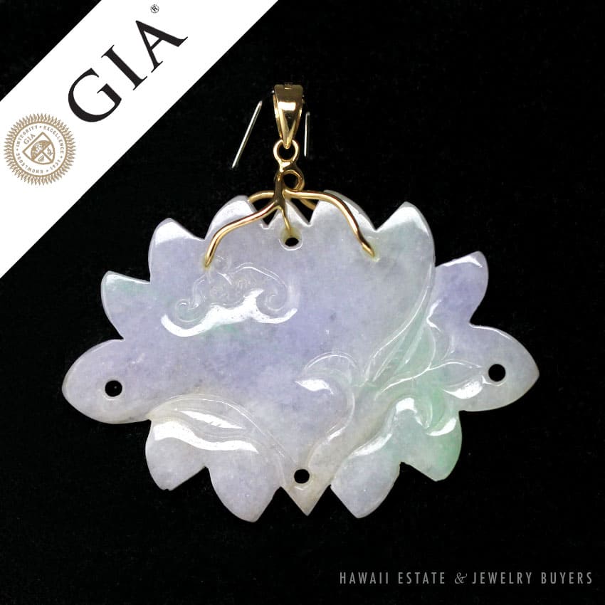 Home » Shop » GIA CERTIFIED TSL VARIEGATED PURPLE GREEN JADEITE LOTUS 14K YELLOW GOLD PENDANT
