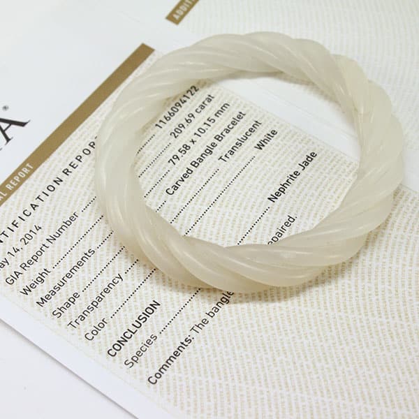 GIA Report#: 1166094122 Weight: 209.69 carat Measurements: 79.58 x 10.15mm Shape: Carved Bangle Bracelet Transparency: Translucent Color: White Species: Nephrite Jade Comments: The bangle has been repaired