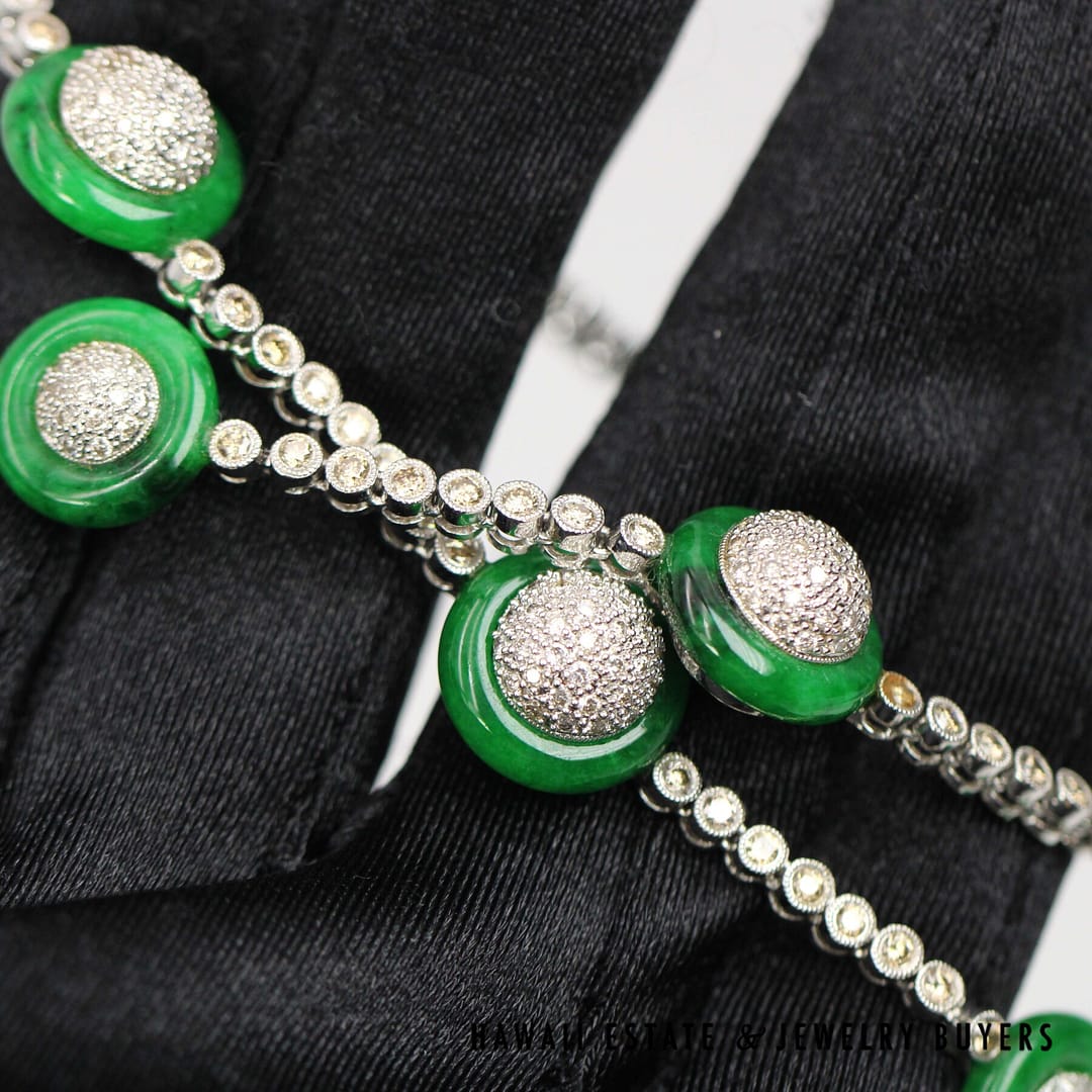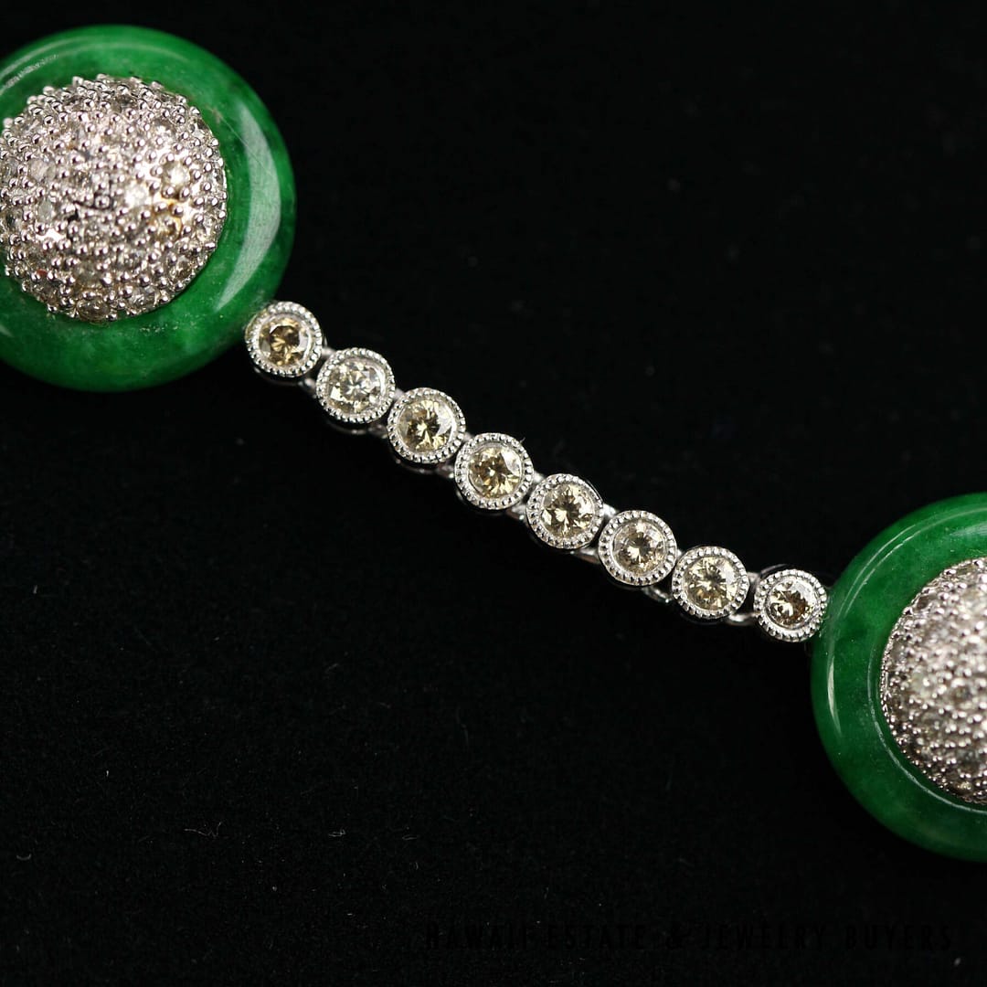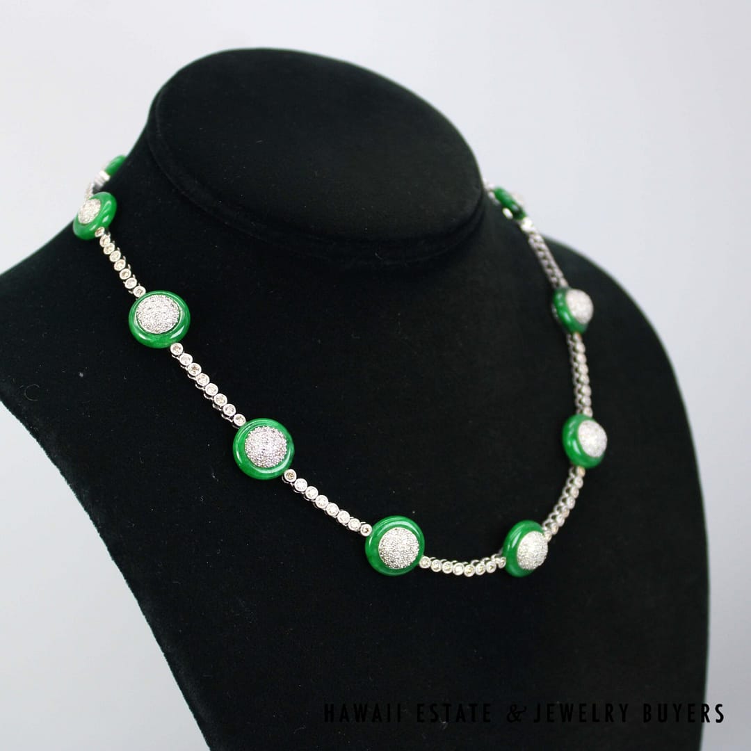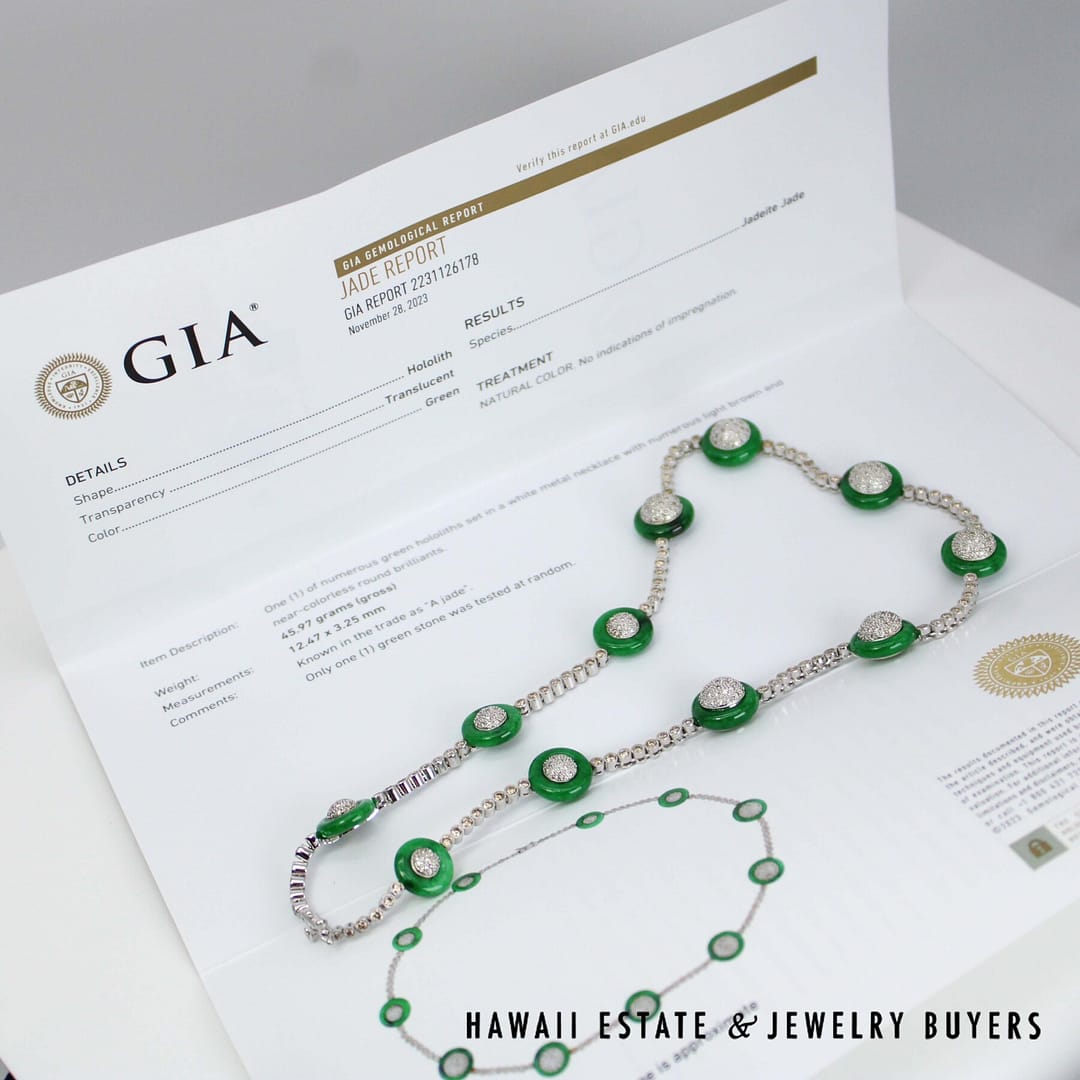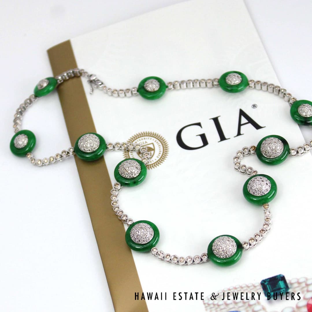 DescriptionGIA 2231126178 – NATURAL COLOR. No indications of impregnation..GIA 45.9g 18KWG GREEN JADE AND 5.50ctw DIAMOND 17" NECKLACE (3010-03)$8,100.001 in stockGIA Green Jade and 5.50ctw Diamond 45.9g 18KWG 17" Necklace quantityAdd to cartMake OfferSKU: 3010-03Category: GIARelated StylesGIA Jadeite Jade Green Carved Diamond 18k Yellow Gold French Back Earrings$8,000.00GIA Grade A Green NATURAL Jadeite Jade 0.66ctw Diamond 18K Yellow Gold Brooch$4,500.00GIA Jadeite Jade Moss in Snow Carved Four Disciple 14k Yellow Gold Large Pendant$3,800.00GIA Grade A Fei Cui Natural Green Jadeite Jade Pendant 14K Yellow Gold$3,500.00