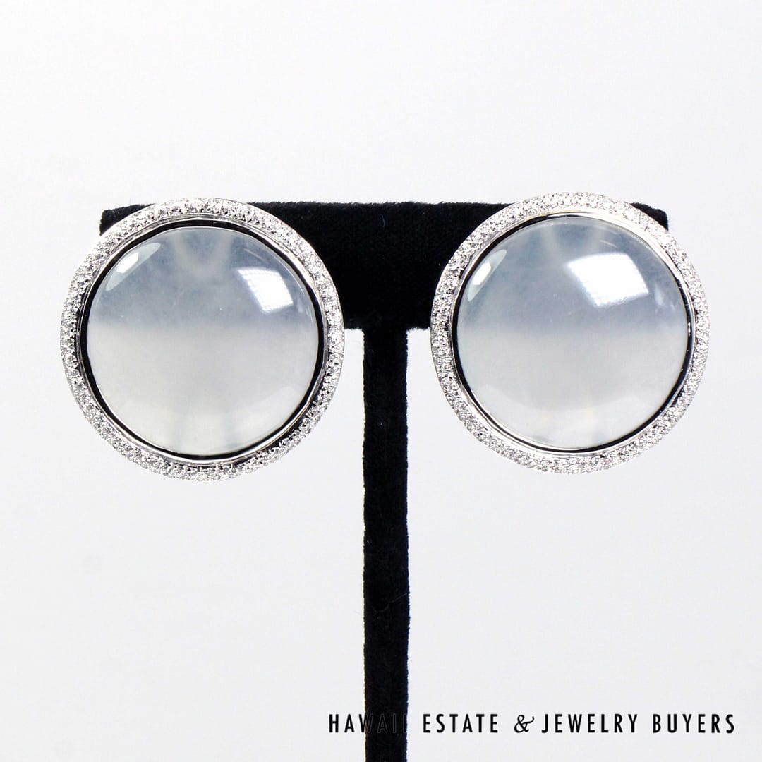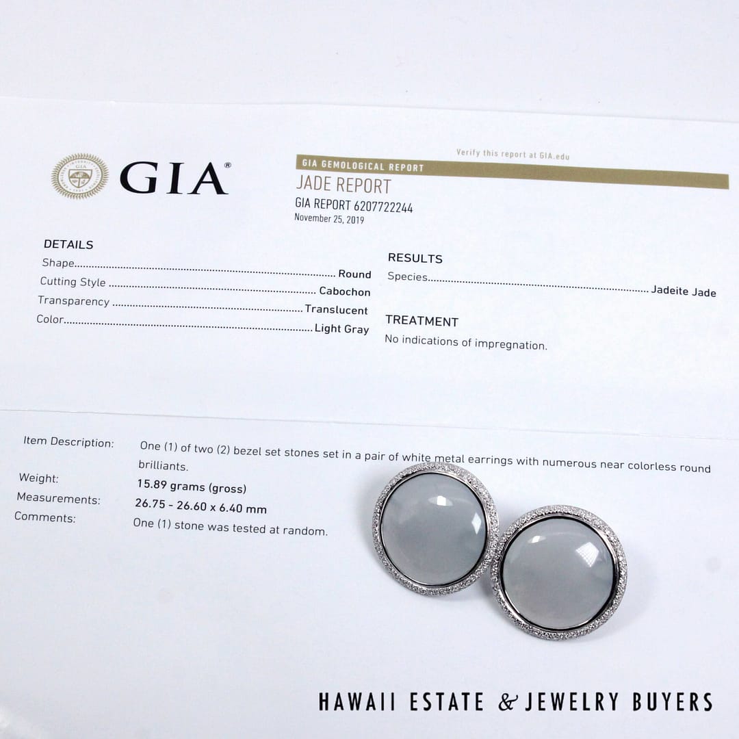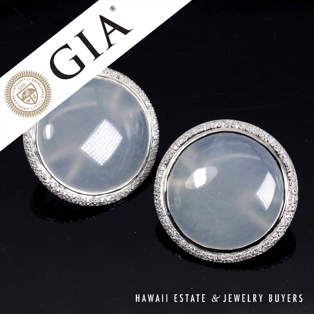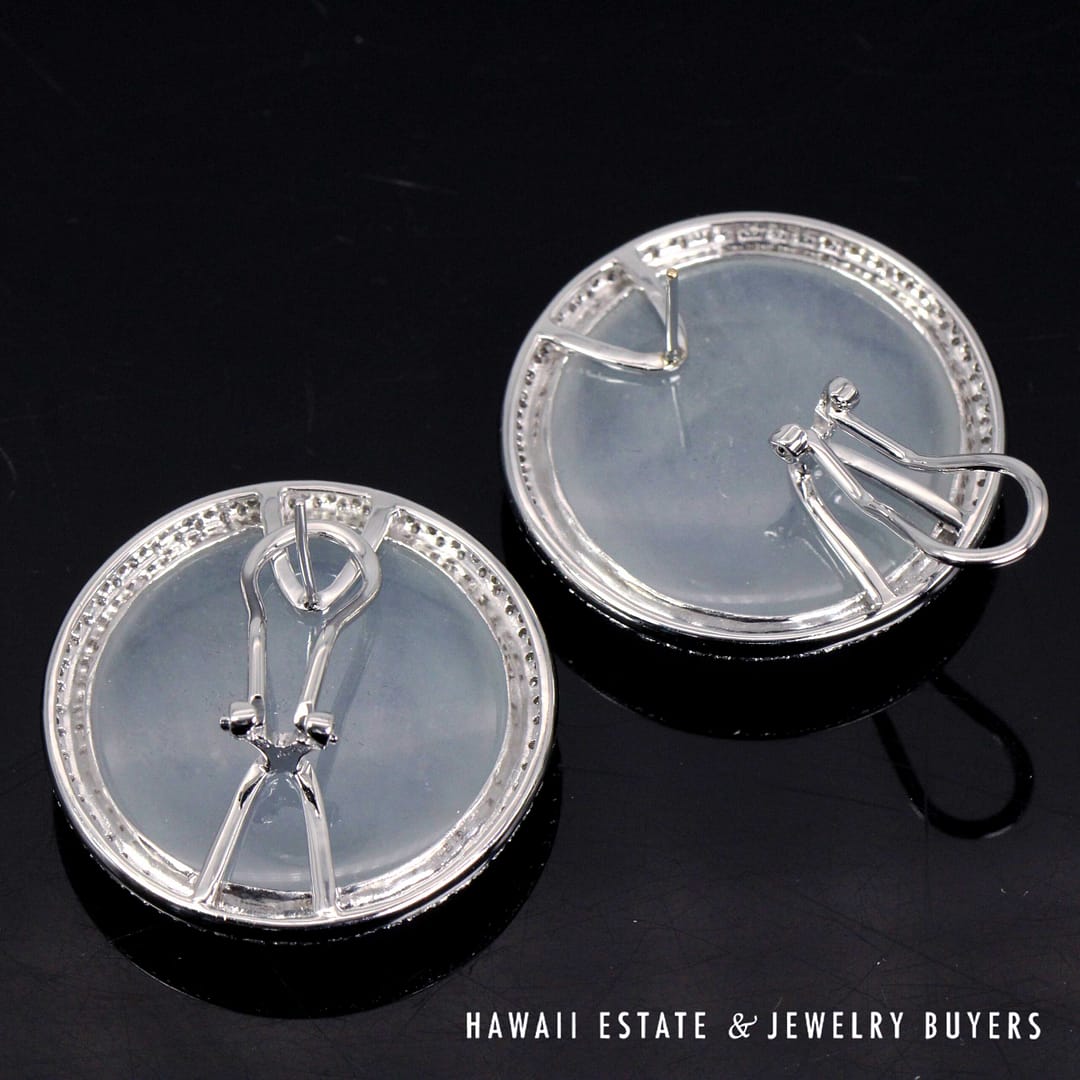 Elegant GIA-certified translucent white ice jade circle cabochon earrings set in 18K white gold, accented with a halo of diamonds and finished with secure French back omega clips.