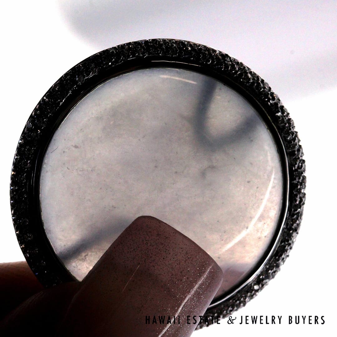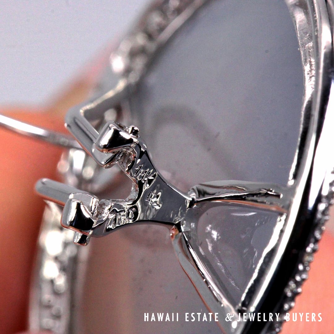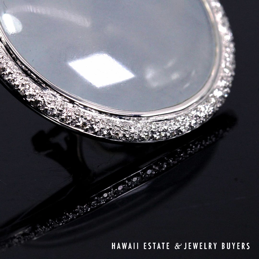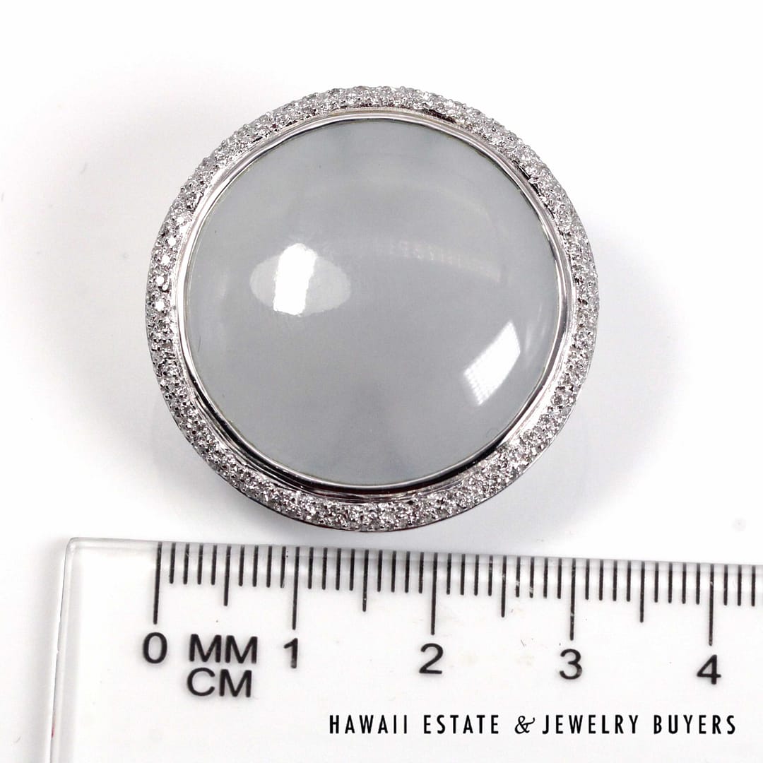 Elegant GIA-certified translucent white ice jade circle cabochon earrings set in 18K white gold, accented with a halo of diamonds and finished with secure French back omega clips.