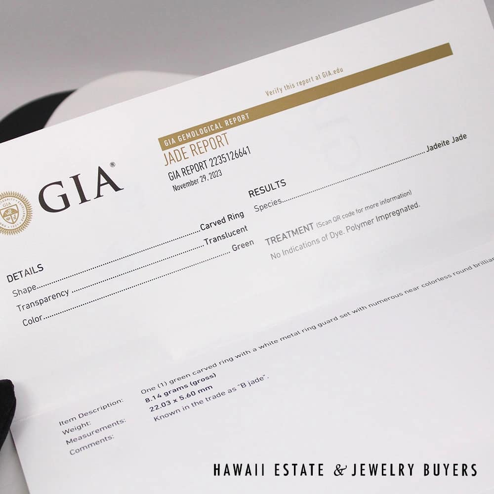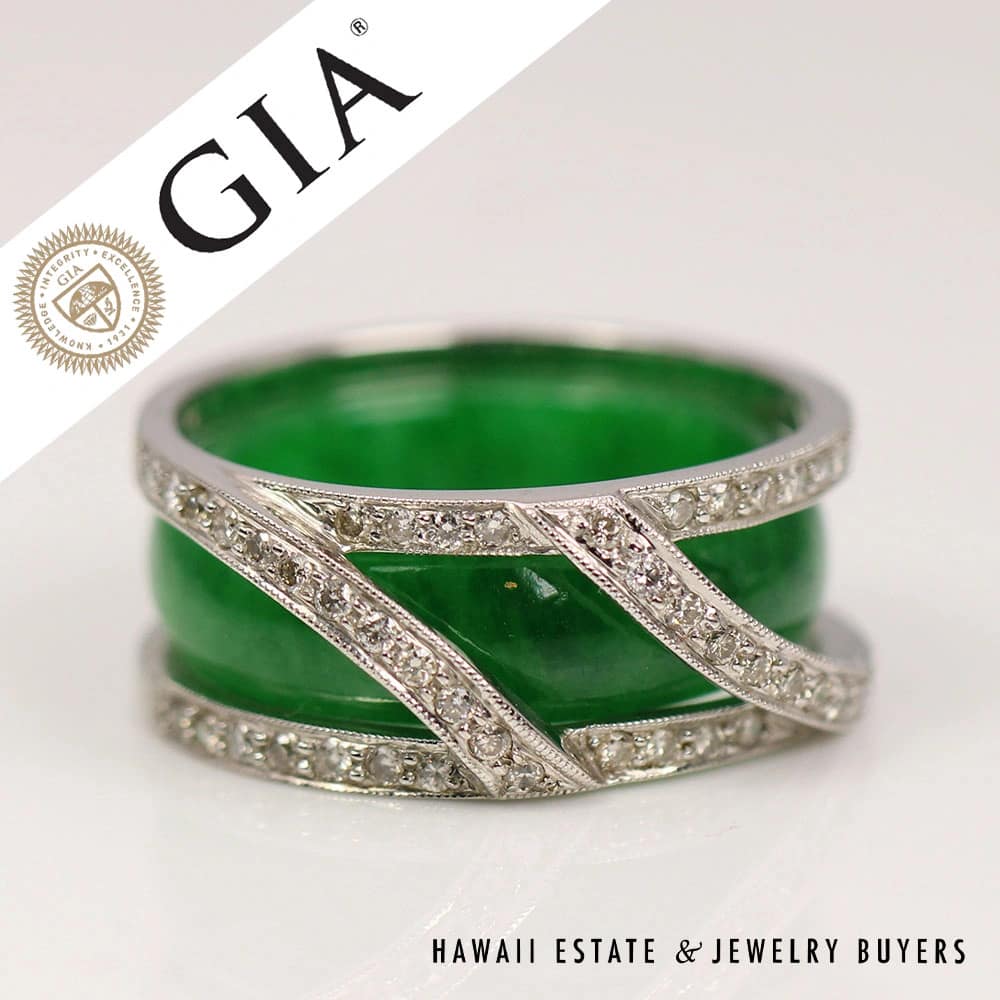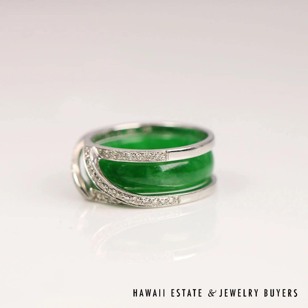 GIA 8.1g 18KWG GREEN JADE AND 0.25ctw DIAMOND RING SIZE 6