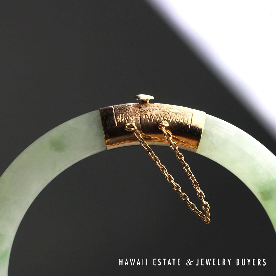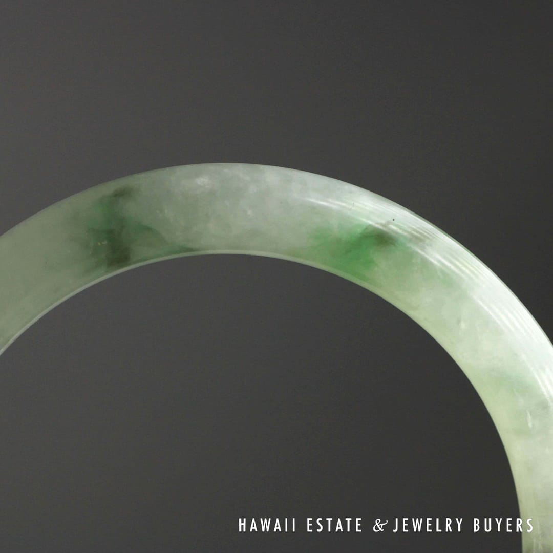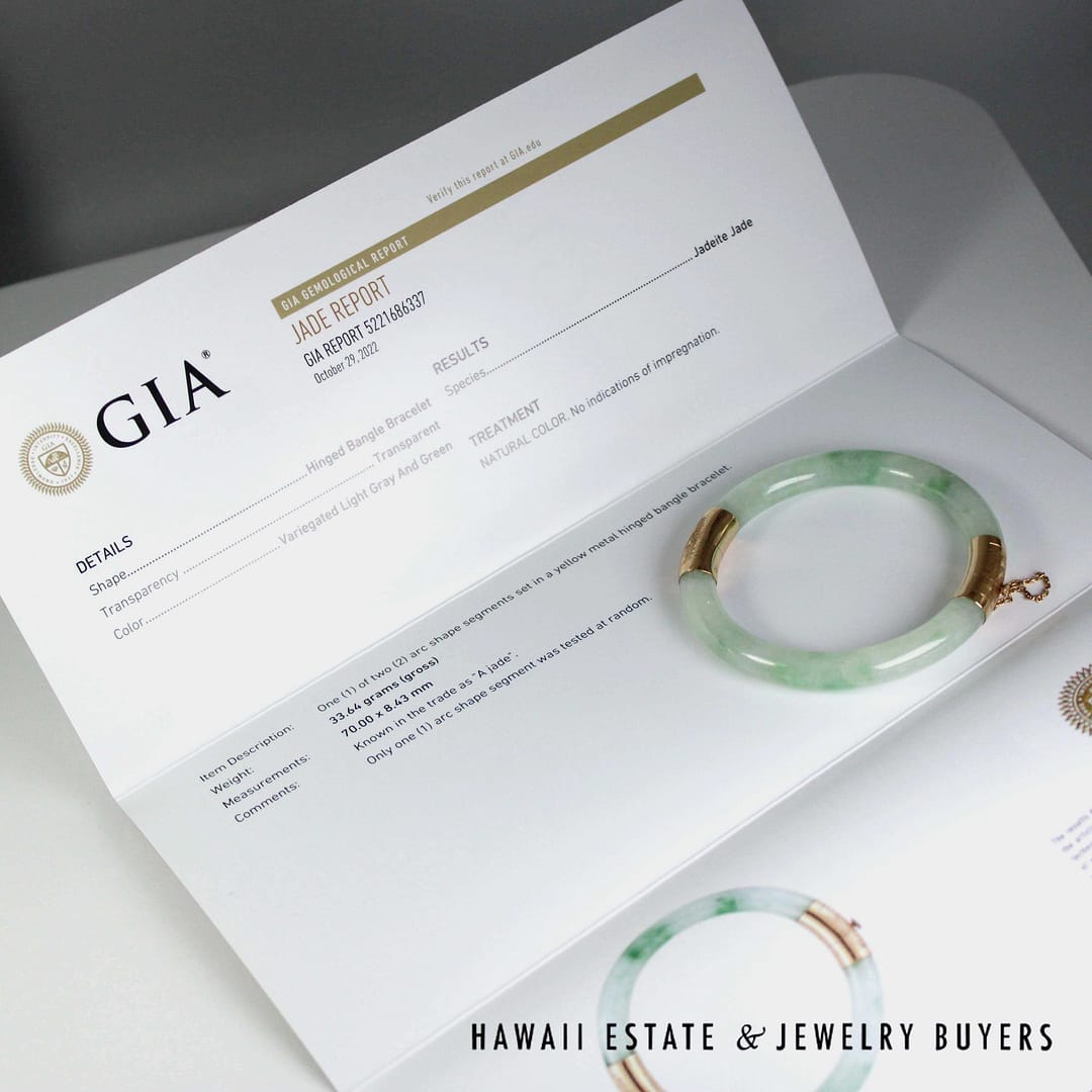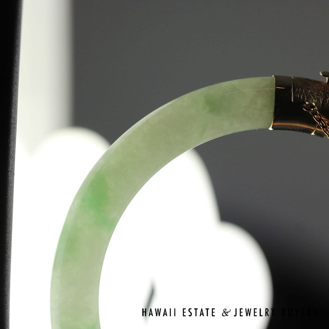 GIA 33.6g 14KYG MOTTLED GREEN HINGED BANGLE BRACELET SIZE 6.75 (2790-09)