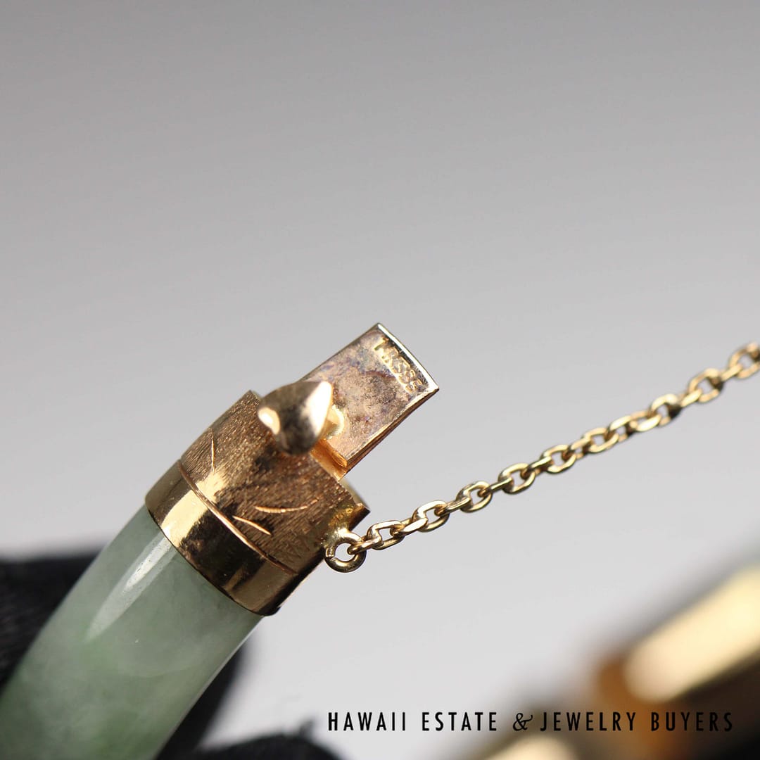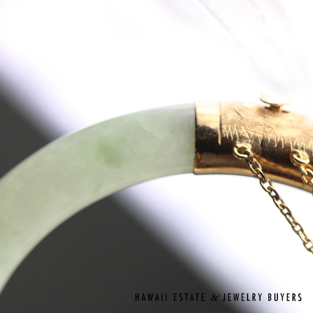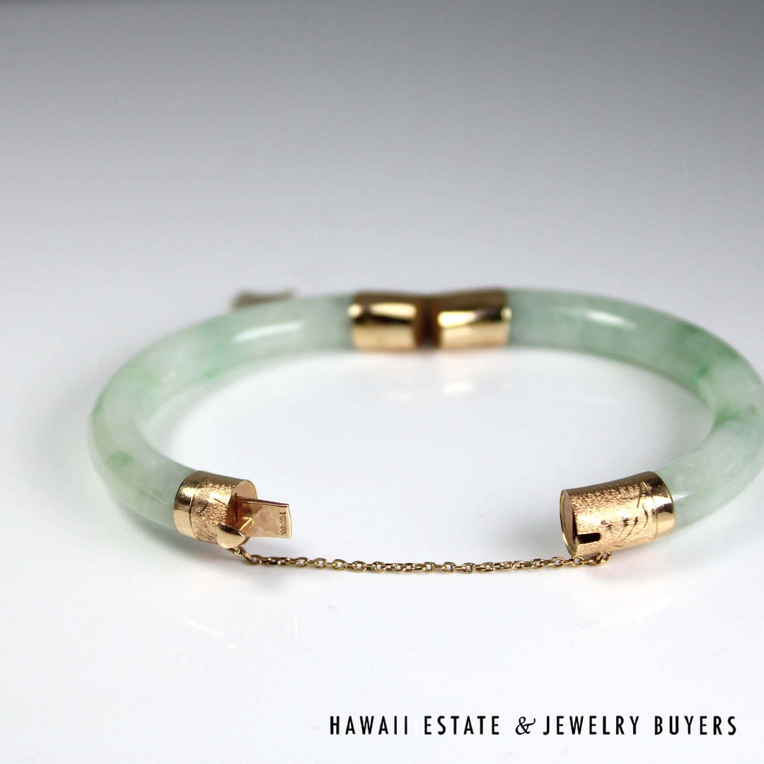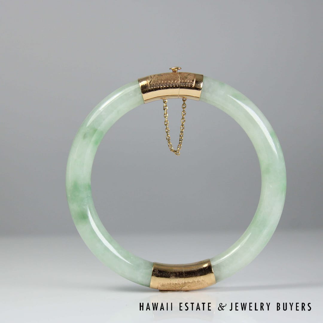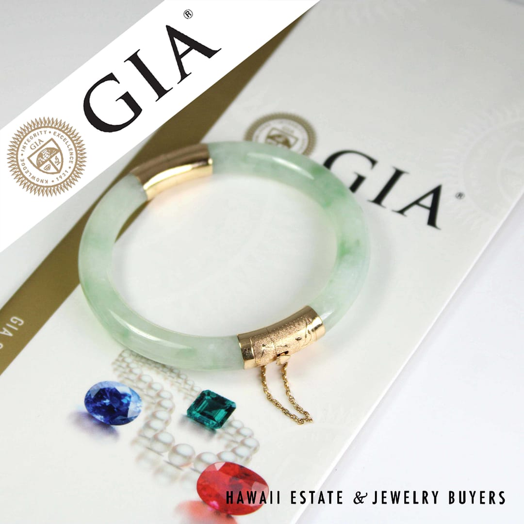 GIA 33.6g 14KYG MOTTLED GREEN HINGED BANGLE BRACELET SIZE 6.75 (2790-09)
