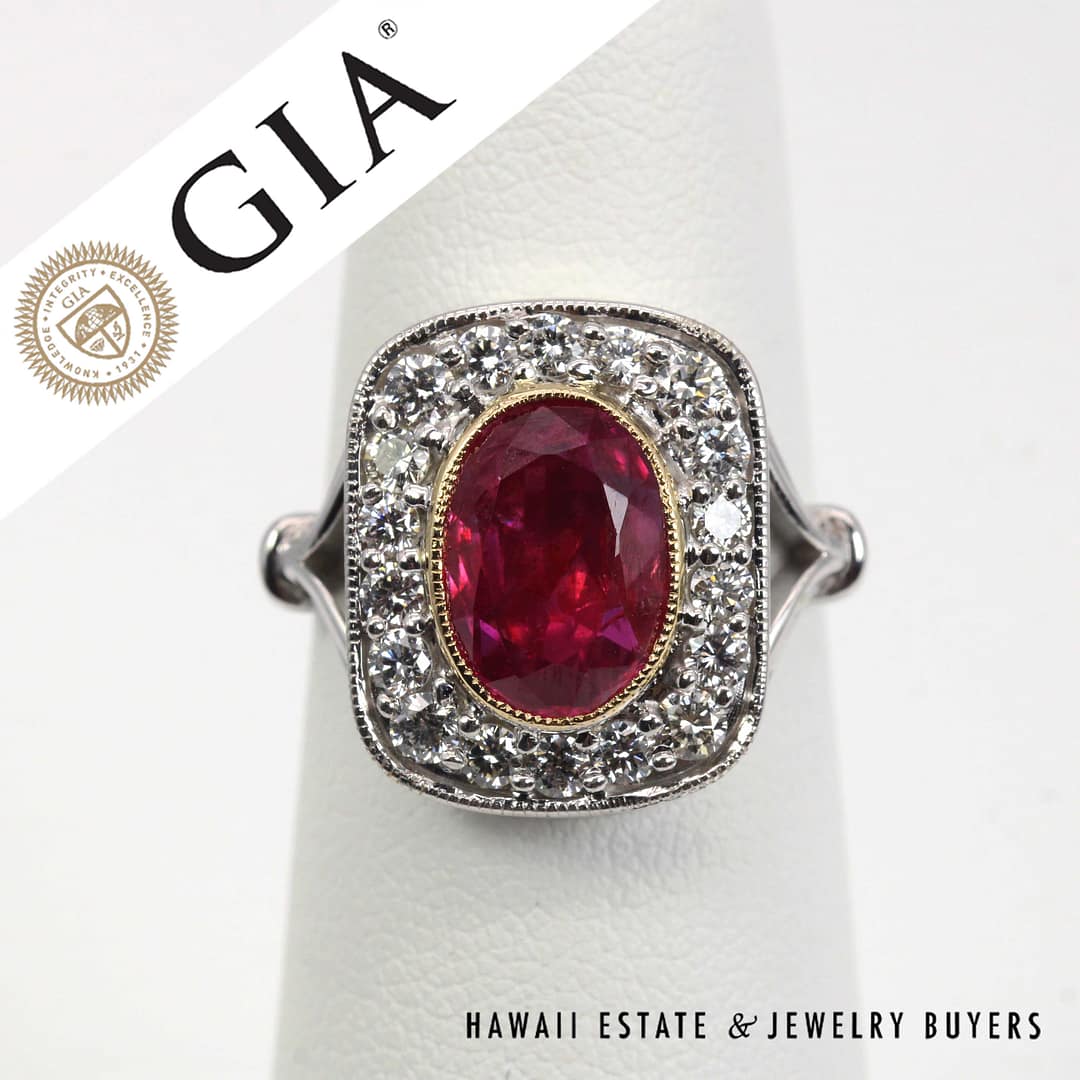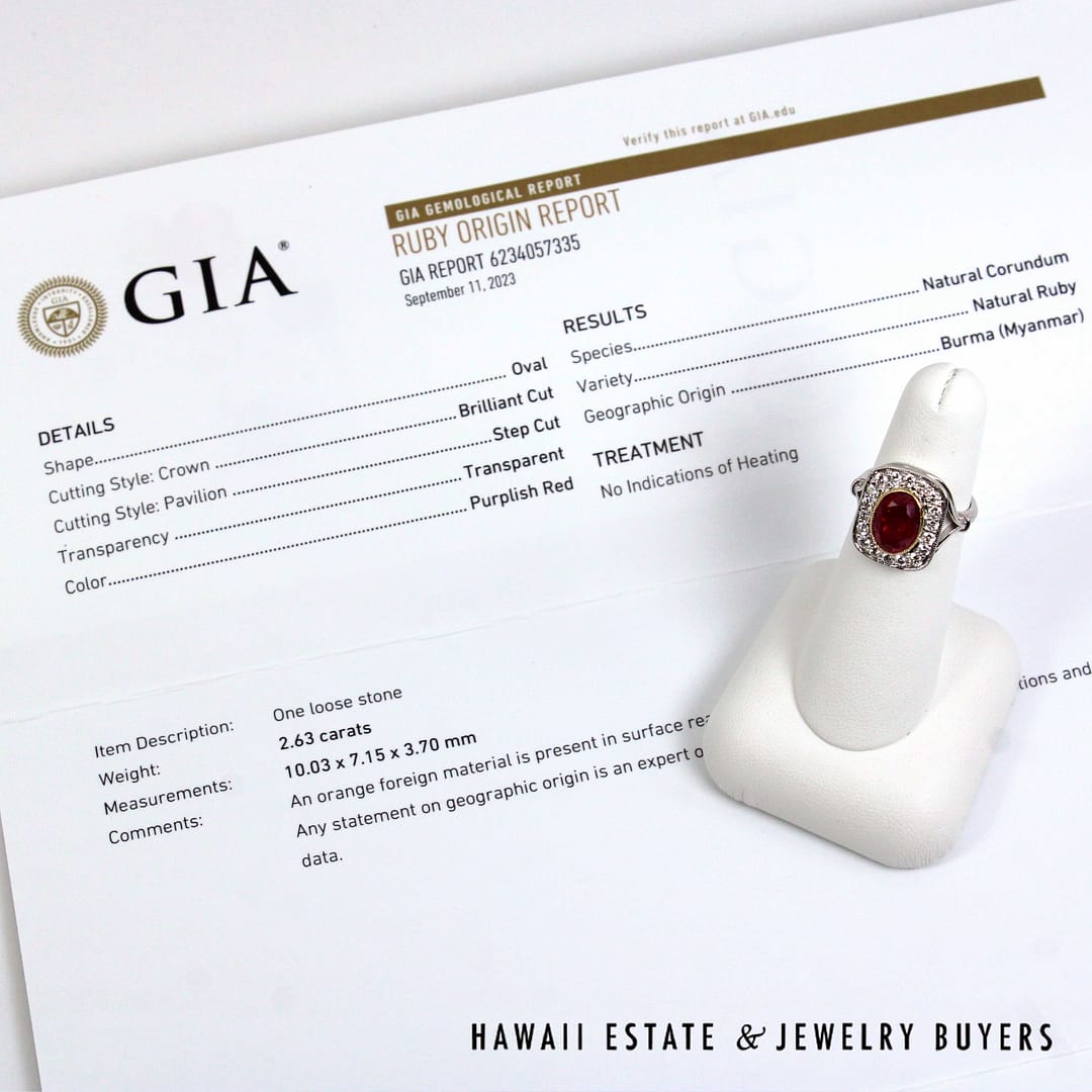 GIA 6.3g 18K2T 2.63ct RUBY OVAL BURMA NO HEAT 0.63ctw DIAMOND RING SIZE 5.5 with APPRAISAL (2967-01)