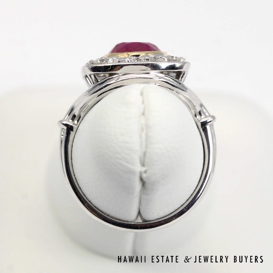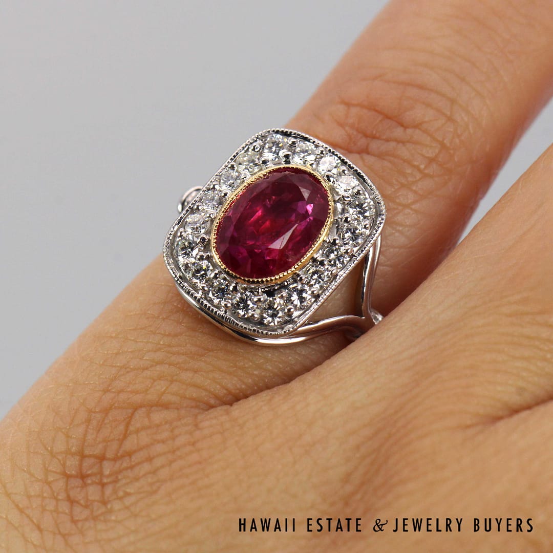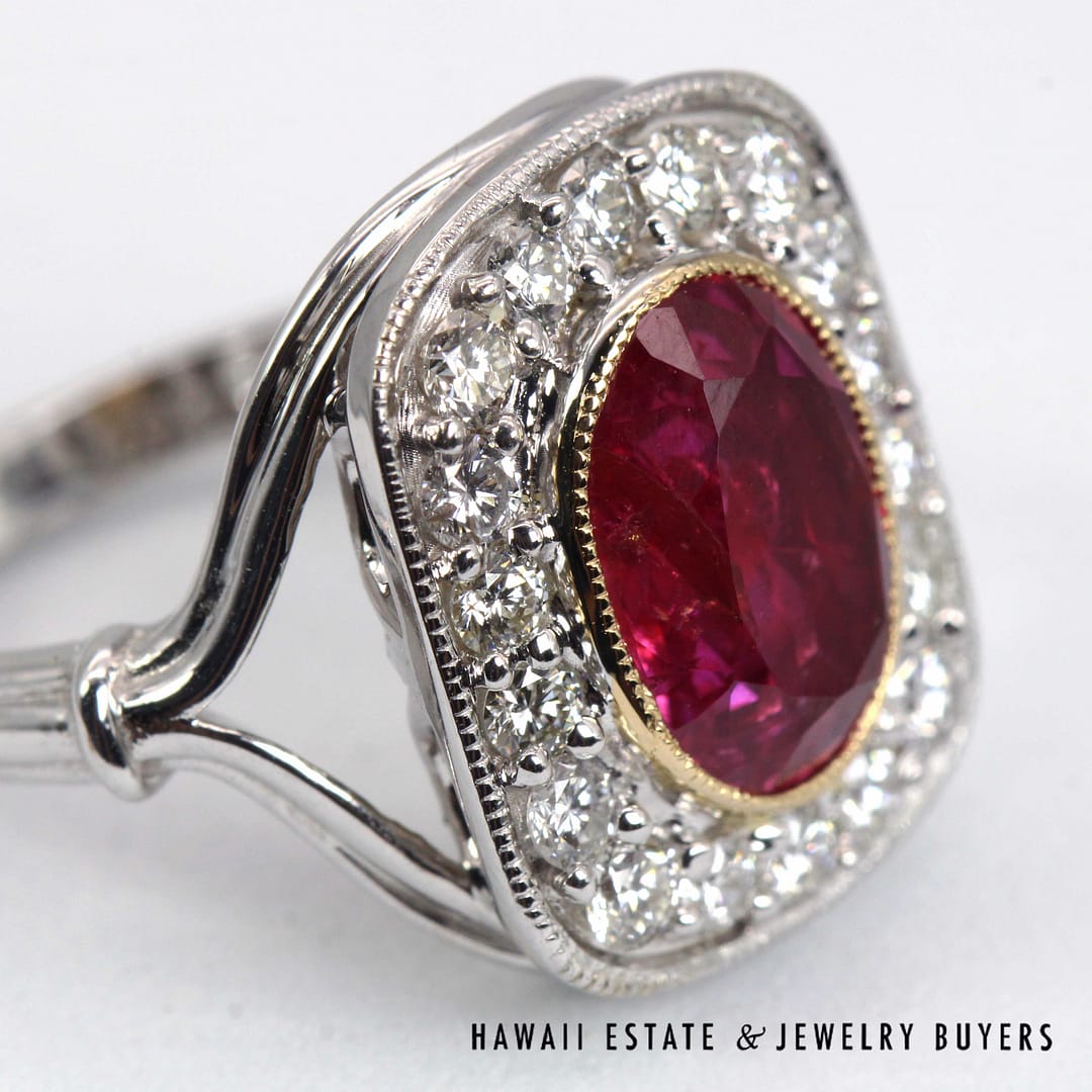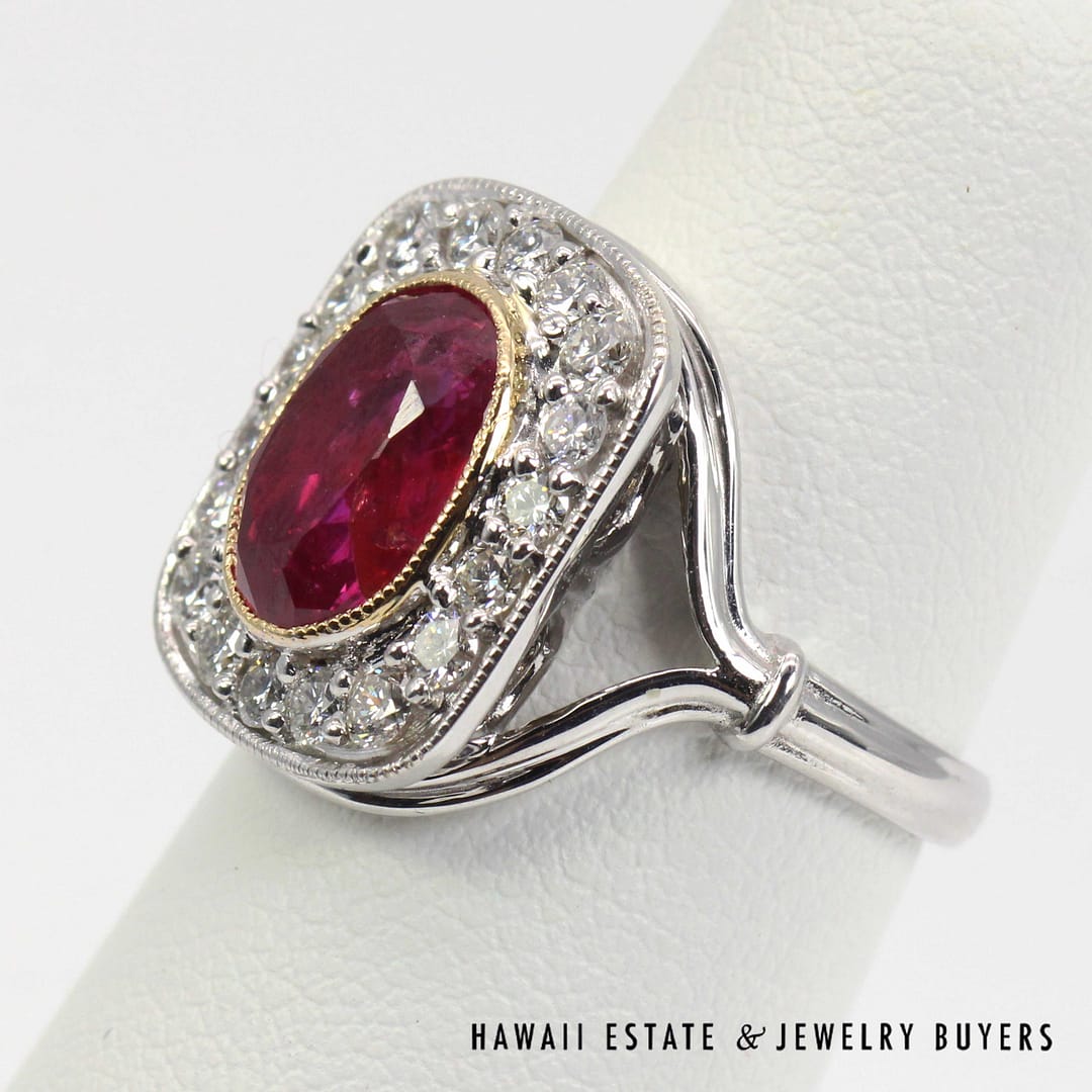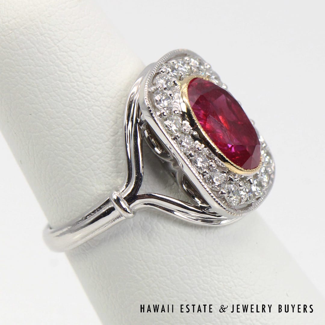 Stunning natural 2.63ct oval Burmese ruby surrounded by 0.63ctw of diamonds, set in a sophisticated 18K two-tone gold ring.