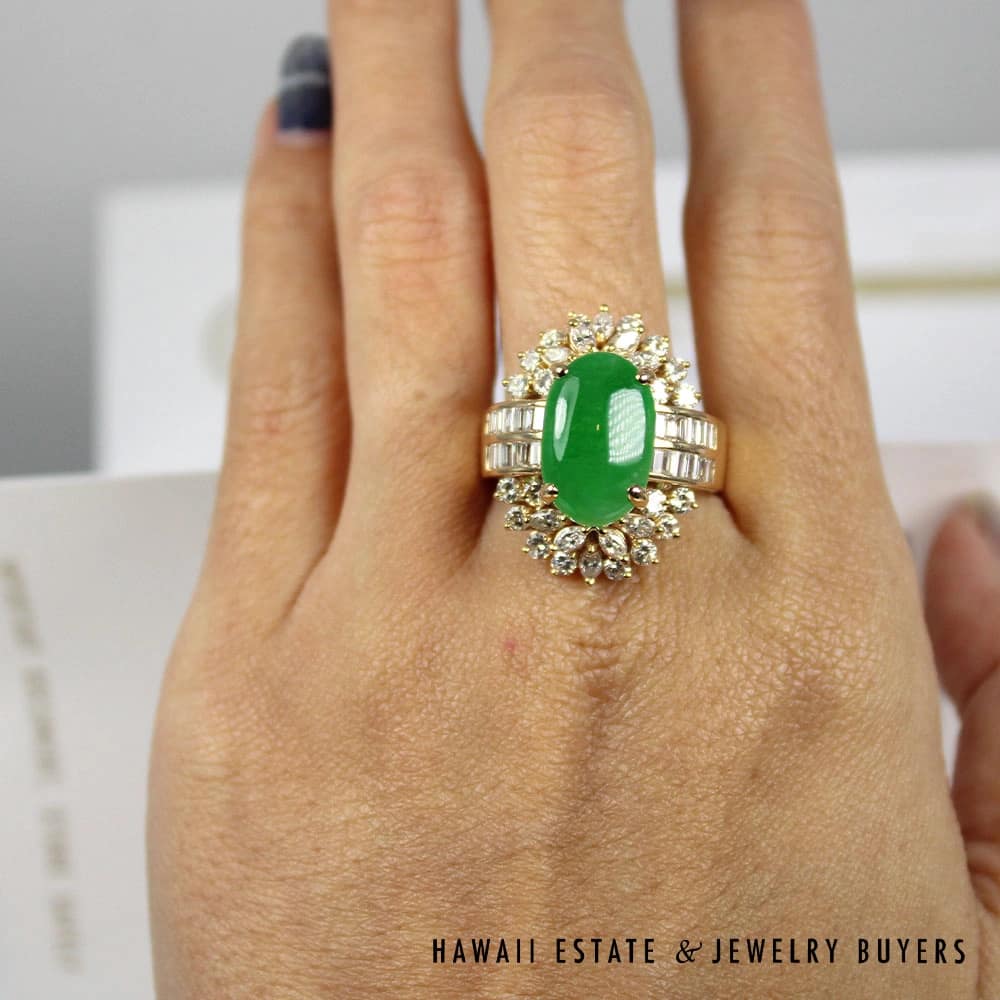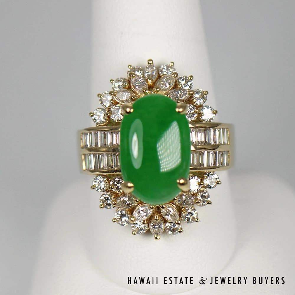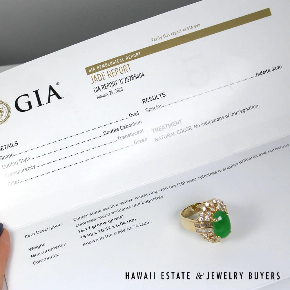 Known as ‘imperial jade’, this diamond and jade cabochon 18K Yellow Gold ring is GIA certified of natural color!