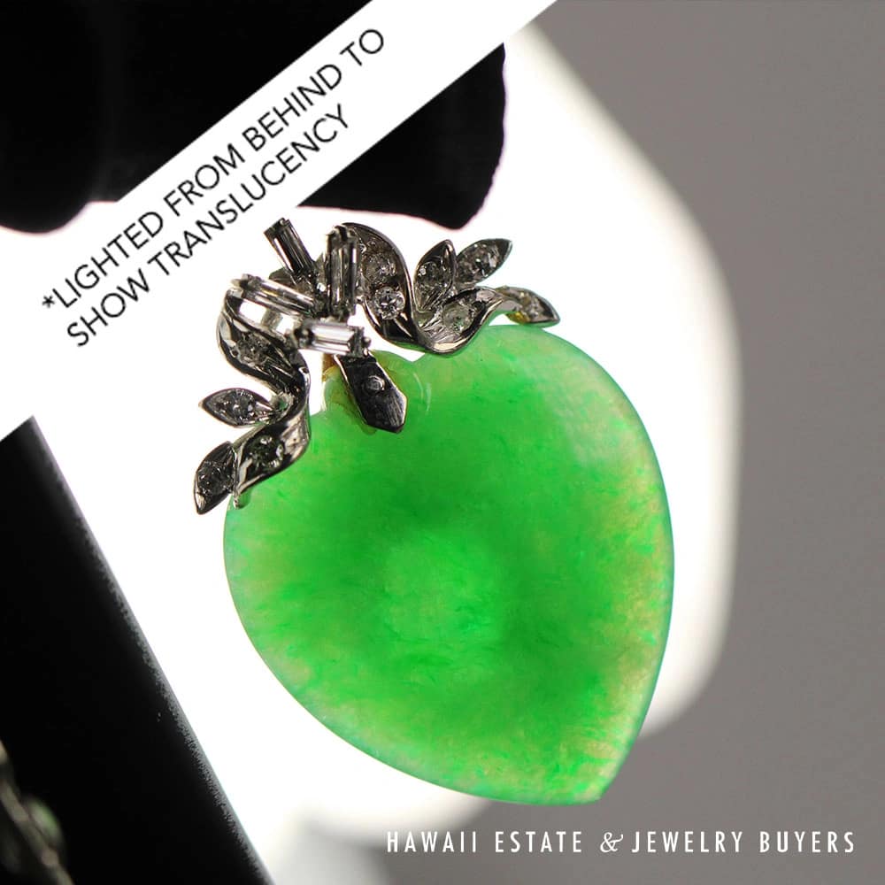 Beautiful GIA certified rare old apple green, pure jade, natural color "Grade A" Jadeite Jade Shield cut set with 0.25CTW of diamonds in 18K White Gold pendant on a 15" fancy chain.