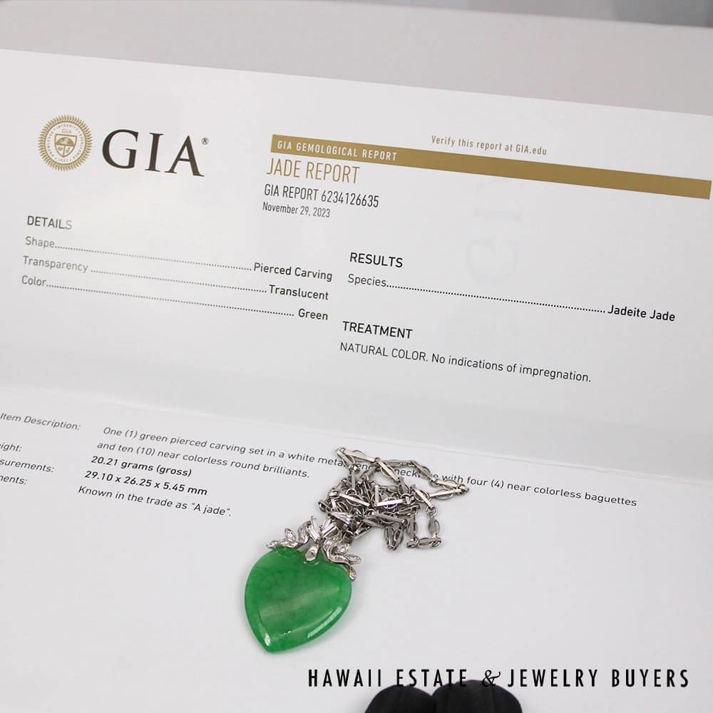 GIA 20g 18K White Gold Green Jade Shield 0.25ctw Diamond Pendant 15” Fancy Chain