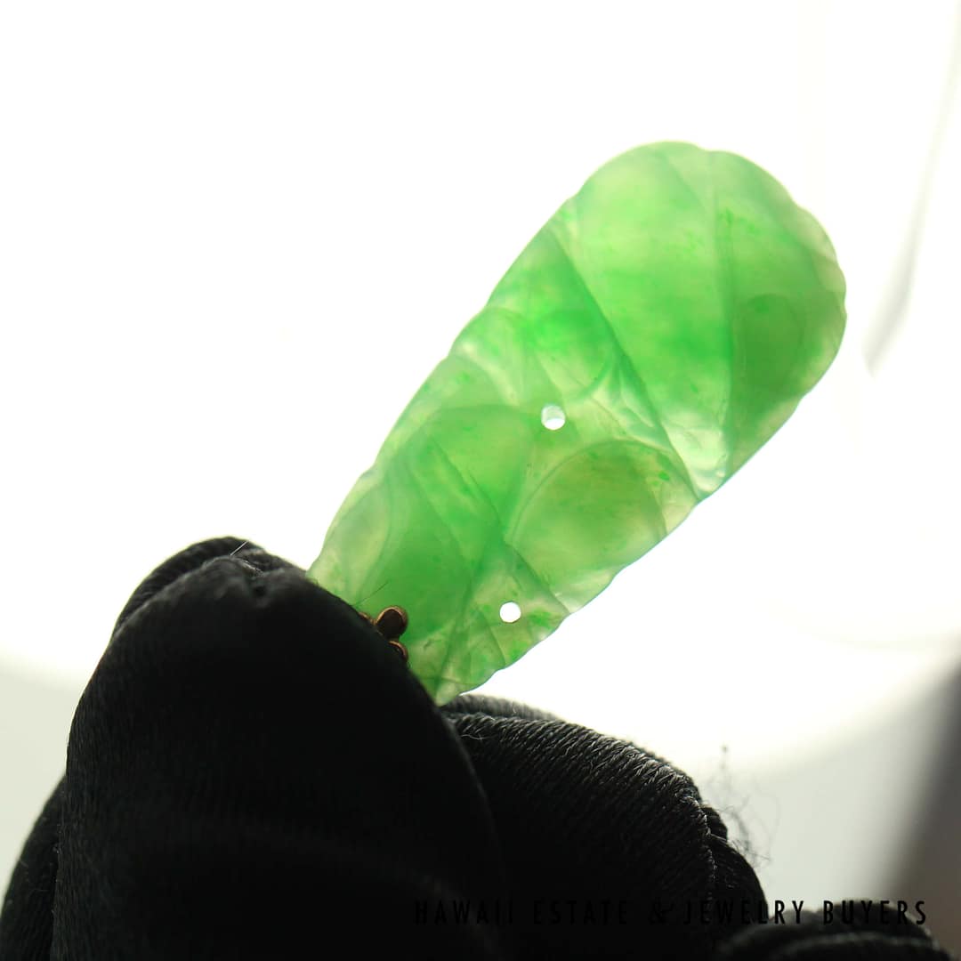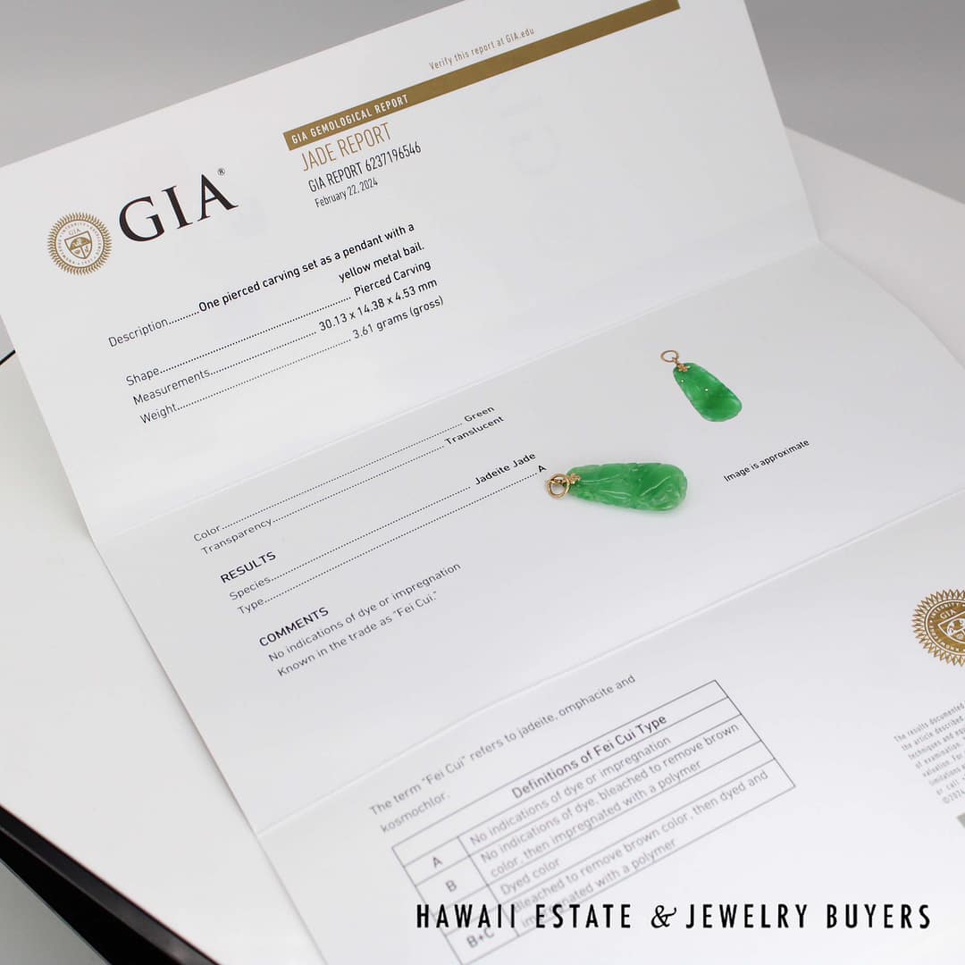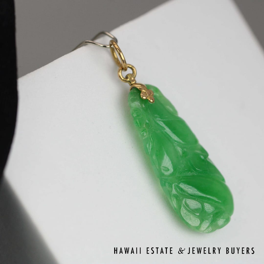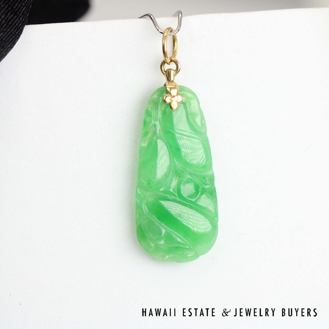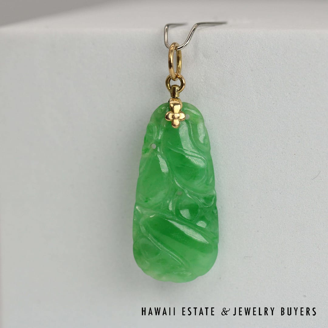 This GIA-certified Type A carved green jade pendant is set in classic 14k yellow gold-an elegant piece that highlights the beauty of natural jade and skilled craftsmanship.