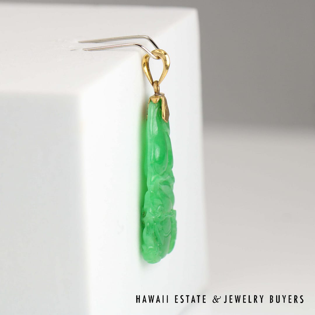 This GIA-certified Type A carved green jade pendant is set in luminous 20k yellow gold, measuring 34x13mm-a refined piece that showcases traditional craftsmanship and natural beauty
