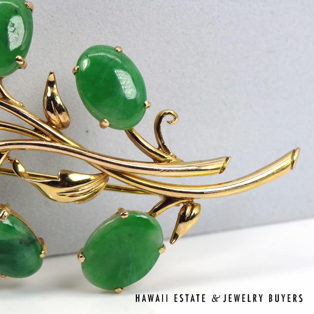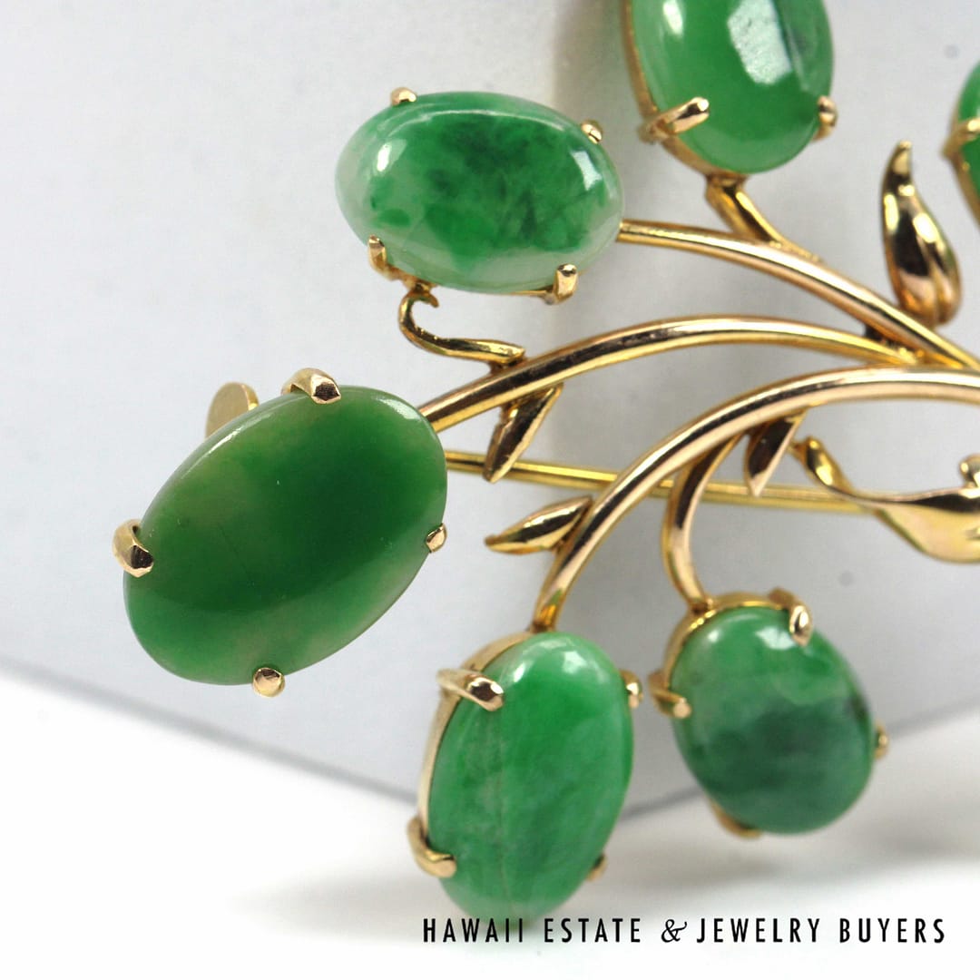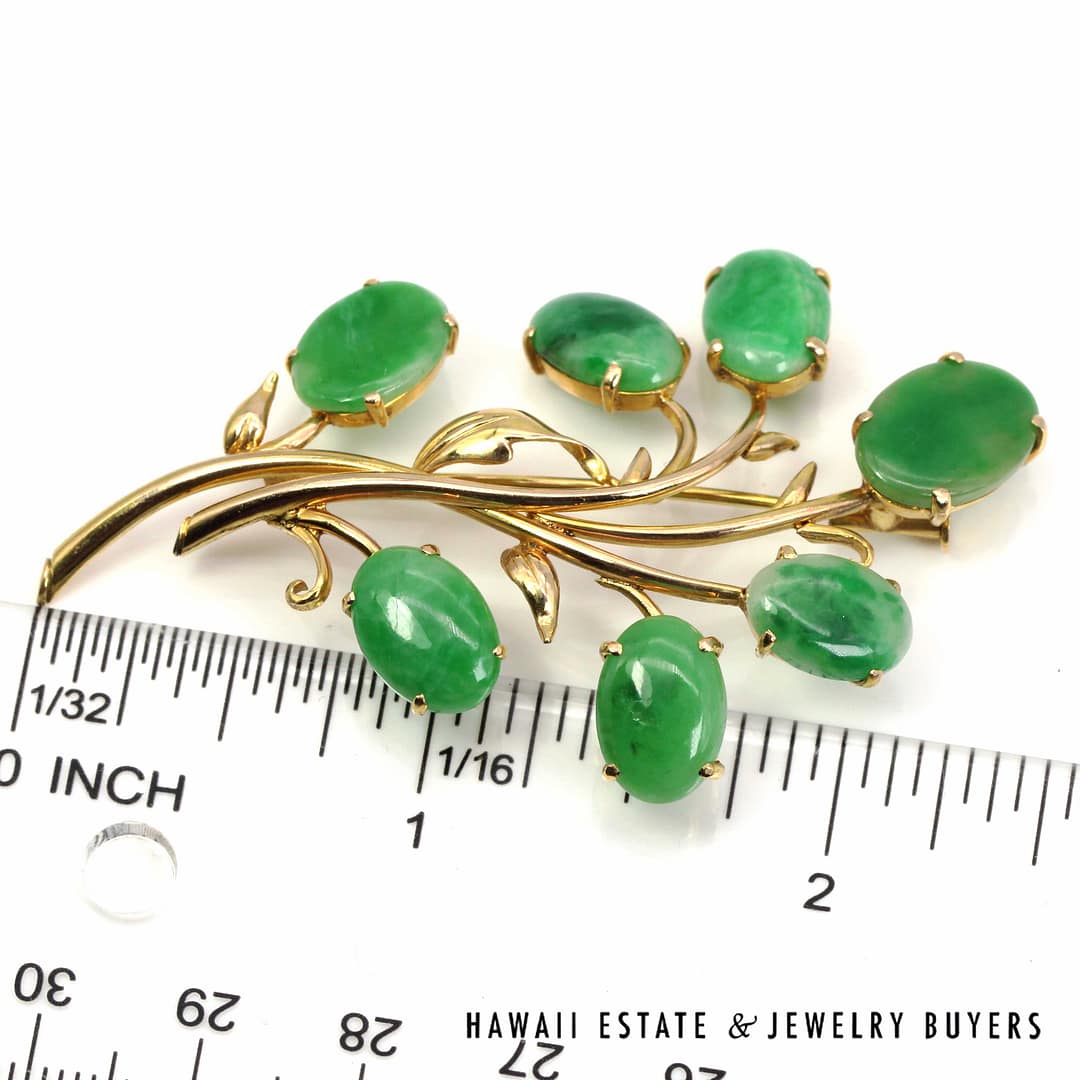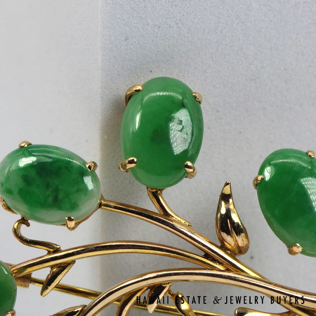 DescriptionGIA-certified natural green jade cabochon brooch set in 14K yellow gold with an elegant floral design.GIA 11.1g 14KYG GREEN JADE BROOCH MEASURES 63x40mm (3095-16)$2,000.001 in stockGIA Type A Green Jade Brooch 14K Yellow Gold Measures 63x40mm quantityAdd to cartBuy withMake OfferSKU: 3095-16Category: Pre-owned Jade JewelryRelated StylesMING’S 14KYG 94.5g RED JADE DRAGON & PHOENIX CARVED MEDALLION$2,300.00GIA 80g 14KYG MOTTLED ORANGY BROWN JADE HINGED BANGLE BRACELET SIZE 8$6,000.00GIA 14KYG 52.3g GRAY PURPLE JADE TYPE A HINGED BANGLE BRACELET SIZE 7$11,000.005.4g 14KYG GREEN JADE MARQUISE CABOCHON PENDANT$499.00