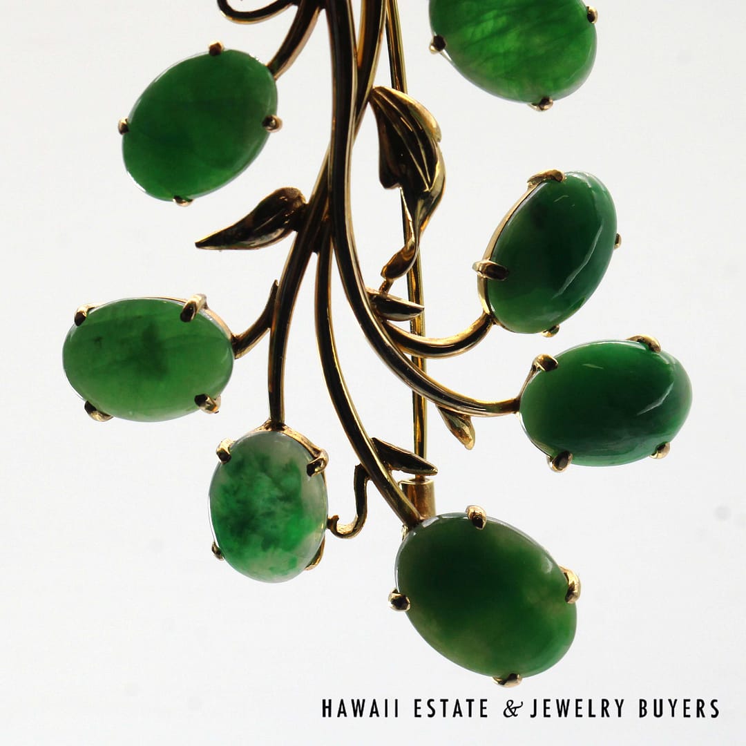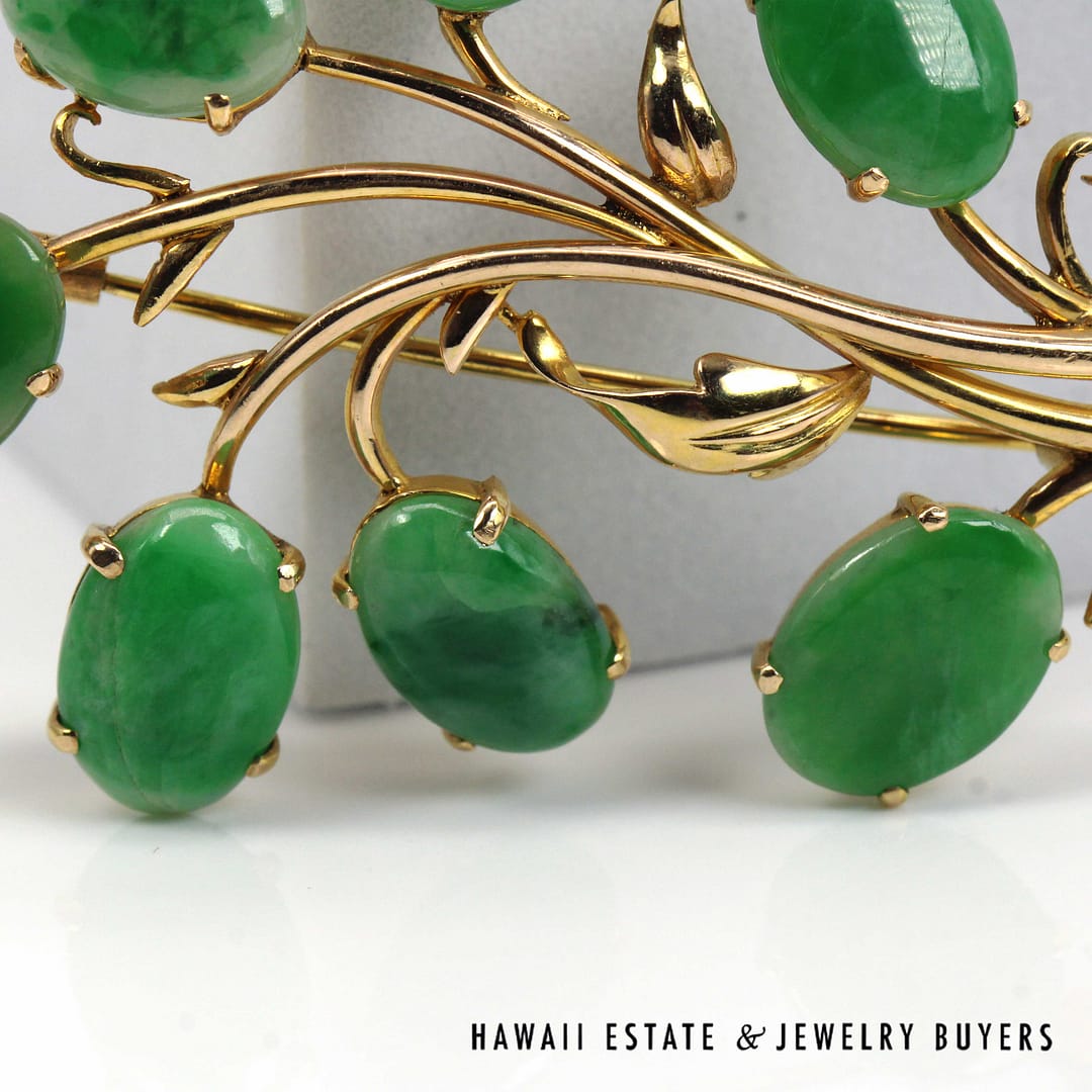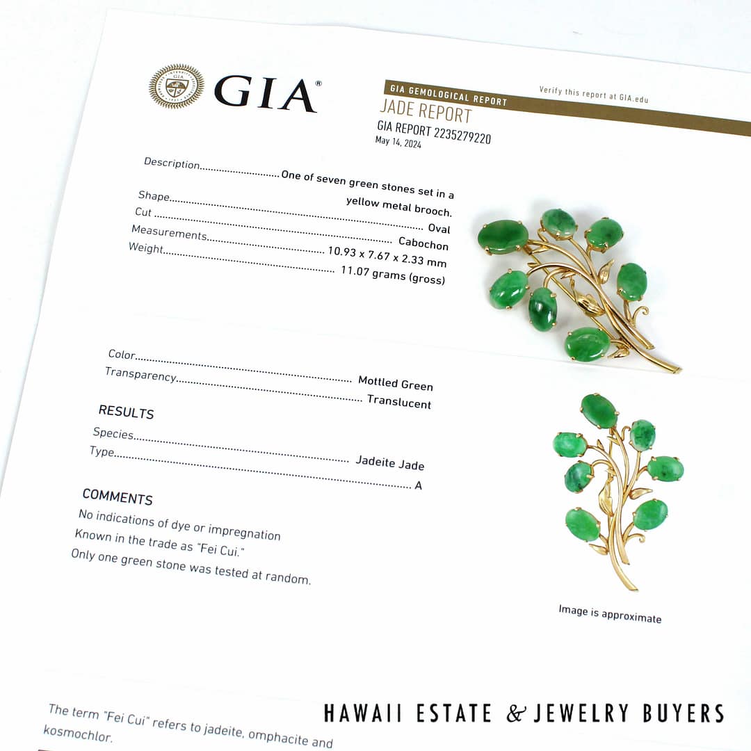 DescriptionGIA-certified natural green jade cabochon brooch set in 14K yellow gold with an elegant floral design.GIA 11.1g 14KYG GREEN JADE BROOCH MEASURES 63x40mm (3095-16)$2,000.001 in stockGIA Type A Green Jade Brooch 14K Yellow Gold Measures 63x40mm quantityAdd to cartBuy withMake OfferSKU: 3095-16Category: Pre-owned Jade JewelryRelated StylesMING’S 14KYG 94.5g RED JADE DRAGON & PHOENIX CARVED MEDALLION$2,300.00GIA 80g 14KYG MOTTLED ORANGY BROWN JADE HINGED BANGLE BRACELET SIZE 8$6,000.00GIA 14KYG 52.3g GRAY PURPLE JADE TYPE A HINGED BANGLE BRACELET SIZE 7$11,000.005.4g 14KYG GREEN JADE MARQUISE CABOCHON PENDANT$499.00