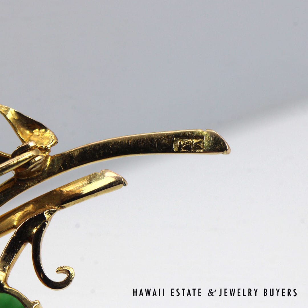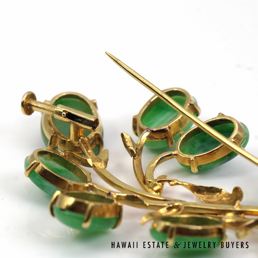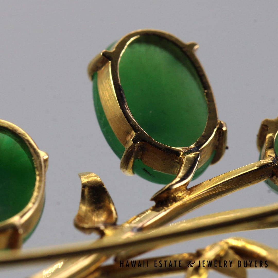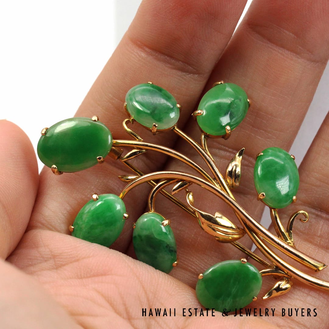 DescriptionGIA-certified natural green jade cabochon brooch set in 14K yellow gold with an elegant floral design.GIA 11.1g 14KYG GREEN JADE BROOCH MEASURES 63x40mm (3095-16)$2,000.001 in stockGIA Type A Green Jade Brooch 14K Yellow Gold Measures 63x40mm quantityAdd to cartBuy withMake OfferSKU: 3095-16Category: Pre-owned Jade JewelryRelated StylesMING’S 14KYG 94.5g RED JADE DRAGON & PHOENIX CARVED MEDALLION$2,300.00GIA 80g 14KYG MOTTLED ORANGY BROWN JADE HINGED BANGLE BRACELET SIZE 8$6,000.00GIA 14KYG 52.3g GRAY PURPLE JADE TYPE A HINGED BANGLE BRACELET SIZE 7$11,000.005.4g 14KYG GREEN JADE MARQUISE CABOCHON PENDANT$499.00