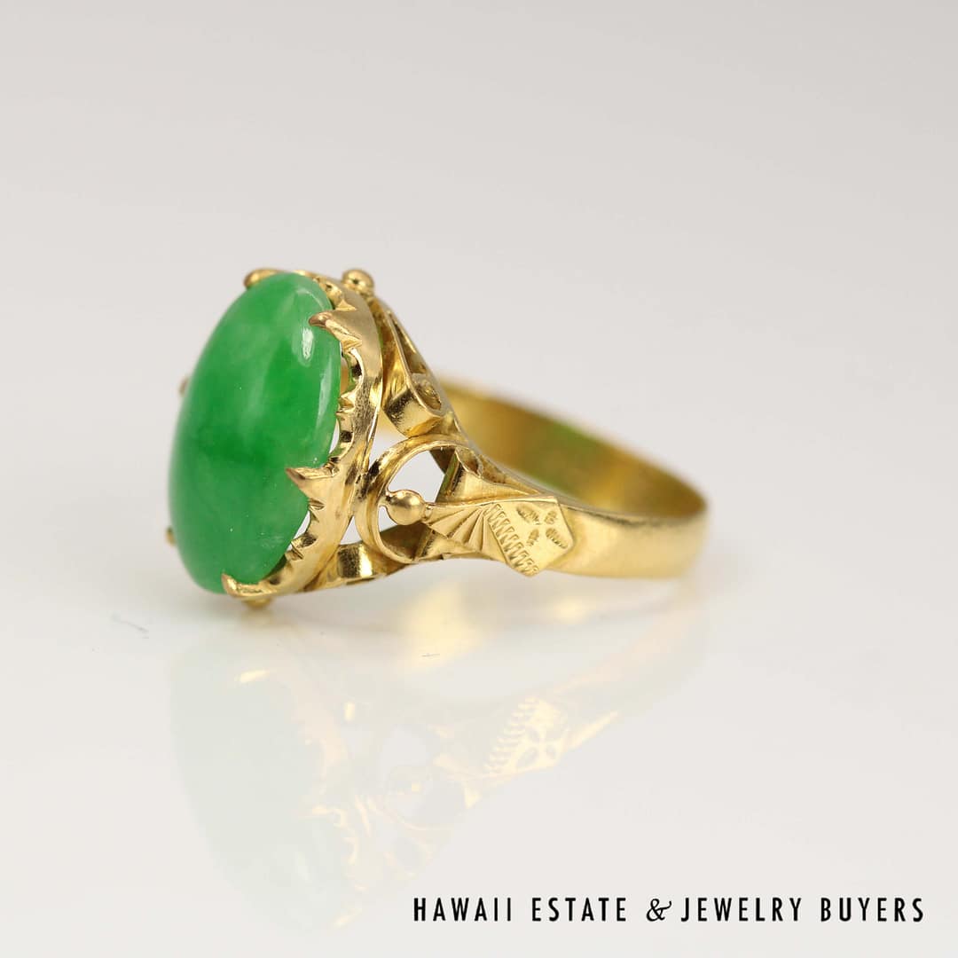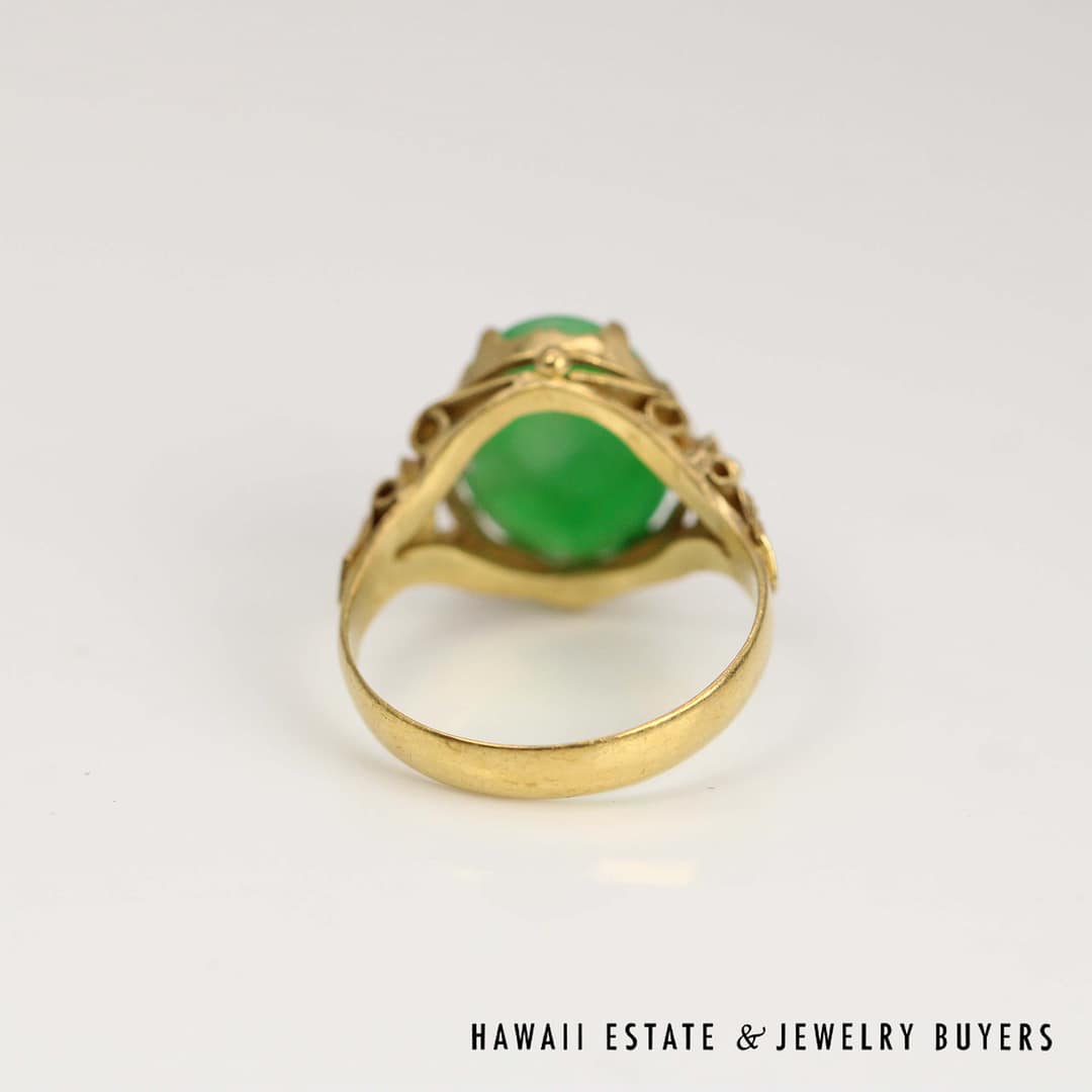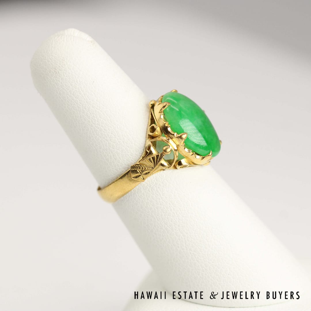 An exquisite GIA Type A green jade oval ring set in rich 20k yellow gold-measuring 10x14mm and size 7-this timeless piece is perfect for collectors and connoisseurs of fine jade jewelry.