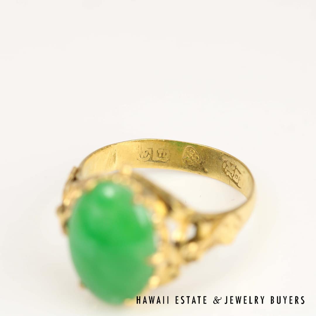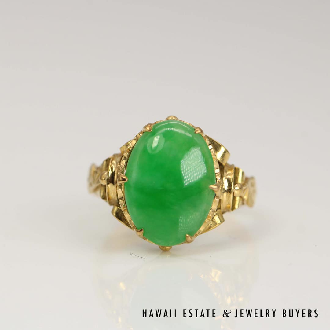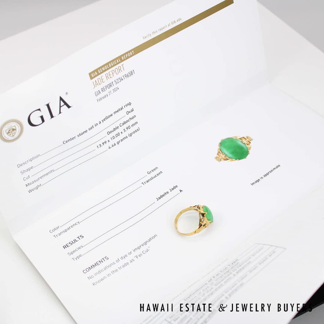 An exquisite GIA Type A green jade oval ring set in rich 20k yellow gold-measuring 10x14mm and size 7-this timeless piece is perfect for collectors and connoisseurs of fine jade jewelry.