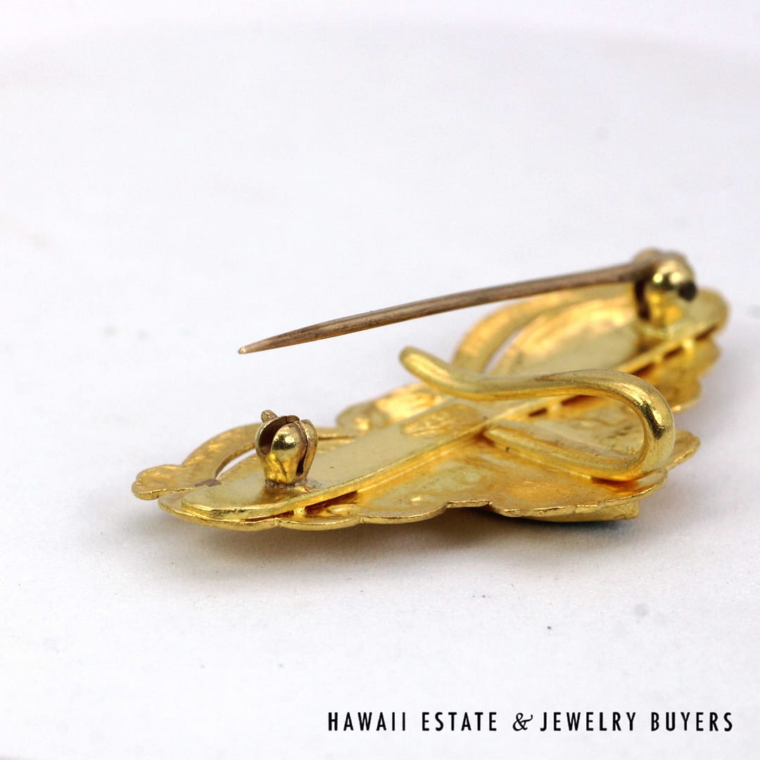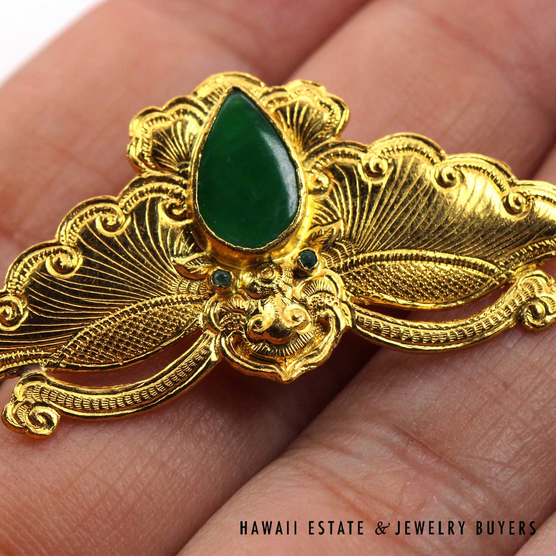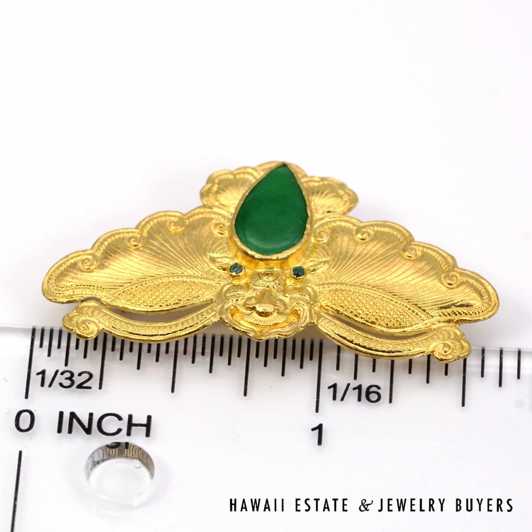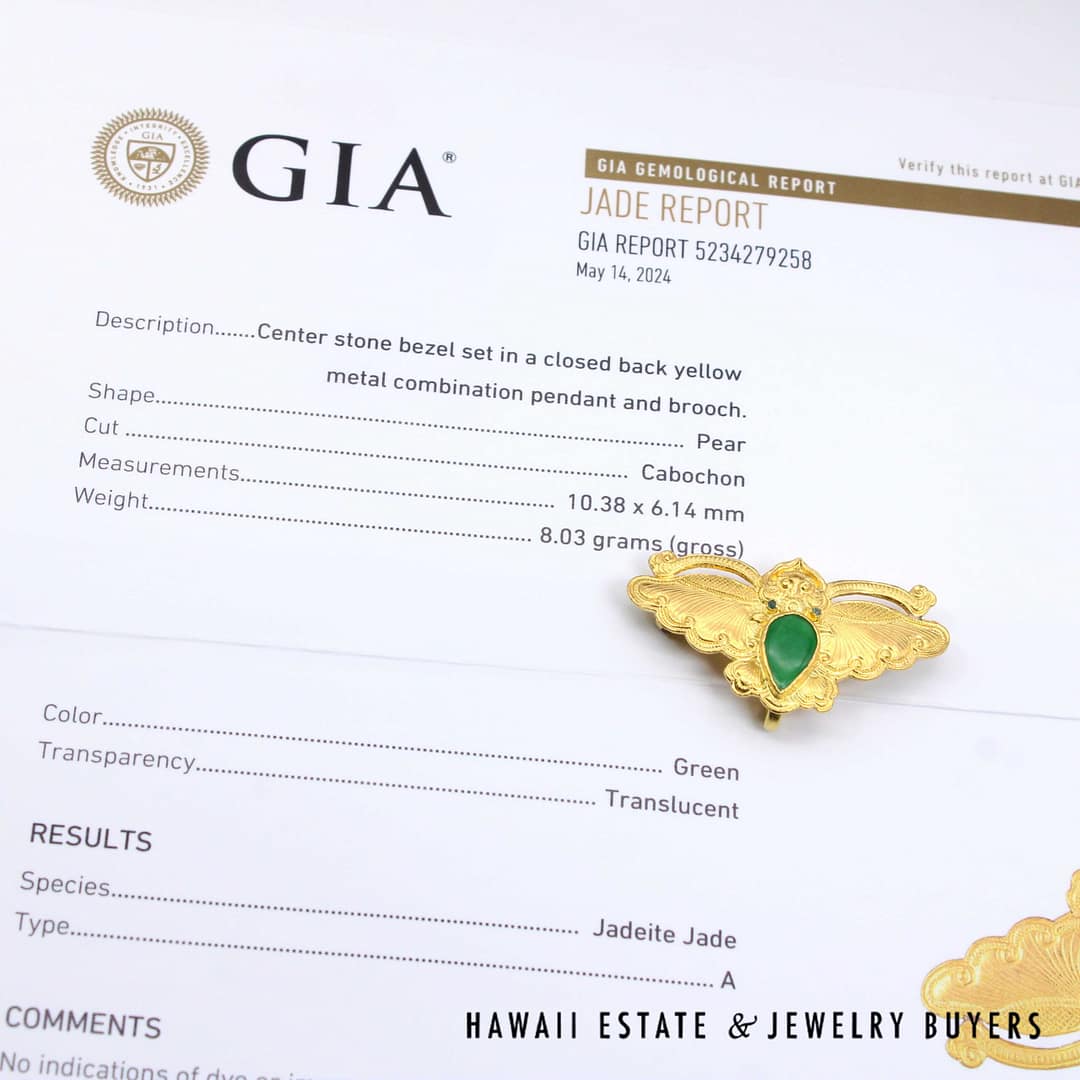 Home » Shop » GIA Type A Green Jadeite Jade Cabochon Moth 24K Yellow Gold Brooch Pin
