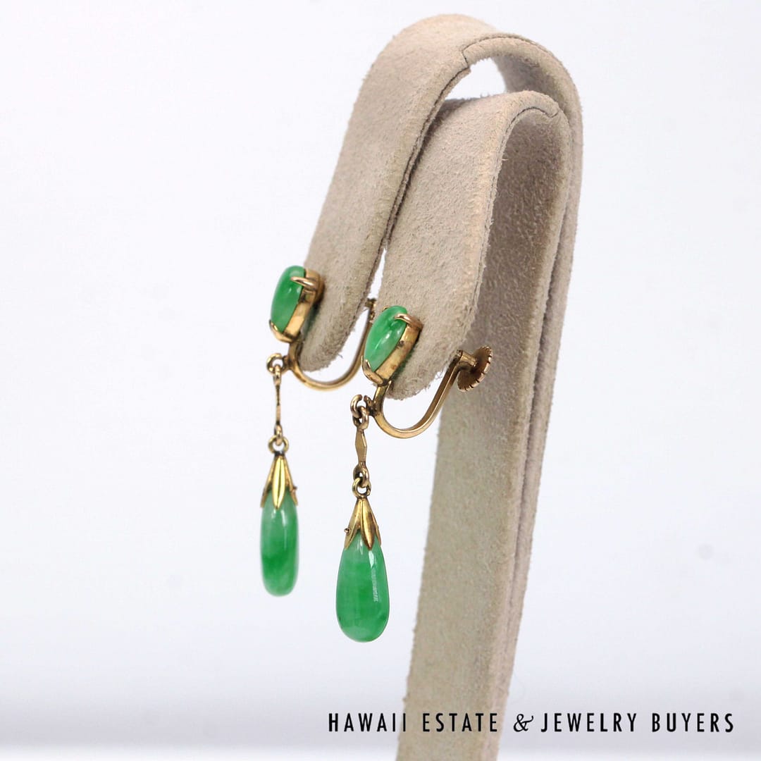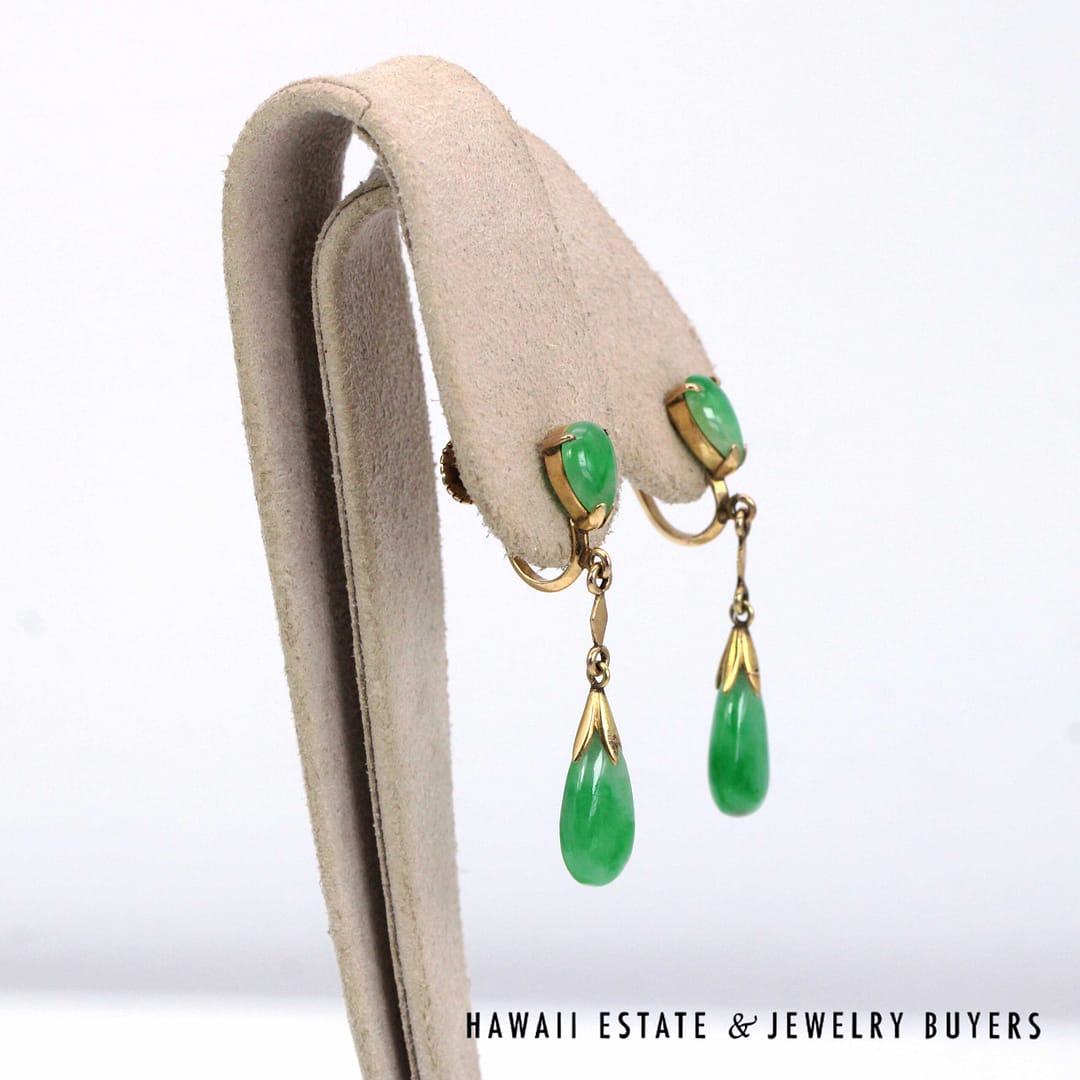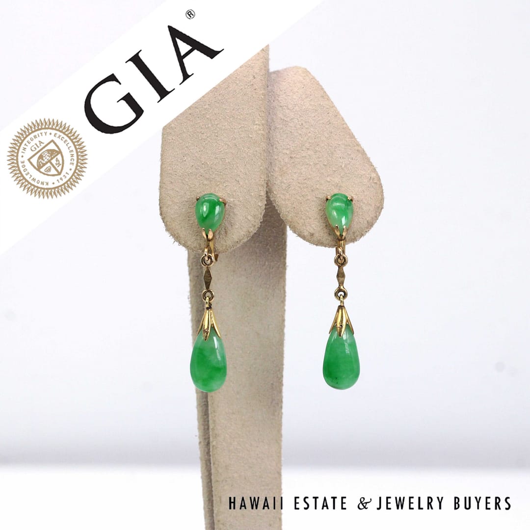 DescriptionGIA Type A natural green jadeite jade dangle earrings set in 10K yellow gold, featuring jade drops on vintage non-pierced screw-back findings.GIA 4.2g 10KYG GREEN JADE DANGLE EARRINGS NON PIERCED SCREWBACK (3095-10)$2,800.001 in stockGIA Type A Green Jadeite Jade Drop Yellow Gold Non-Pierce Earrings quantityAdd to cartBuy withMake OfferSKU: 3095-10Categories: GIA, Pre-owned Jade JewelryRelated Styles36.8g 14KYG LIGHT GREENISH GRAY JADE HINGED BANGLE BRACELET SIZE 7.5$6,500.00GIA 80.5g 14KYG MOTTLED GREEN, LIGHT PURPLISH GRAY AND BROWN JADE TYPE A$6,000.00GIA 4.7g 14KYG GREEN JADE HEART PENDANT$3,100.00GIA 2.5g 14KYG DARK GREEN AND WHITE CARVED JADE AND DIAMOND PENDANT $2,200.00
