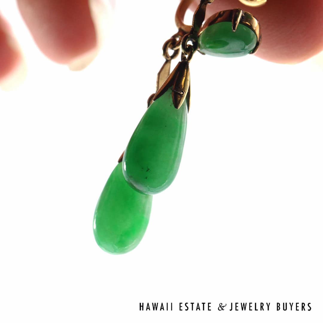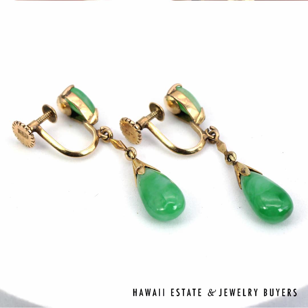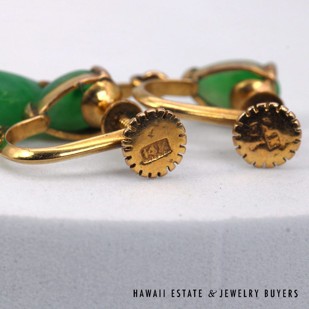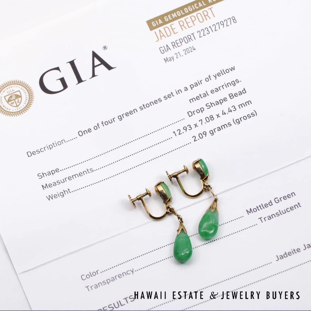 DescriptionGIA Type A natural green jadeite jade dangle earrings set in 10K yellow gold, featuring jade drops on vintage non-pierced screw-back findings.GIA 4.2g 10KYG GREEN JADE DANGLE EARRINGS NON PIERCED SCREWBACK (3095-10)$2,800.001 in stockGIA Type A Green Jadeite Jade Drop Yellow Gold Non-Pierce Earrings quantityAdd to cartBuy withMake OfferSKU: 3095-10Categories: GIA, Pre-owned Jade JewelryRelated Styles36.8g 14KYG LIGHT GREENISH GRAY JADE HINGED BANGLE BRACELET SIZE 7.5$6,500.00GIA 80.5g 14KYG MOTTLED GREEN, LIGHT PURPLISH GRAY AND BROWN JADE TYPE A$6,000.00GIA 4.7g 14KYG GREEN JADE HEART PENDANT$3,100.00GIA 2.5g 14KYG DARK GREEN AND WHITE CARVED JADE AND DIAMOND PENDANT $2,200.00