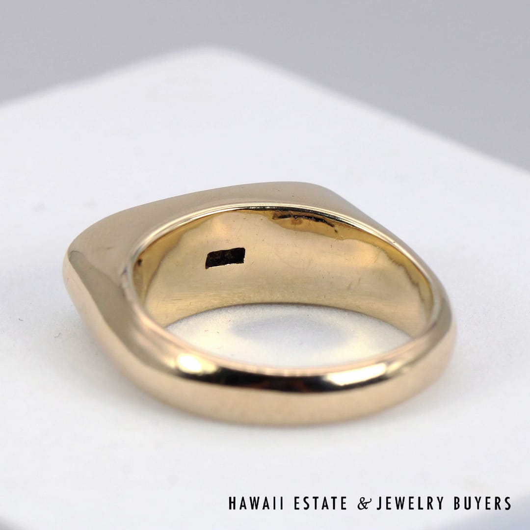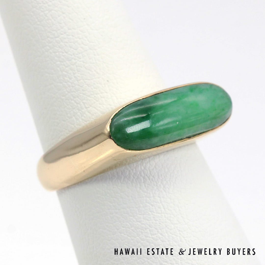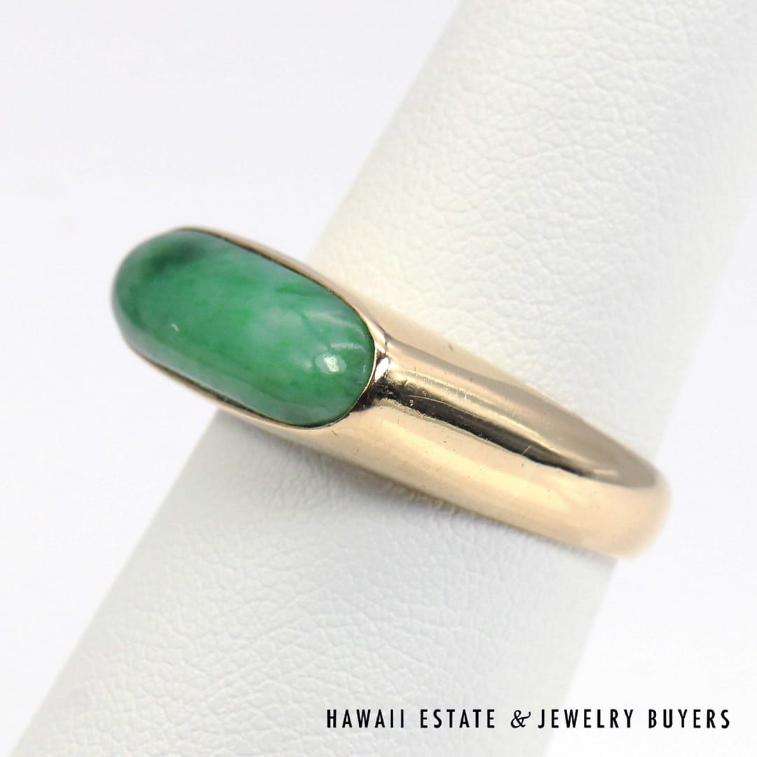 DescriptionElegant vintage ring crafted in solid 14K yellow gold ring featuring a beautiful mottled green jade saddle stone.GIA 5.8g 14KYG MOTTLED GREEN JADE SADDLE RING SIZE 7.25 (3027-03)$1,300.001 in stockGIA Type A Mottled Green Jade Saddle 14K Yellow Gold Ring Size 7.25 quantityAdd to cartBuy withMake OfferSKU: 3027-03Category: Pre-owned Jade JewelryRelated StylesGIA 2.5g 14KYG DARK GREEN AND WHITE CARVED JADE AND DIAMOND PENDANT $2,200.00GIA 68.2g 14KYG PURPLISH GRAY HINGED BANGLE BRACELET SIZE 7.25$12,000.00MING’S 14KYG 94.5g RED JADE DRAGON & PHOENIX CARVED MEDALLION$2,300.00MING’S 11g 14KYG LIGHT GRAY JADE BAMBOO PEARL CLUSTER CLIP EARRINGS w/MING’S BOX$725.00
