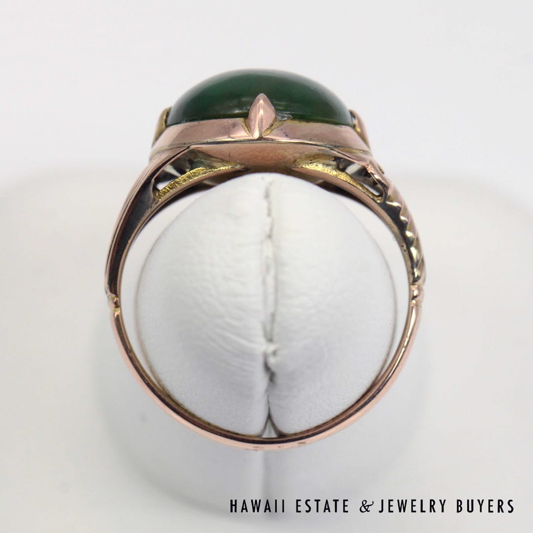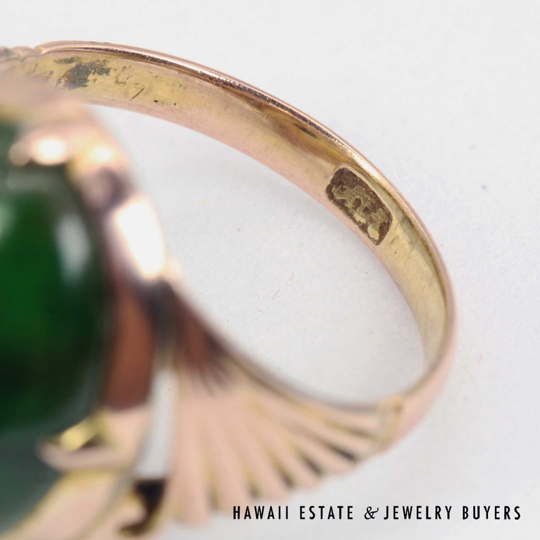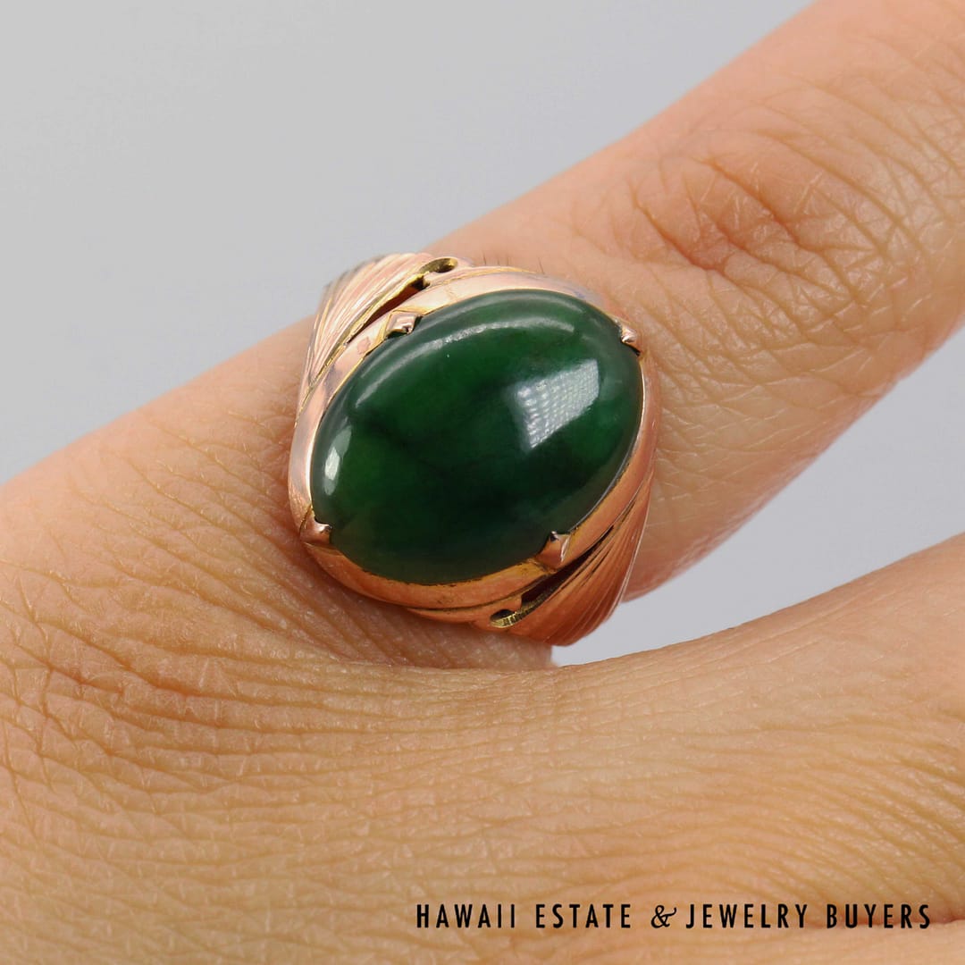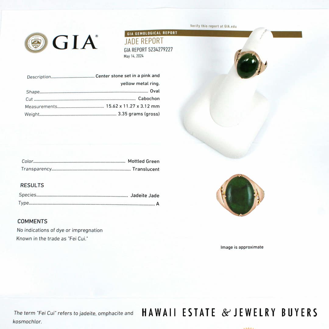 DescriptionVintage 7K rose and yellow gold ring featuring a deep green jade cabochon in an elegant fan-accent setting.GIA 3.4g 7K ROSE AND YELLOW GOLD 15X11mm OVAL GREEN JADE RING SIZE 5.5 (011724-02)$2,100.001 in stockGIA Type A Oval Green Jade Measures 15x11mm 7K Rose and Yellow Gold Ring Size 5.5 quantityAdd to cartBuy withMake OfferSKU: 011724-02Category: Pre-owned Jade JewelryRelated StylesGIA 68.2g 14KYG MOTTLED GREEN & LIGHT PURPLISH GRAY TYPE A HINGED BANGLE BRACELET SIZE 7.5$8,000.00MING’S 11g 14KYG LIGHT GRAY JADE BAMBOO PEARL CLUSTER CLIP EARRINGS w/MING’S BOX$725.00GIA 58.8g 14KYG ORANGY BROWN & WHITE JADE HINGED BANGLE BRACELET SIZE 8$4,500.00GIA GREEN-GRAY JADE BANGLE BRACELET SIZE 7.25$4,900.00