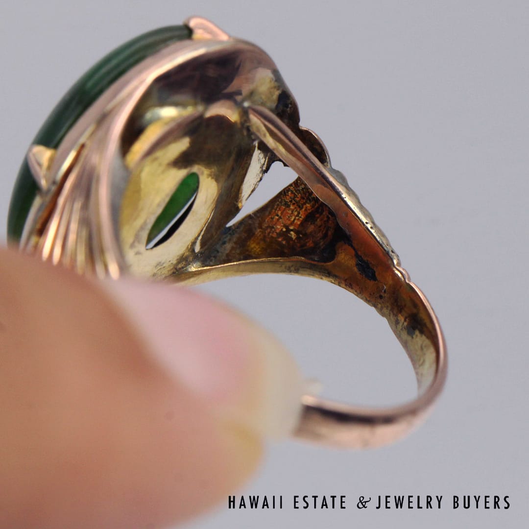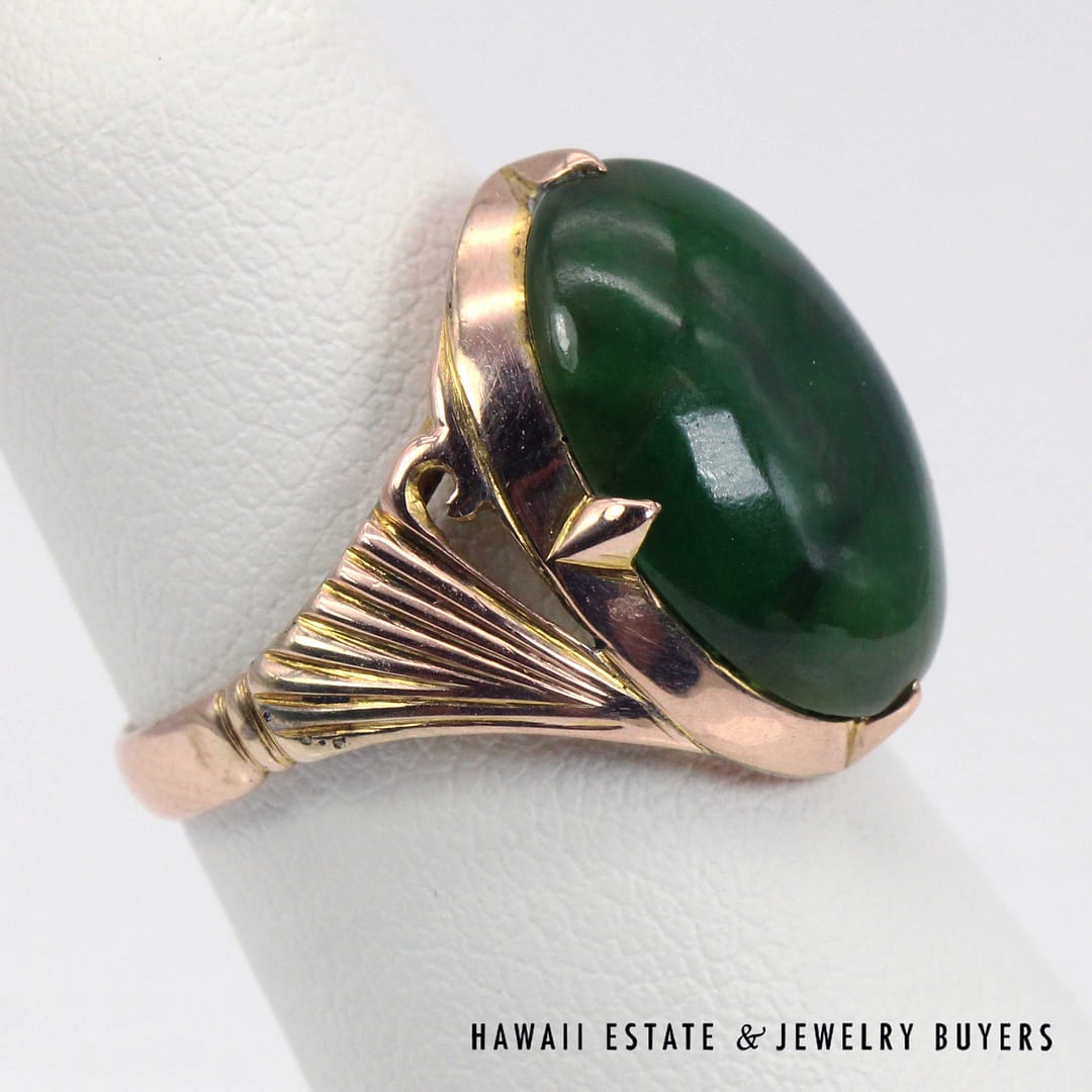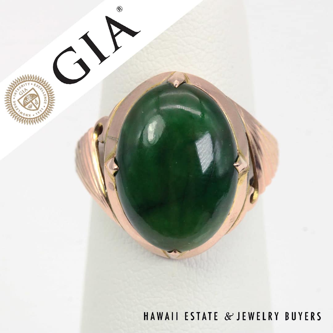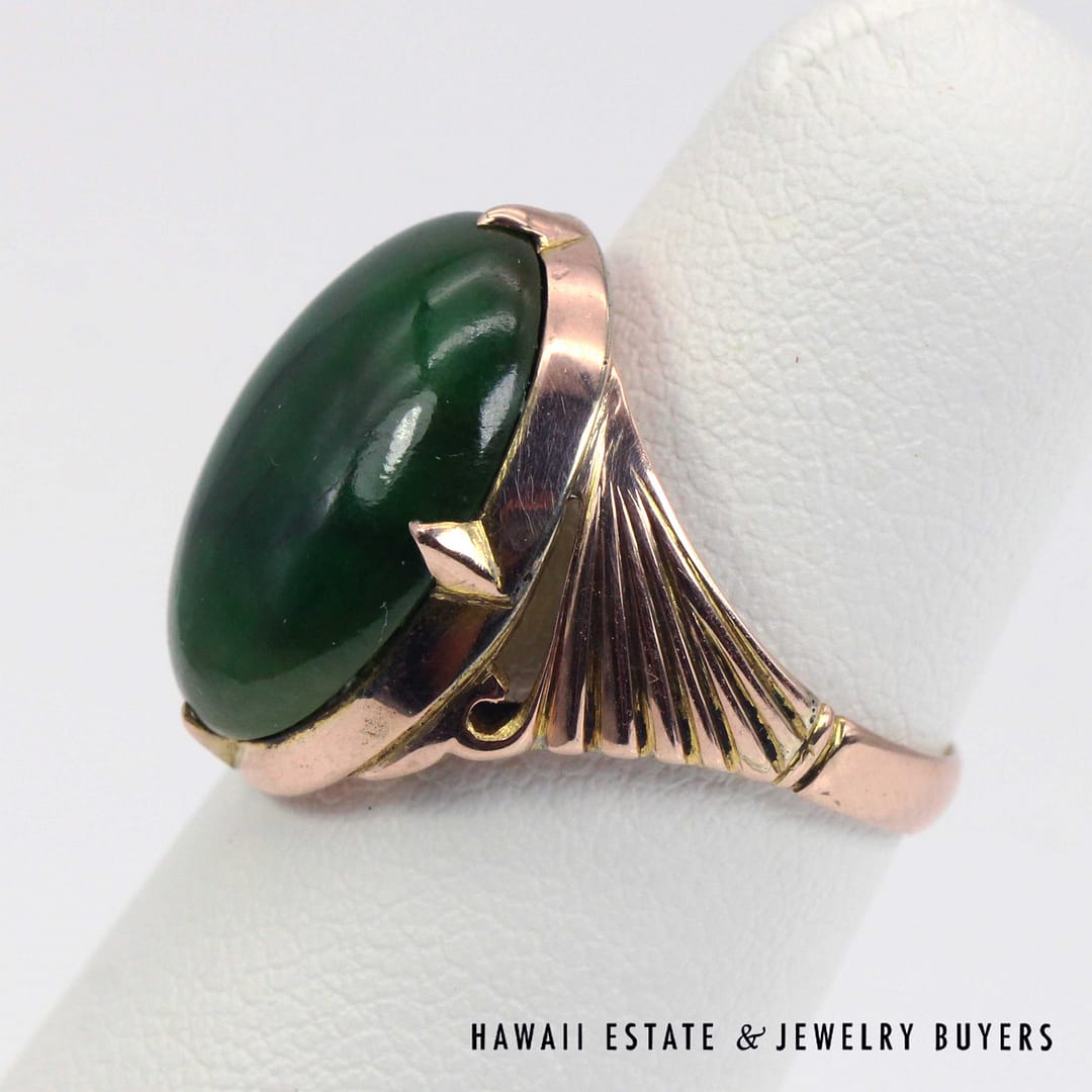 DescriptionVintage 7K rose and yellow gold ring featuring a deep green jade cabochon in an elegant fan-accent setting.GIA 3.4g 7K ROSE AND YELLOW GOLD 15X11mm OVAL GREEN JADE RING SIZE 5.5 (011724-02)$2,100.001 in stockGIA Type A Oval Green Jade Measures 15x11mm 7K Rose and Yellow Gold Ring Size 5.5 quantityAdd to cartBuy withMake OfferSKU: 011724-02Category: Pre-owned Jade JewelryRelated StylesGIA 68.2g 14KYG MOTTLED GREEN & LIGHT PURPLISH GRAY TYPE A HINGED BANGLE BRACELET SIZE 7.5$8,000.00MING’S 11g 14KYG LIGHT GRAY JADE BAMBOO PEARL CLUSTER CLIP EARRINGS w/MING’S BOX$725.00GIA 58.8g 14KYG ORANGY BROWN & WHITE JADE HINGED BANGLE BRACELET SIZE 8$4,500.00GIA GREEN-GRAY JADE BANGLE BRACELET SIZE 7.25$4,900.00