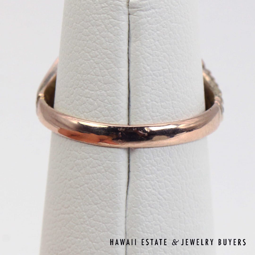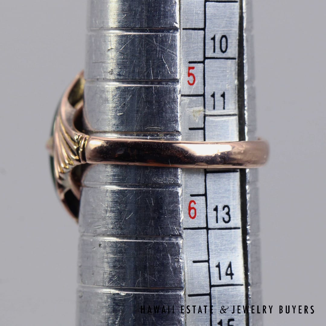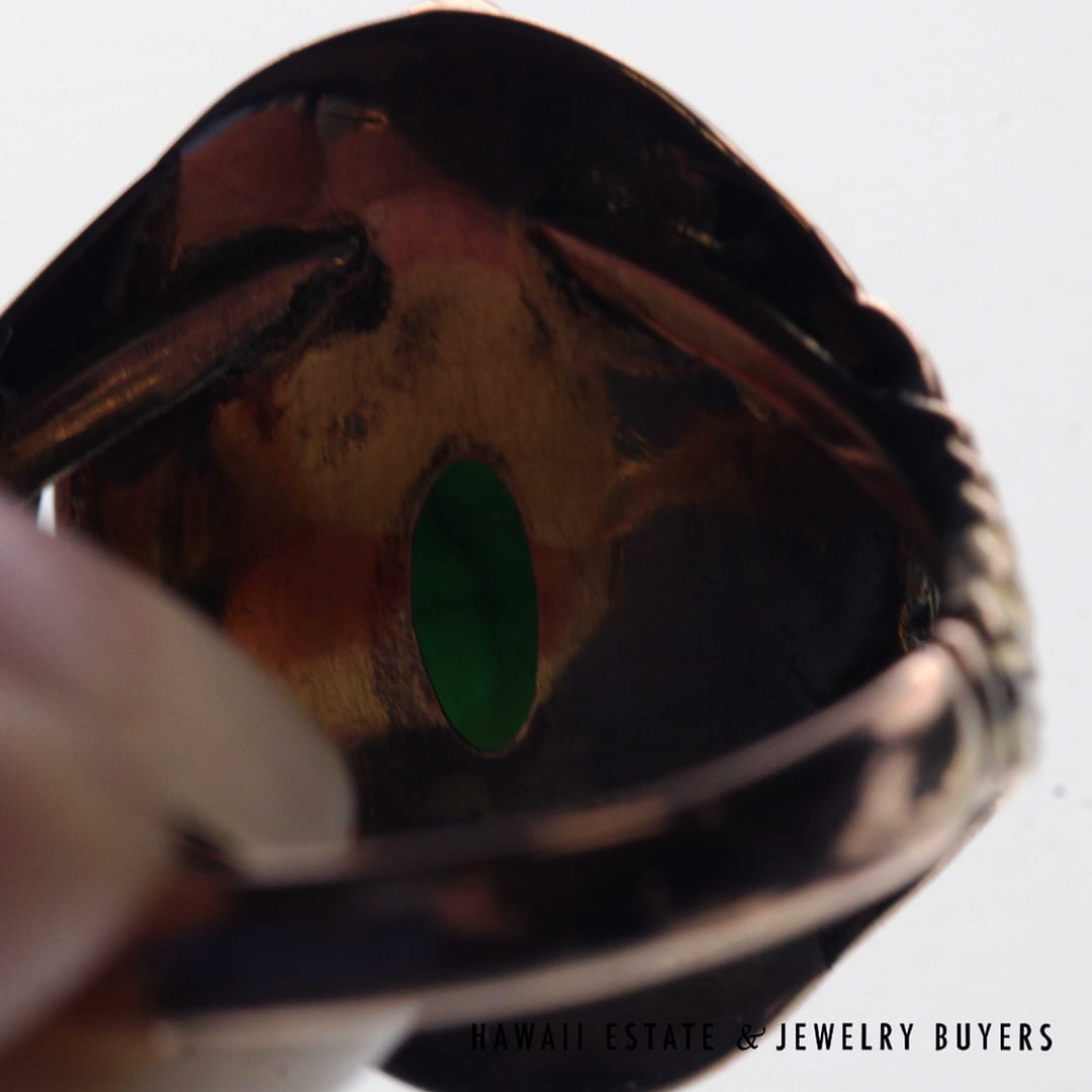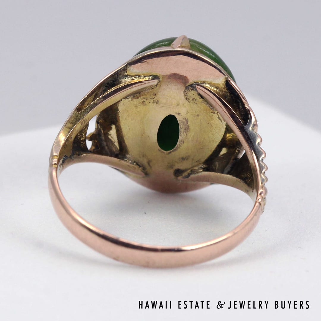 DescriptionVintage 7K rose and yellow gold ring featuring a deep green jade cabochon in an elegant fan-accent setting.GIA 3.4g 7K ROSE AND YELLOW GOLD 15X11mm OVAL GREEN JADE RING SIZE 5.5 (011724-02)$2,100.001 in stockGIA Type A Oval Green Jade Measures 15x11mm 7K Rose and Yellow Gold Ring Size 5.5 quantityAdd to cartBuy withMake OfferSKU: 011724-02Category: Pre-owned Jade JewelryRelated StylesGIA 68.2g 14KYG MOTTLED GREEN & LIGHT PURPLISH GRAY TYPE A HINGED BANGLE BRACELET SIZE 7.5$8,000.00MING’S 11g 14KYG LIGHT GRAY JADE BAMBOO PEARL CLUSTER CLIP EARRINGS w/MING’S BOX$725.00GIA 58.8g 14KYG ORANGY BROWN & WHITE JADE HINGED BANGLE BRACELET SIZE 8$4,500.00GIA GREEN-GRAY JADE BANGLE BRACELET SIZE 7.25$4,900.00