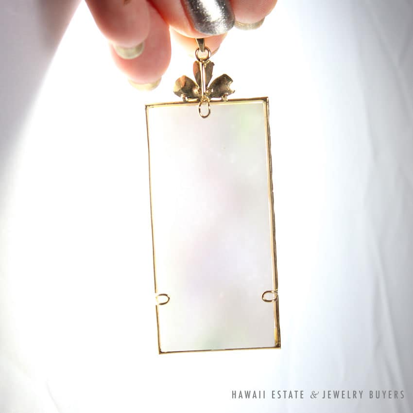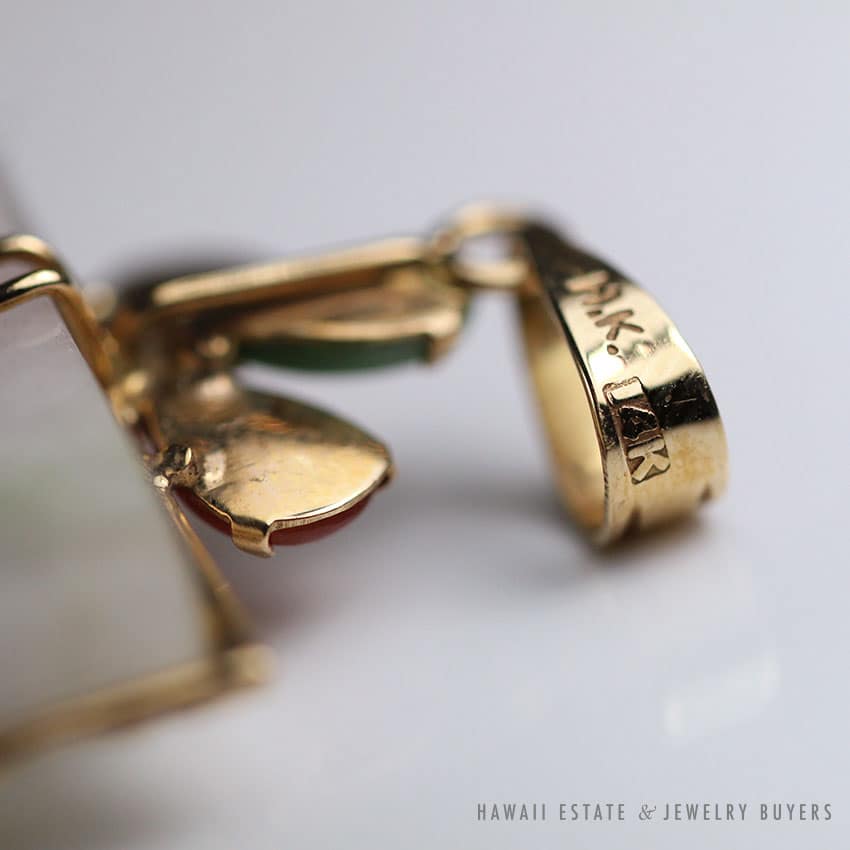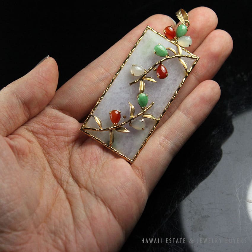 DescriptionGRADE A JADE CIRCA 1975STAMPED 14K H.K.$4,000.001 in stockGRADE A JADEITE JADE LAVENDER & MULTI-COLOR CABOCHON 14K YELLOW GOLD PLAQUE PENDANT quantityAdd to cartMake OfferSKU: 2015-05Category: Pre-owned Vintage JewelryRelated Styles22.8g 18KWG TYPE A IMPERIAL JADE BUDDAH HAND CARVING w/2.50ctw DIAMOND PENDANT MEASURES 58x28mm (1395-01)$13,900.00Antique Victorian Pearl Old Mine Cut Diamond Circle Pin$2,100.00Antique Ceremonial Certified Nephrite Jade Flute$16,000.00GIA CERTIFIED MARQUISE NATURAL JADE APPLE GREEN COLOR JADE RING GIA JADE SZ 5.25$1,000.00