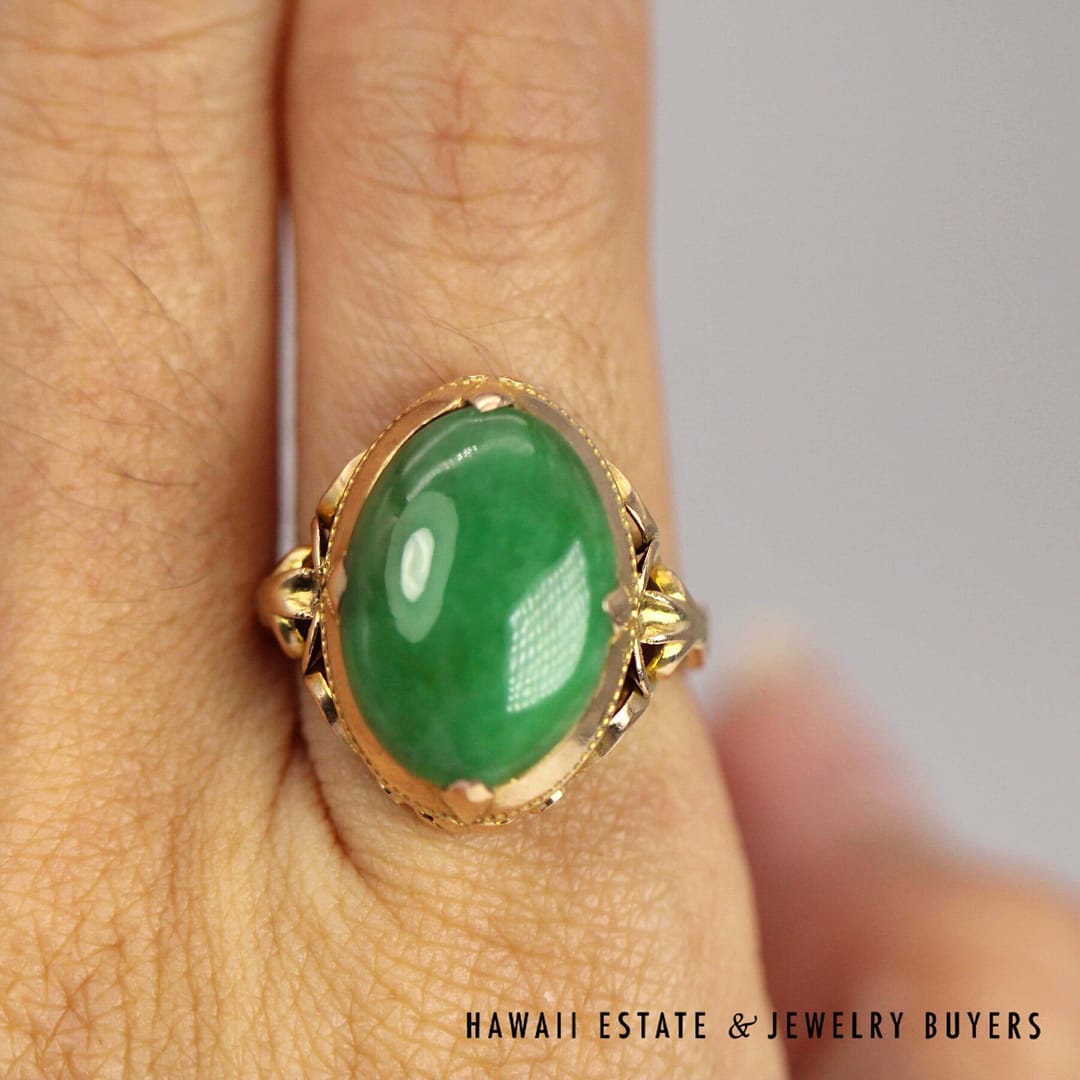 Gorgeous green jade ring crafted from 14K Yellow gold, size 5.5 – a stunning addition to any jade or fine jewelry collection. Item guaranteed by seller to be TYPE A. Cab measures approx. 16 x 11.5mm