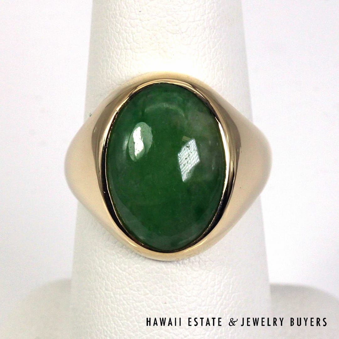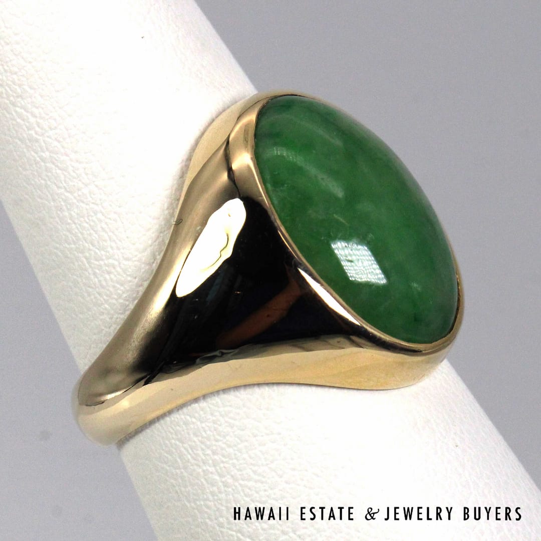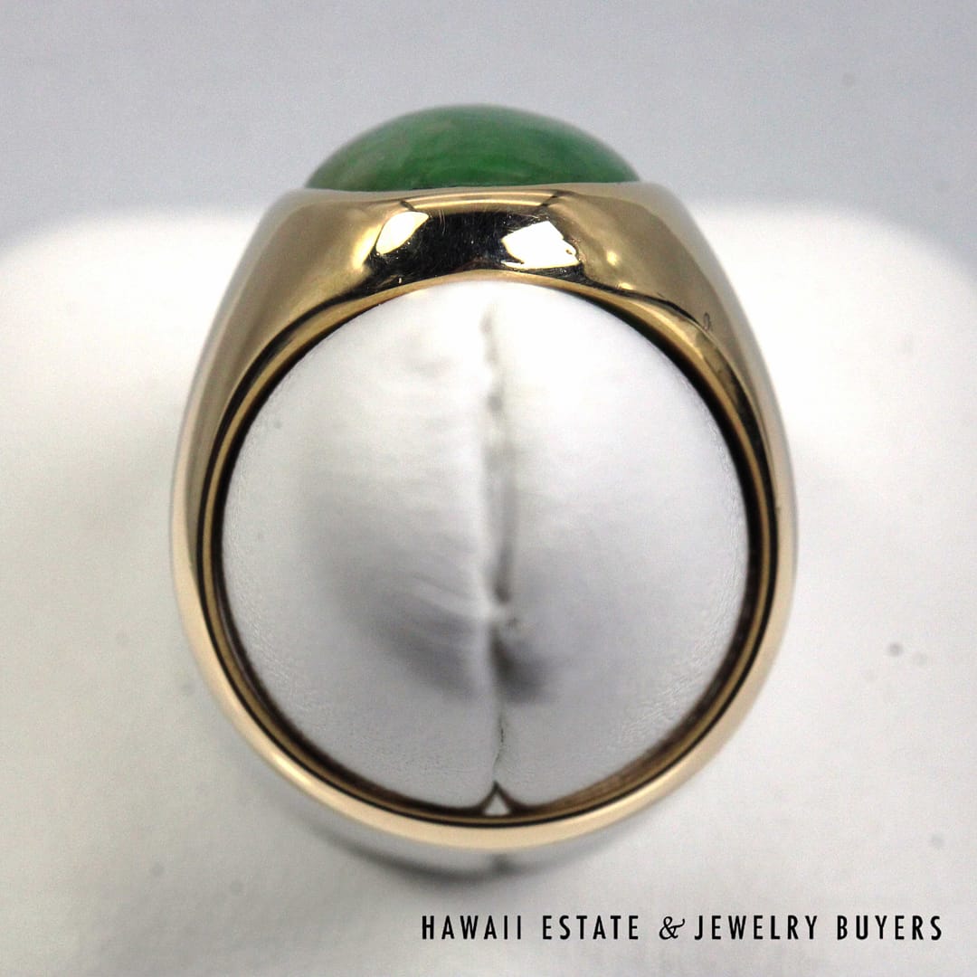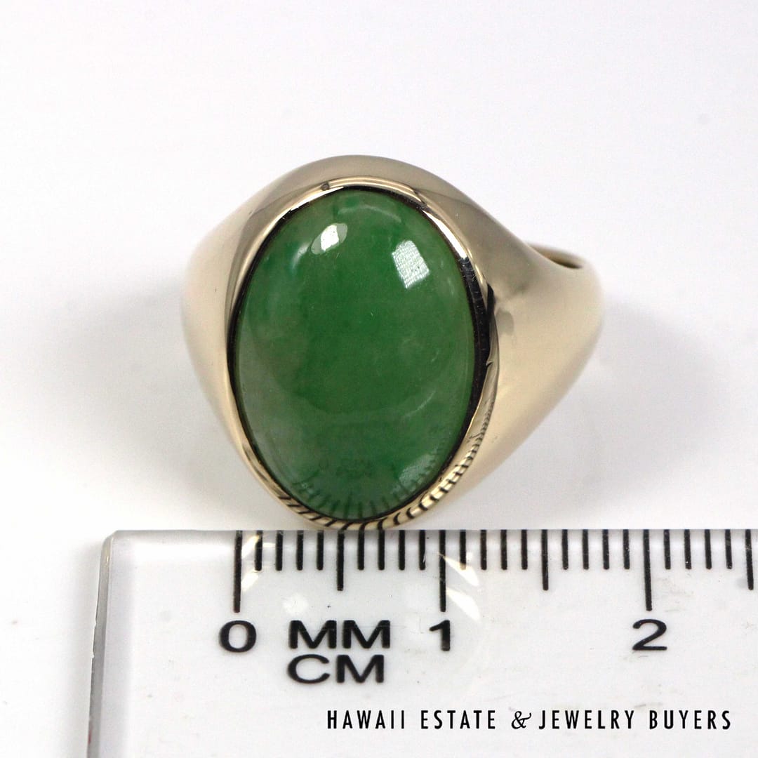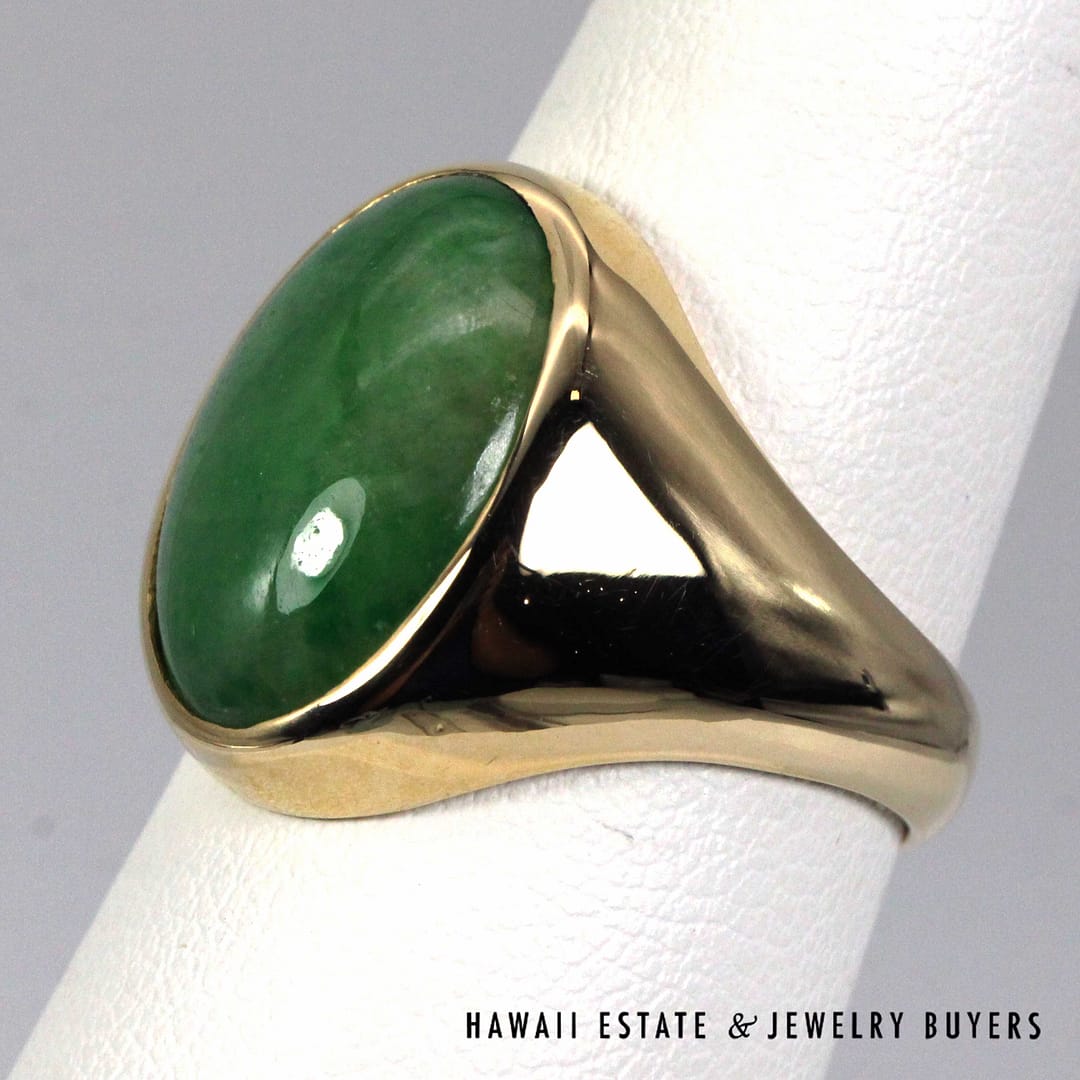 DescriptionElegant 14K yellow gold ring set with a smooth oval green jade cabochon, offering a classic, refined look in size 7.75.10.1g 14KYG 16x11mm OVAL GREEN JADE CAB RING SIZE 7.75 ( 3149-01)$1,600.001 in stockGreen Jade Oval 14K Yellow Gold Cabochon Ring Size 7.75 quantityAdd to cartBuy withMake OfferSKU: 3149-01Category: Pre-owned Jade JewelryRelated Styles5.4g 14KYG GREEN JADE MARQUISE CABOCHON PENDANT$499.004.8g 14KYG JADE WITH 0.08ctw I2/HI DIAMOND RING SIZE 6.5$799.00GIA 68.2g 14KYG MOTTLED GREEN & LIGHT PURPLISH GRAY TYPE A HINGED BANGLE BRACELET SIZE 7.5$8,000.00MING’S 11g 14KYG LIGHT GRAY JADE BAMBOO PEARL CLUSTER CLIP EARRINGS w/MING’S BOX$725.00