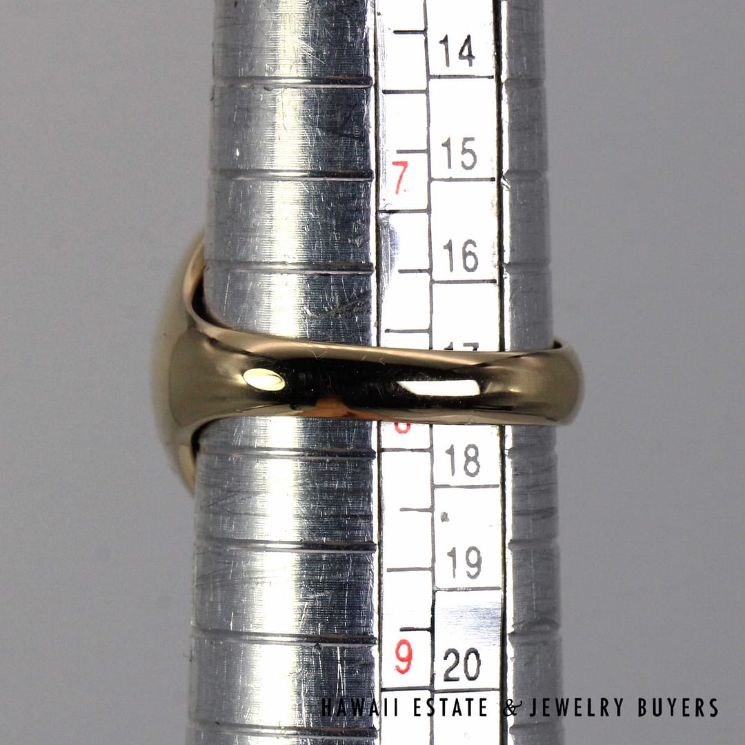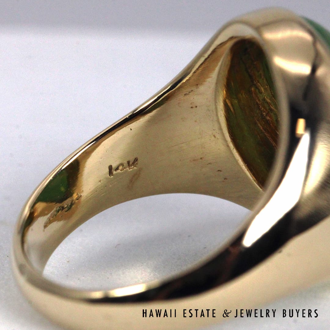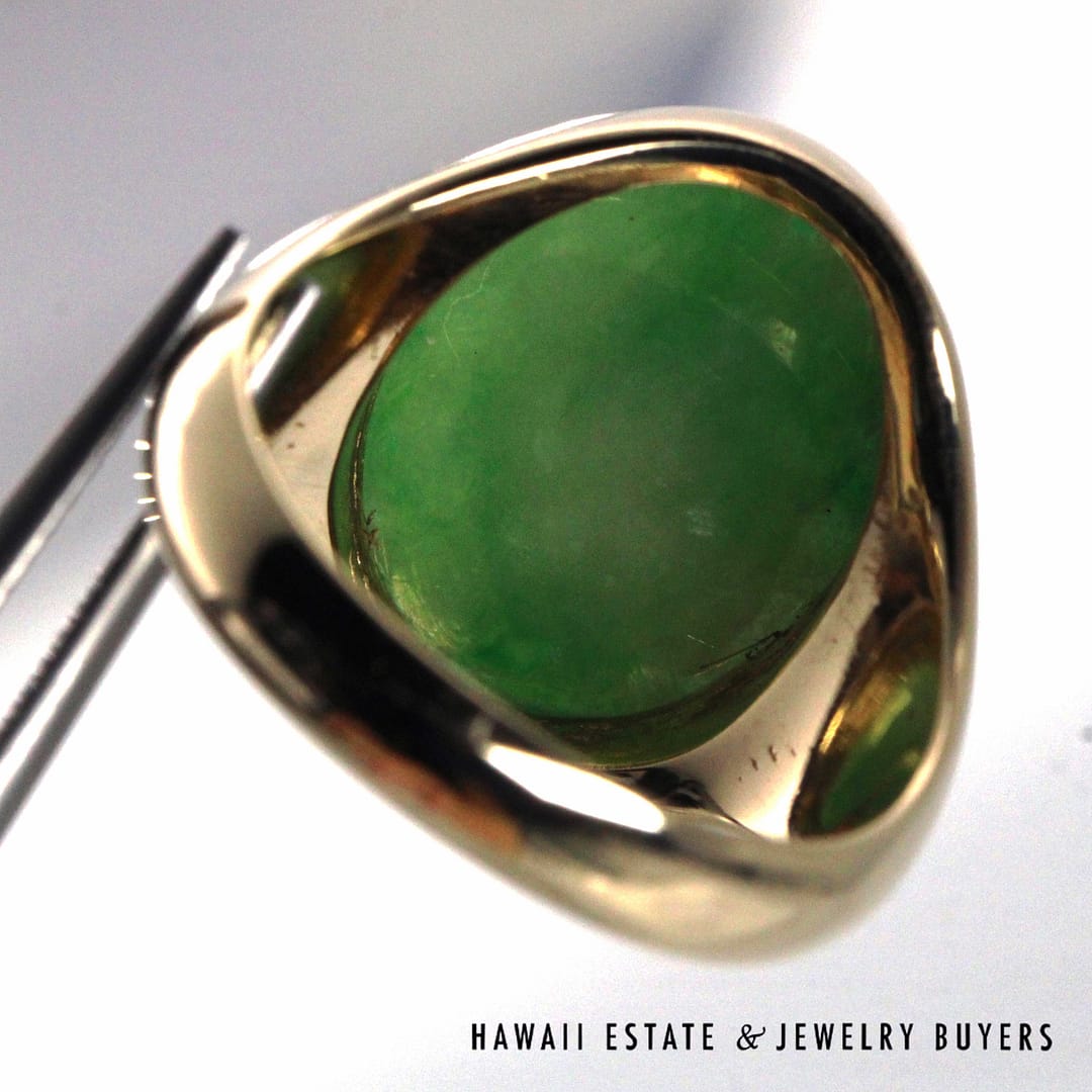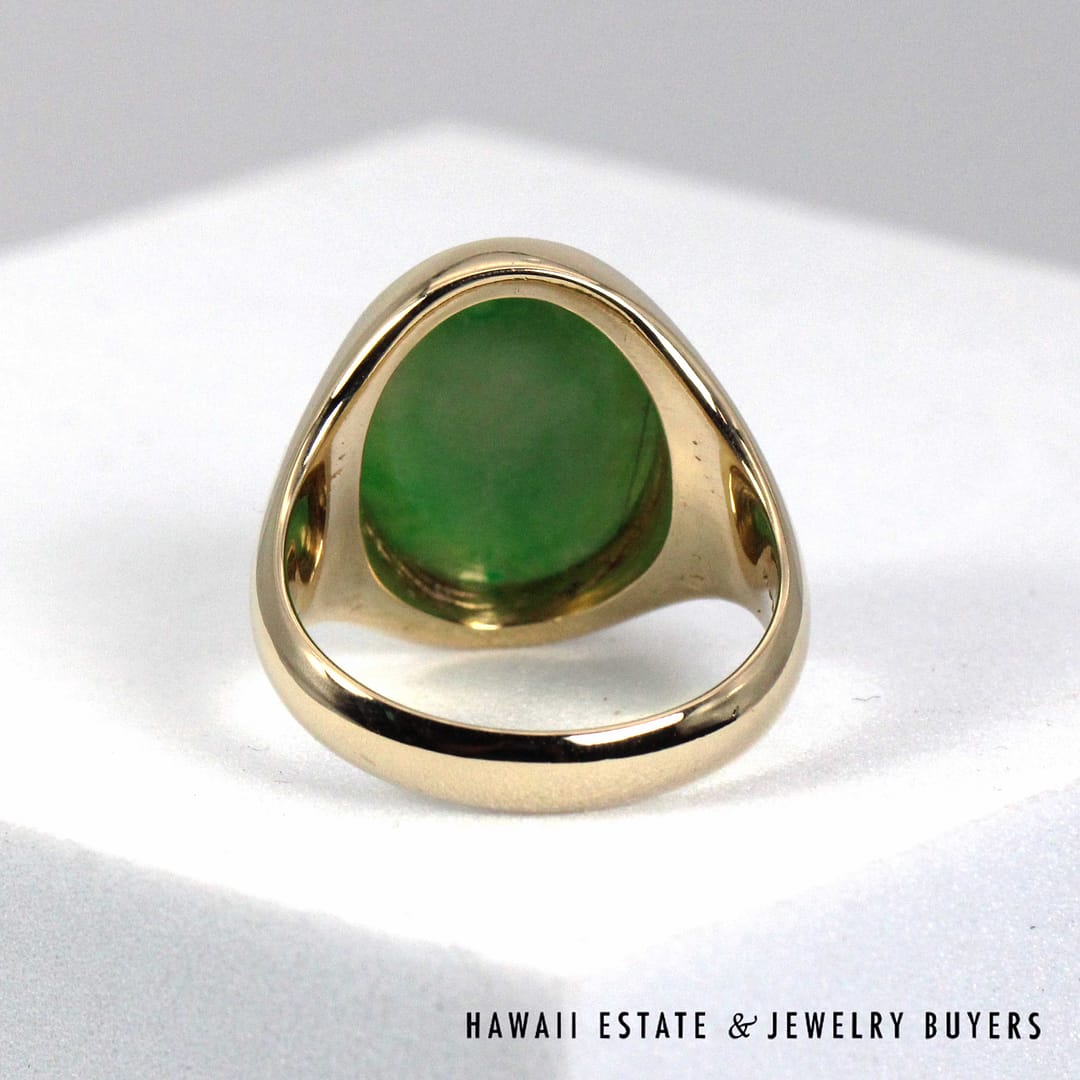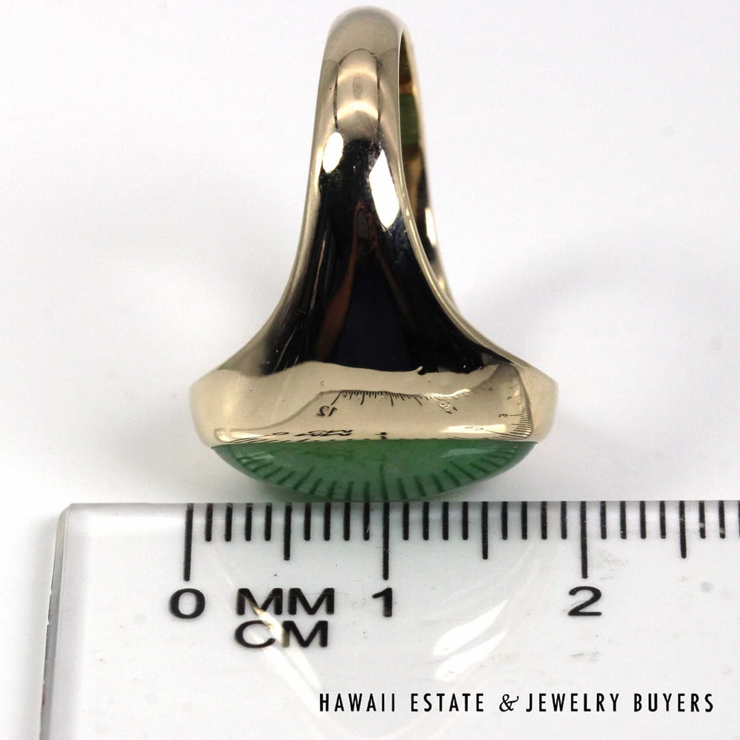 DescriptionElegant 14K yellow gold ring set with a smooth oval green jade cabochon, offering a classic, refined look in size 7.75.10.1g 14KYG 16x11mm OVAL GREEN JADE CAB RING SIZE 7.75 ( 3149-01)$1,600.001 in stockGreen Jade Oval 14K Yellow Gold Cabochon Ring Size 7.75 quantityAdd to cartBuy withMake OfferSKU: 3149-01Category: Pre-owned Jade JewelryRelated Styles5.4g 14KYG GREEN JADE MARQUISE CABOCHON PENDANT$499.004.8g 14KYG JADE WITH 0.08ctw I2/HI DIAMOND RING SIZE 6.5$799.00GIA 68.2g 14KYG MOTTLED GREEN & LIGHT PURPLISH GRAY TYPE A HINGED BANGLE BRACELET SIZE 7.5$8,000.00MING’S 11g 14KYG LIGHT GRAY JADE BAMBOO PEARL CLUSTER CLIP EARRINGS w/MING’S BOX$725.00