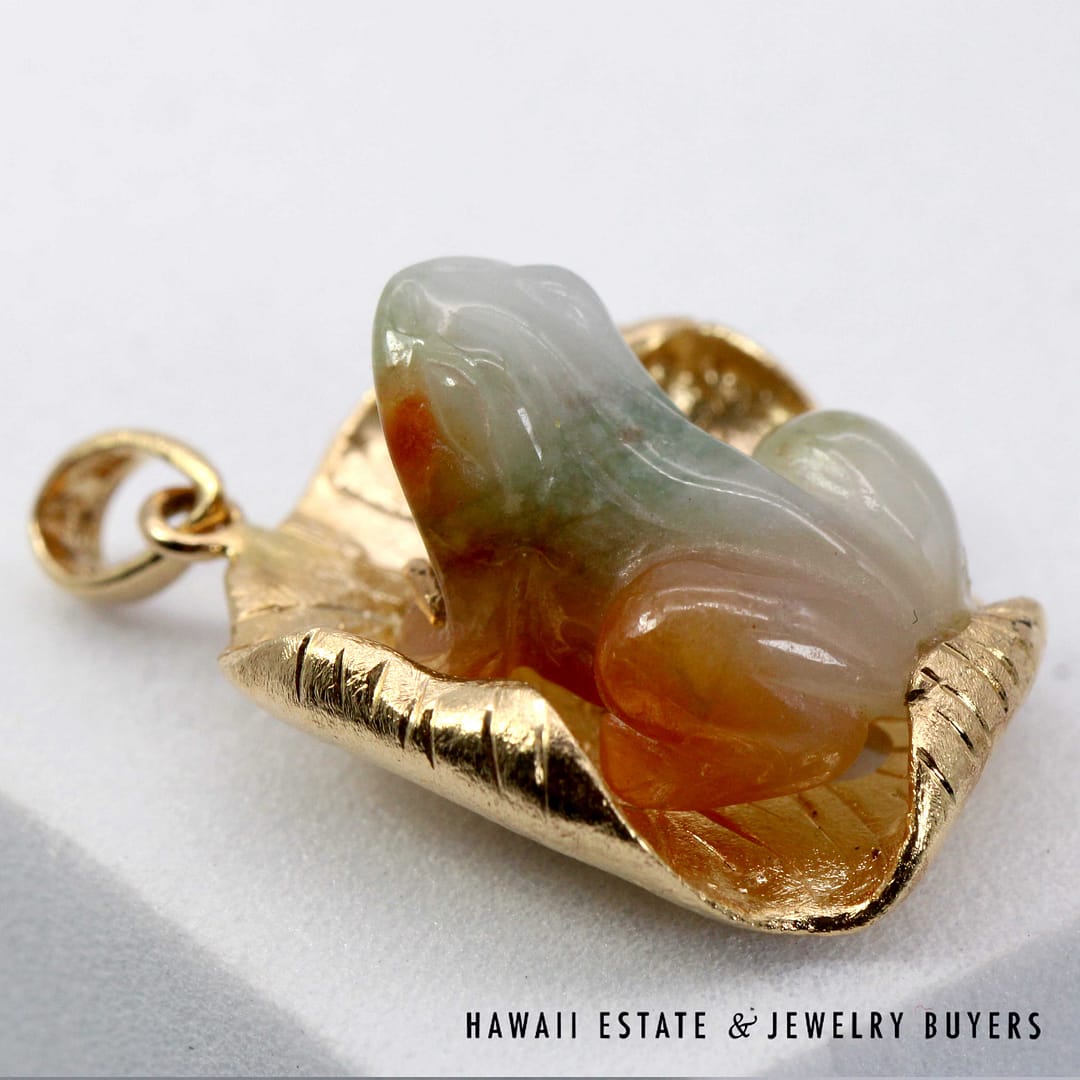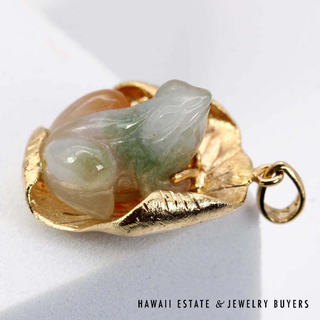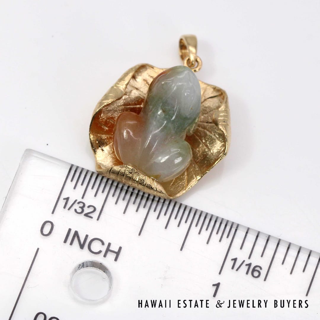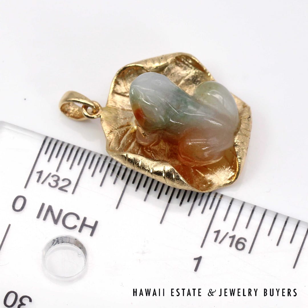 Vintage pendant featuring a hand-carved multicolor jade frog resting on a textured 14K yellow gold lily pad, symbolizing prosperity and good fortune.