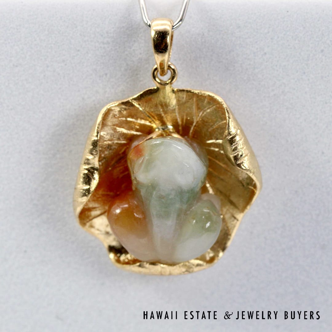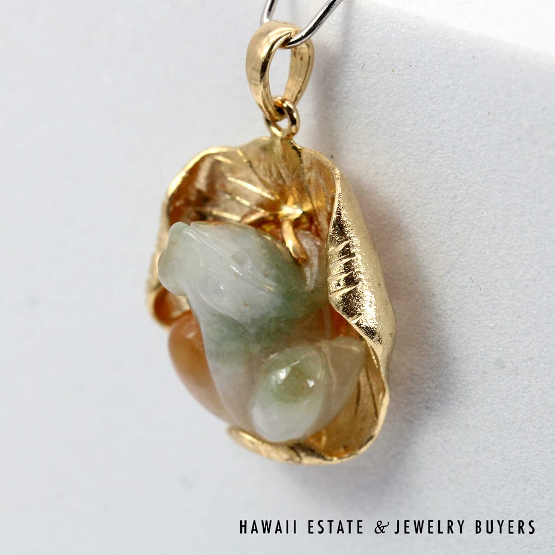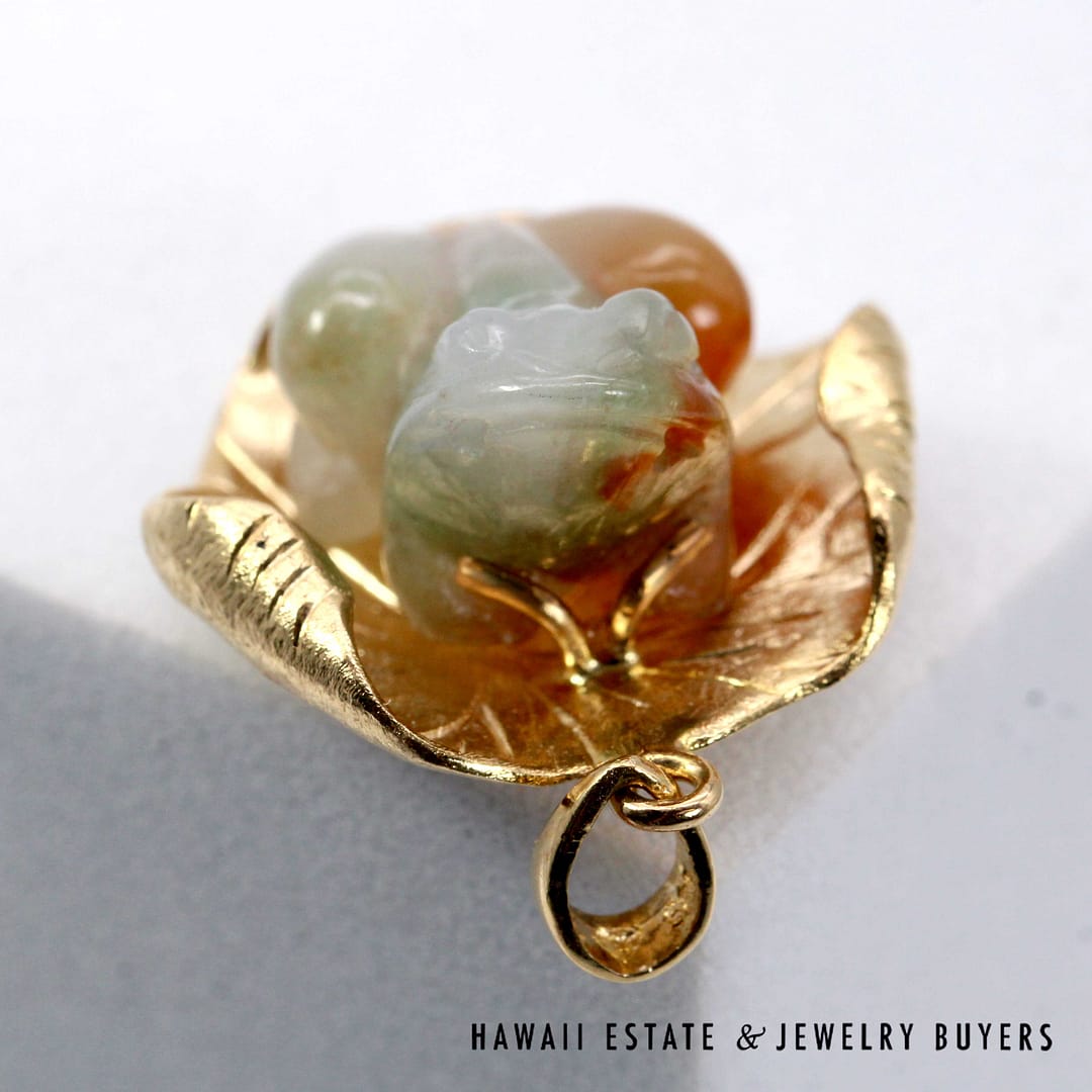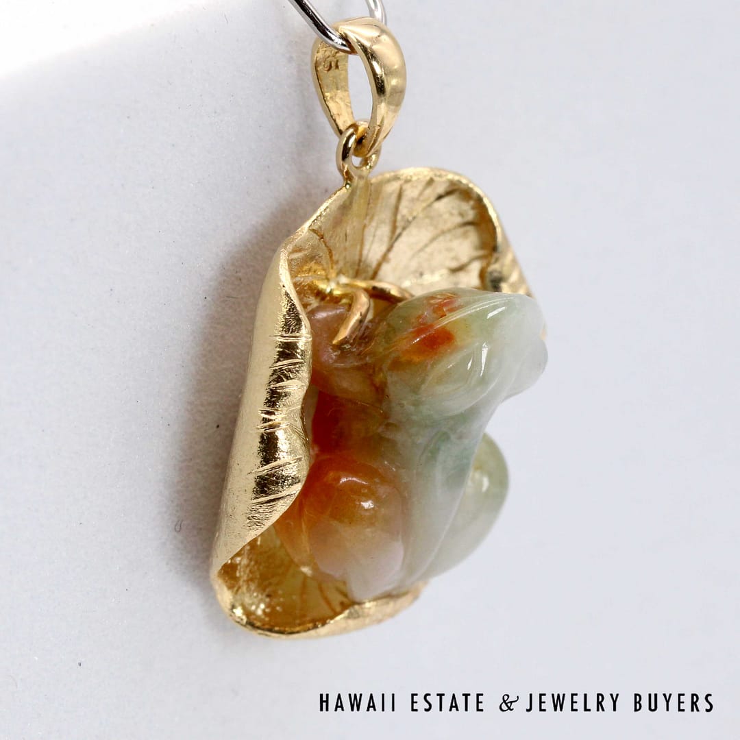 Vintage pendant featuring a hand-carved multicolor jade frog resting on a textured 14K yellow gold lily pad, symbolizing prosperity and good fortune.