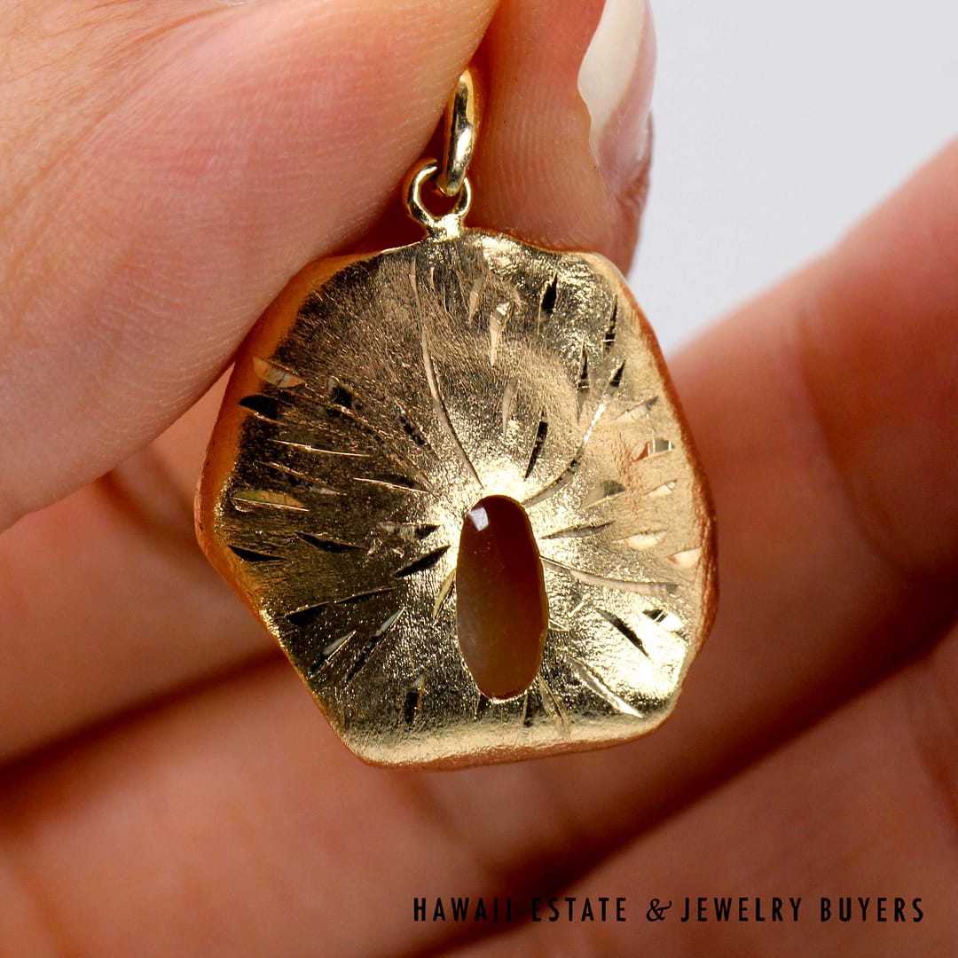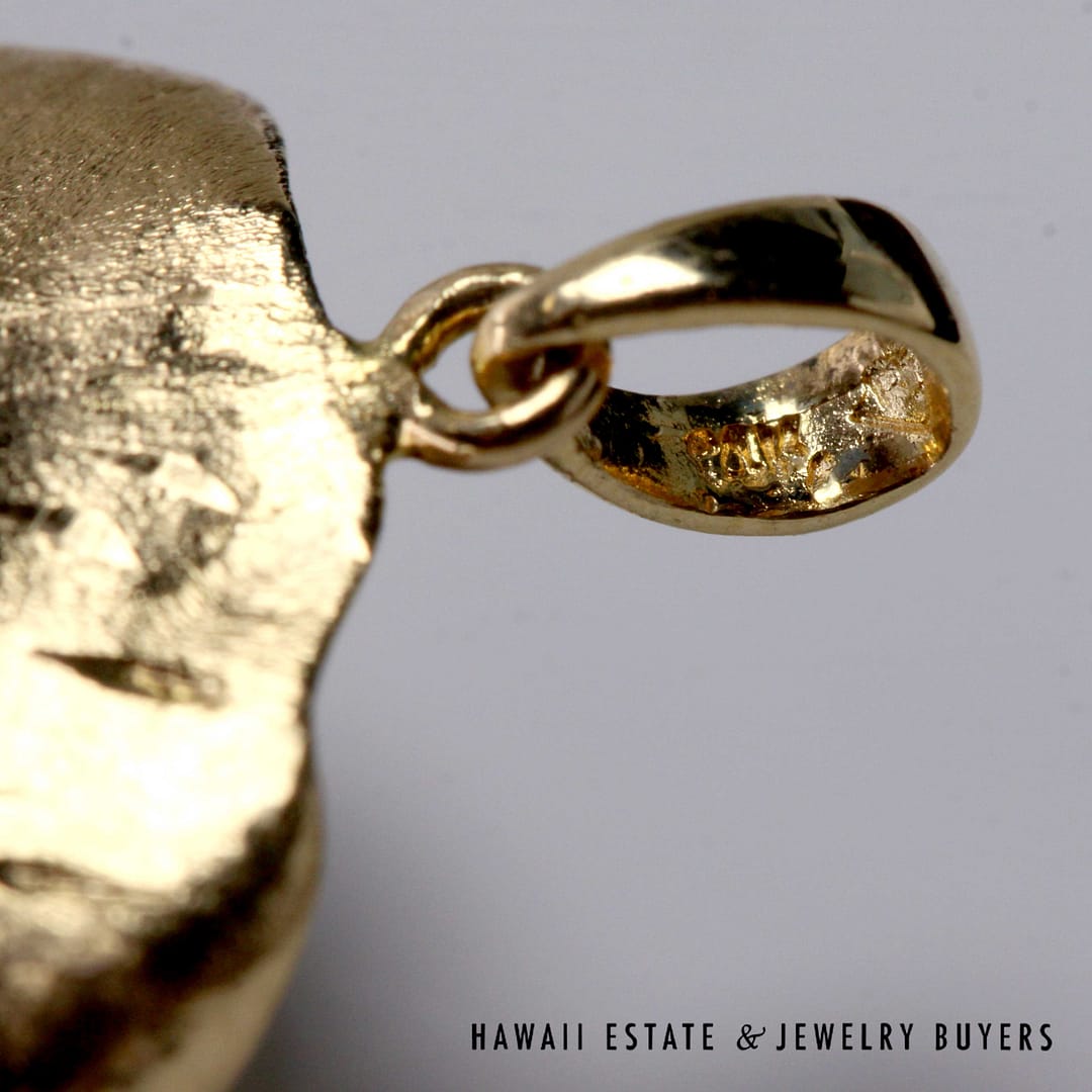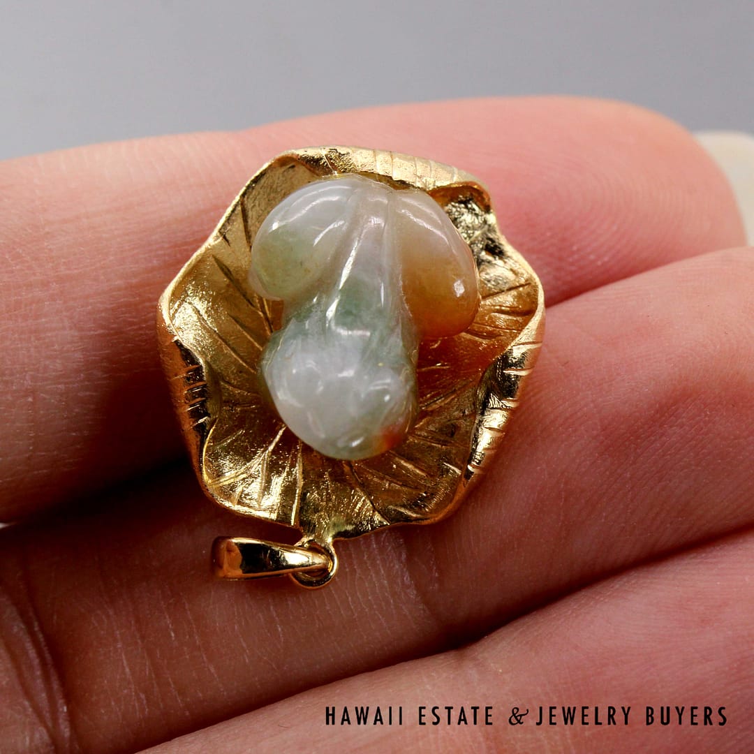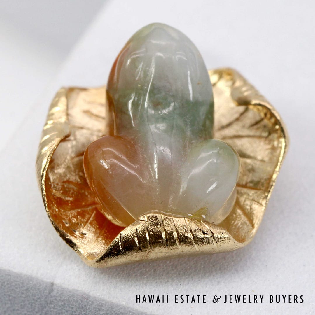 Vintage pendant featuring a hand-carved multicolor jade frog resting on a textured 14K yellow gold lily pad, symbolizing prosperity and good fortune.
