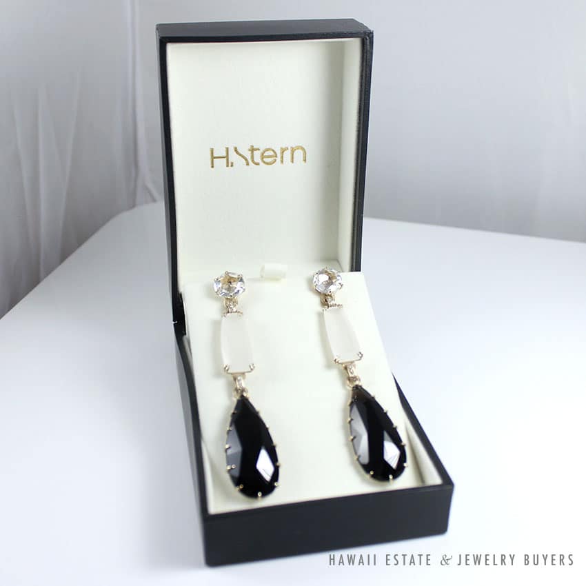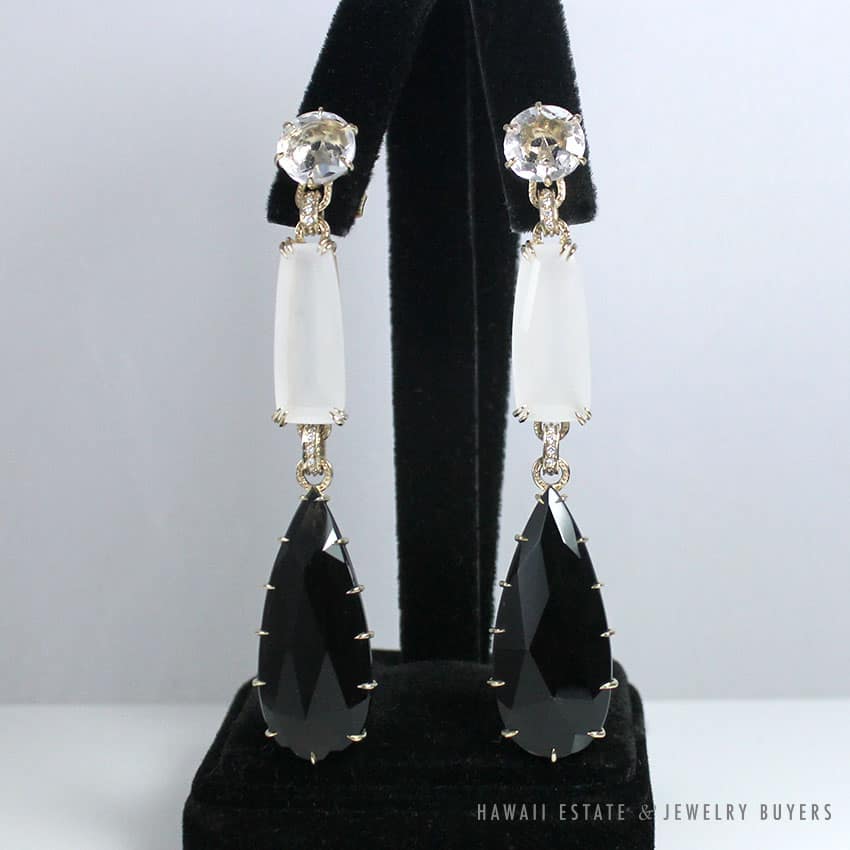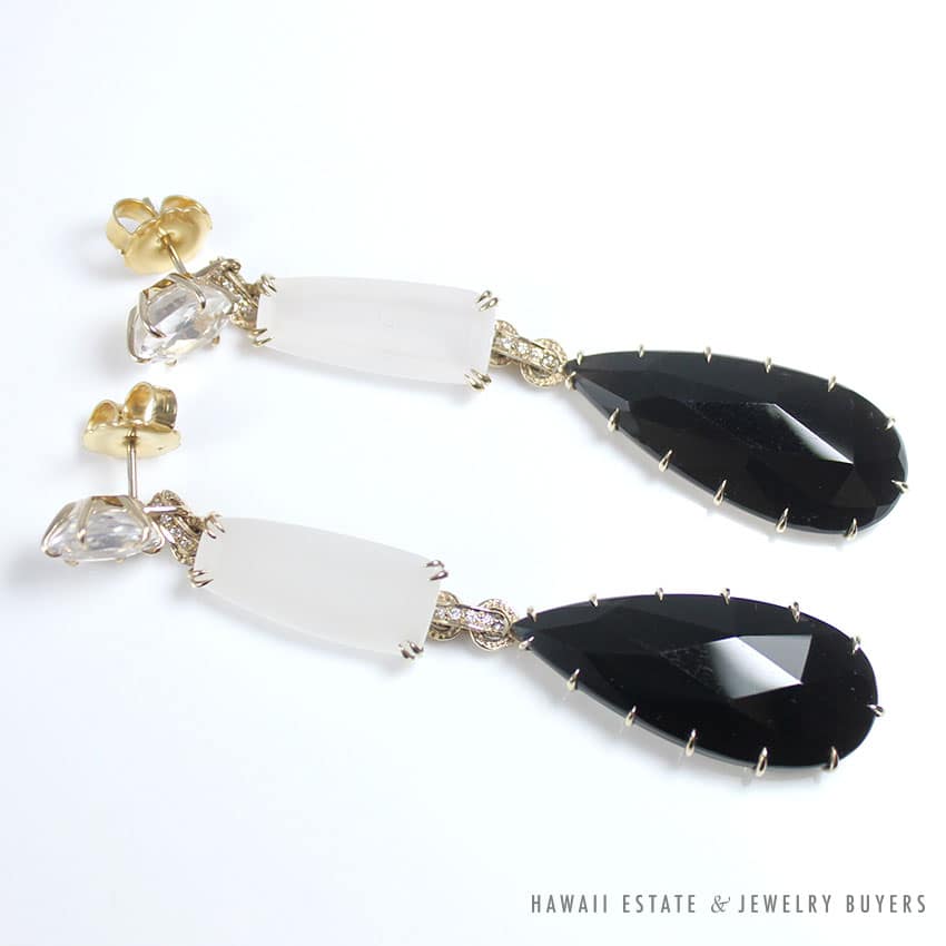 Beautiful H.Stern dangle earrings from the Cobblestone collection with Smoky Quartz, Rock Crystal, Diamonds, and Moonstone.