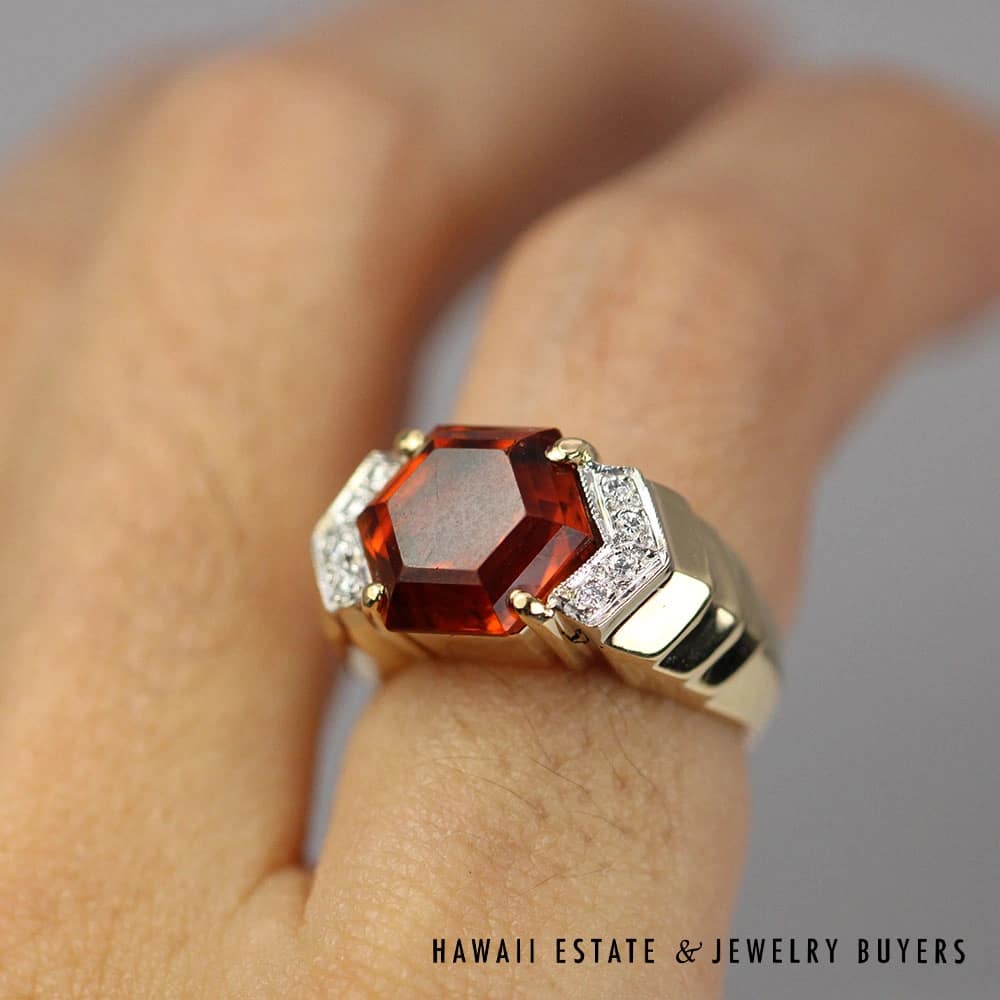 Beautiful color Hexagonal Madeira Citrine ring in 14K yellow gold, accompanied by 0.08ctw of diamonds. A perfect statement ring for any collection!