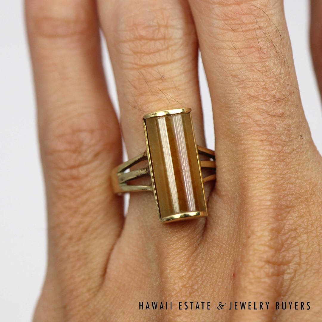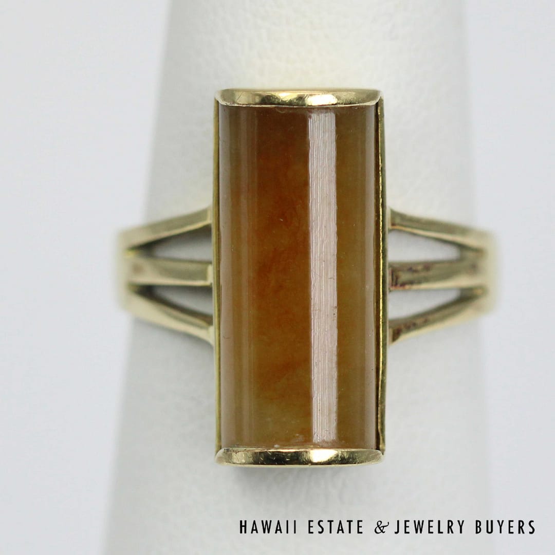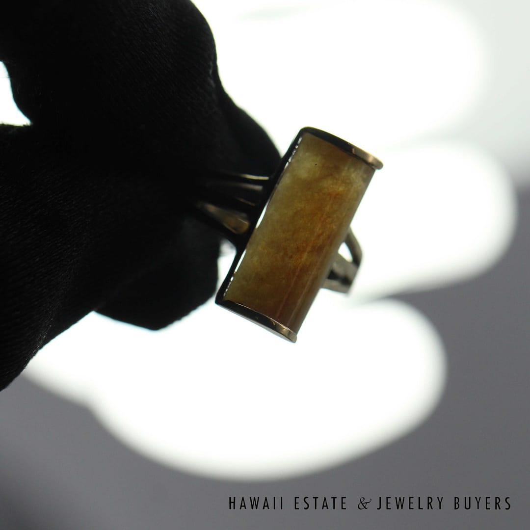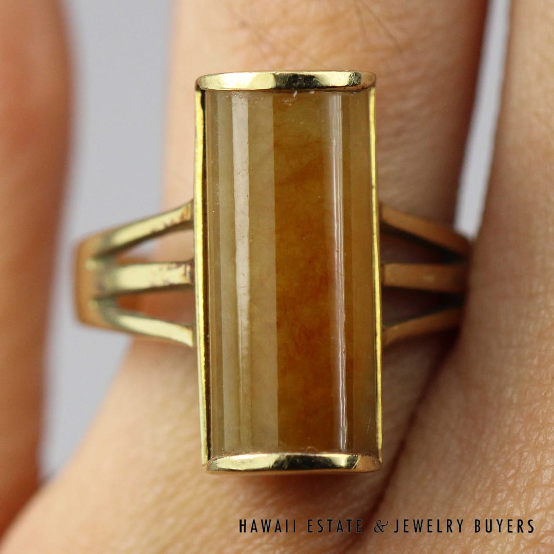DescriptionVintage 14K yellow gold ring featuring a bold rectangular honey jade stone in a sleek modernist setting for a striking statement look.4.8g 14KYG HONEY JADE RING SIZE 6.25 (051024-08)$600.001 in stockHoney Jade 14K Yellow Gold Ring Size 6.25 quantityAdd to cartBuy withMake OfferSKU: 051024-08Category: Pre-owned Jade JewelryRelated StylesGIA 68.2g 14KYG MOTTLED GREEN & LIGHT PURPLISH GRAY TYPE A HINGED BANGLE BRACELET SIZE 7.5$8,000.00GIA 44g 14KYG MOTTLED GRAY AND ORANGY BROWN JADE WITH DRAGON MOTIF$6,700.00GIA 80g 14KYG MOTTLED ORANGY BROWN JADE HINGED BANGLE BRACELET SIZE 8$6,000.00GIA 4.2g 14KWG 13x10MM OVAL GREEN CABOCHON JADE 0.50ctw DIAMOND RING SIZE 5$3,100.00