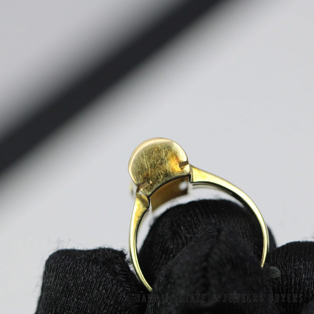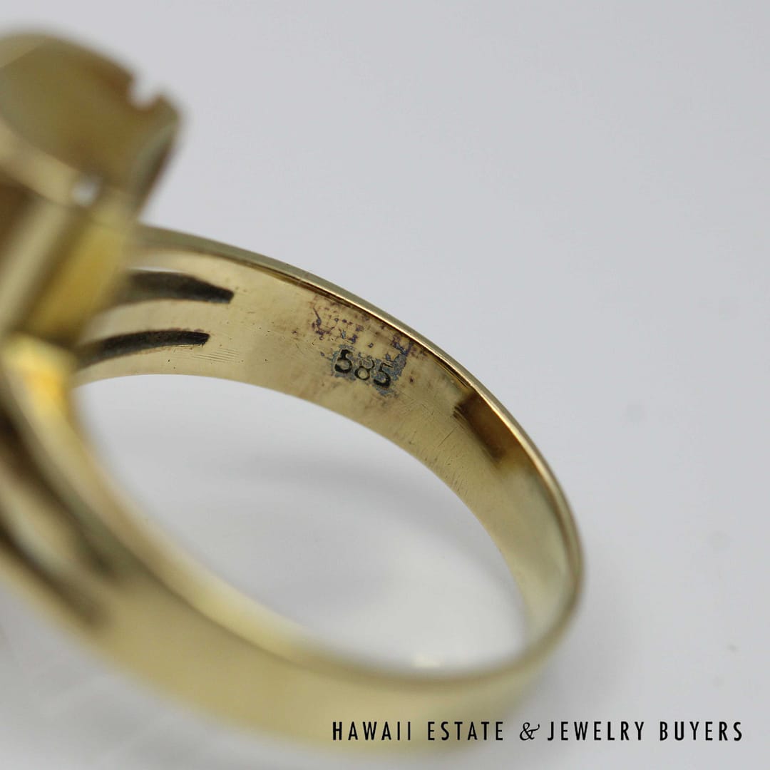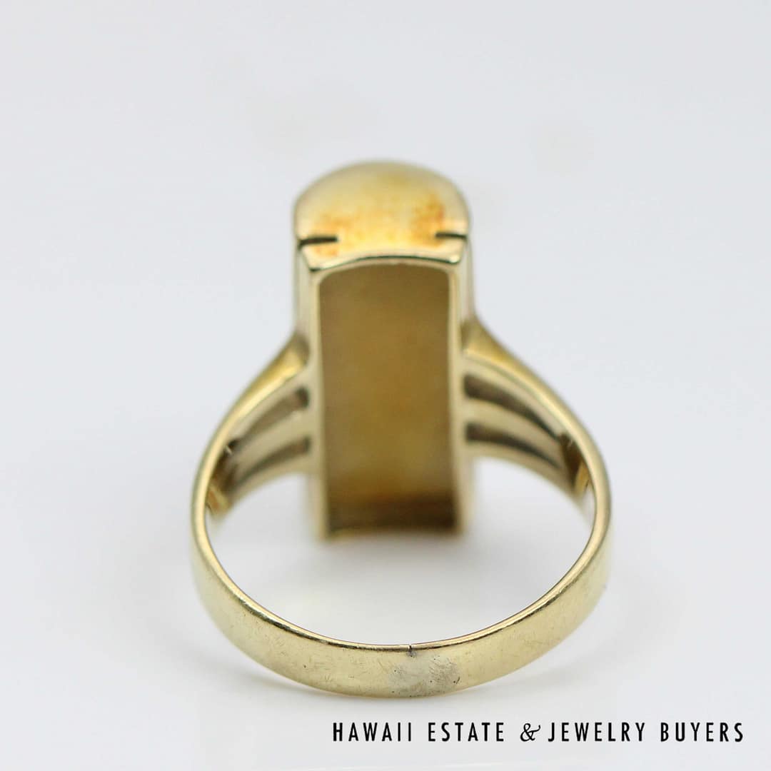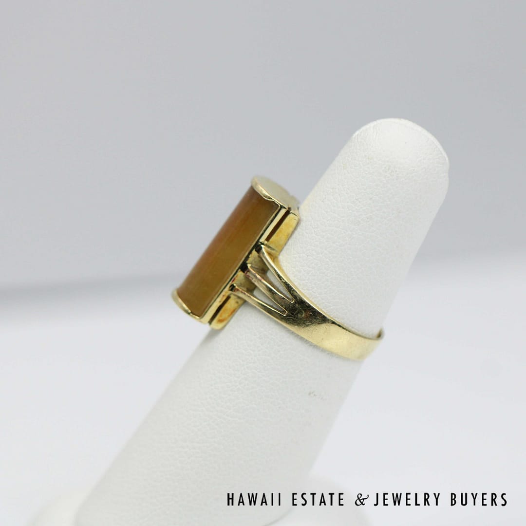 DescriptionVintage 14K yellow gold ring featuring a bold rectangular honey jade stone in a sleek modernist setting for a striking statement look.4.8g 14KYG HONEY JADE RING SIZE 6.25 (051024-08)$600.001 in stockHoney Jade 14K Yellow Gold Ring Size 6.25 quantityAdd to cartBuy withMake OfferSKU: 051024-08Category: Pre-owned Jade JewelryRelated StylesGIA 68.2g 14KYG MOTTLED GREEN & LIGHT PURPLISH GRAY TYPE A HINGED BANGLE BRACELET SIZE 7.5$8,000.00GIA 44g 14KYG MOTTLED GRAY AND ORANGY BROWN JADE WITH DRAGON MOTIF$6,700.00GIA 80g 14KYG MOTTLED ORANGY BROWN JADE HINGED BANGLE BRACELET SIZE 8$6,000.00GIA 4.2g 14KWG 13x10MM OVAL GREEN CABOCHON JADE 0.50ctw DIAMOND RING SIZE 5$3,100.00